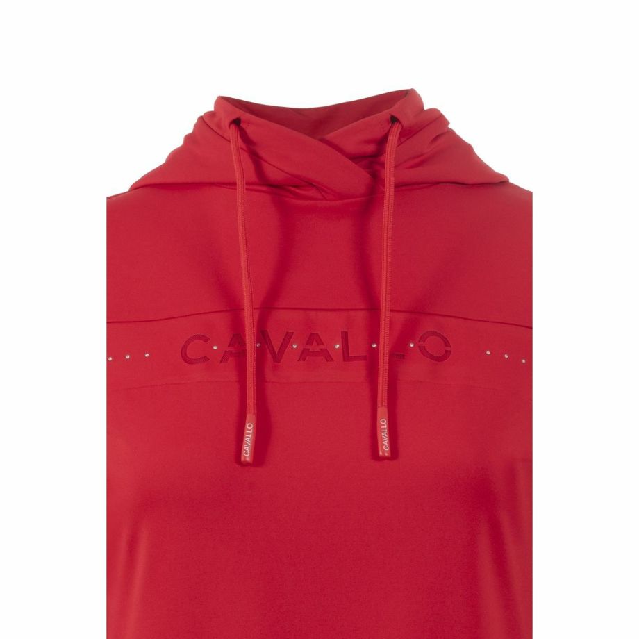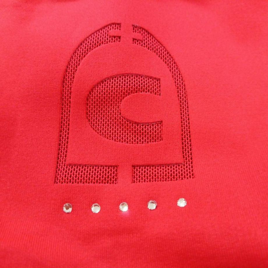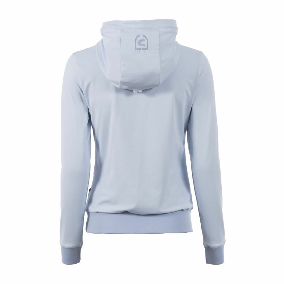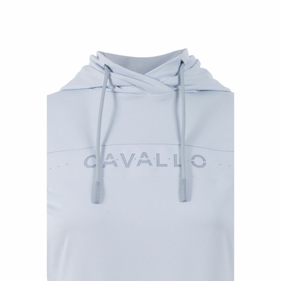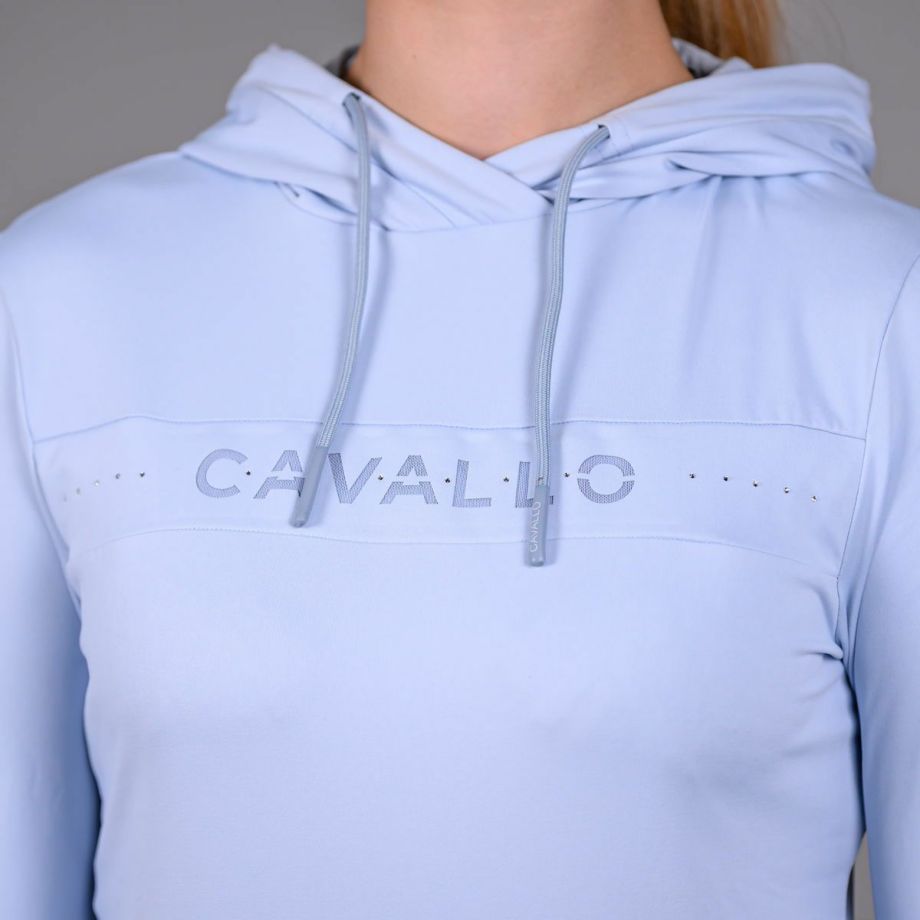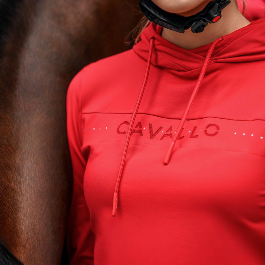 ・わずかに起毛された伸縮性のある機能性生地を使用し、快適な着心地を提供。・袖と裾に伸縮性のあるリブ生地を使用し、動きやすさを追求。・フードは後ろで留められ、ドローストリングでフードのフィット感を調節可能。・ネックラインにはクリスタルストーンで装飾されたCavalloレーザーカットアートワーク。・フード部分には、鐙モチーフのCavalloレーザーカットアートワーク。・レーザーカットアートワークは、透けないように同系色のメッシュと外生地で裏打ち。・汗をかいても蒸れにくい通気性。・汗の臭いを抑える防臭性と汗をかいてもすぐに乾き、ベタつき感を軽減する速乾性。・繰り返しの洗濯や激しい運動にも耐え、洗濯や日光による色落ちの心配がない丈夫な素材を採用。