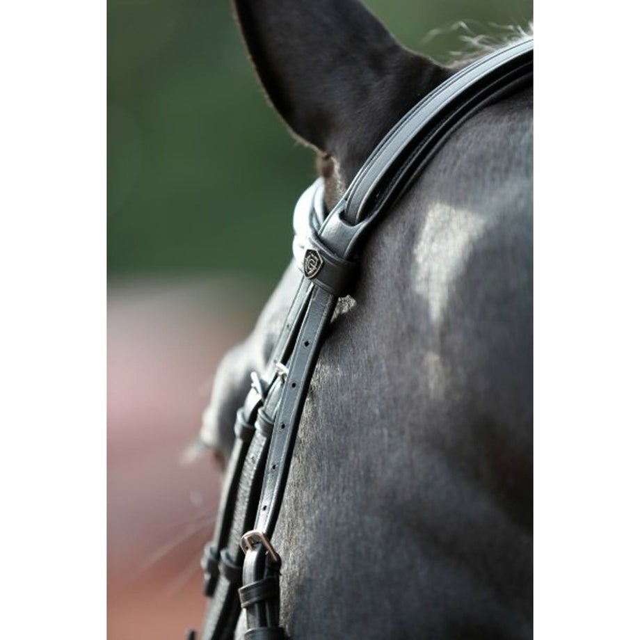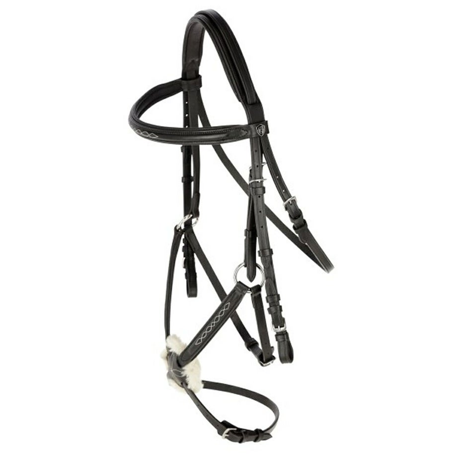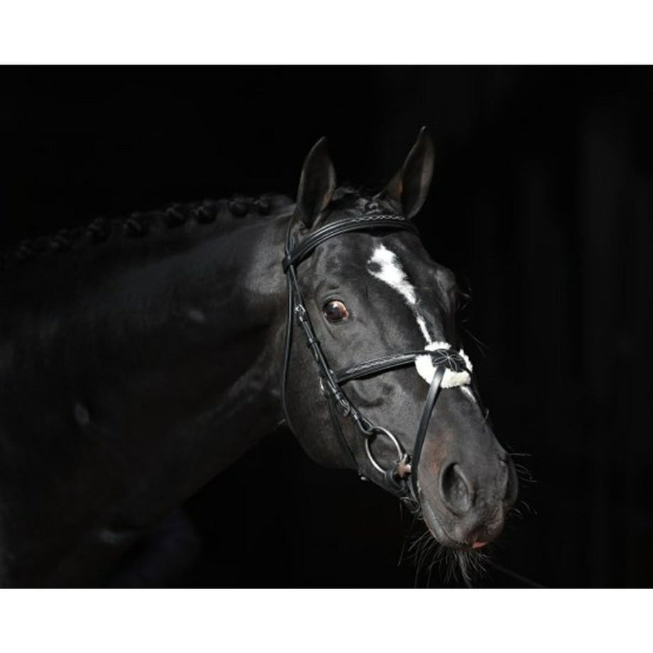 ・フェイクファーをあしらった乗馬用馬具の手綱付きクロス鼻革頭絡。・馬への当たりをソフトにする質感のよいフェイクファーを交差部分にほどこしました。・装飾的なステッチがさりげないアクセント。・しなやかな本革を選んで仕立てた頭絡に布手綱がついています。