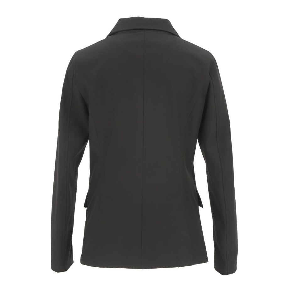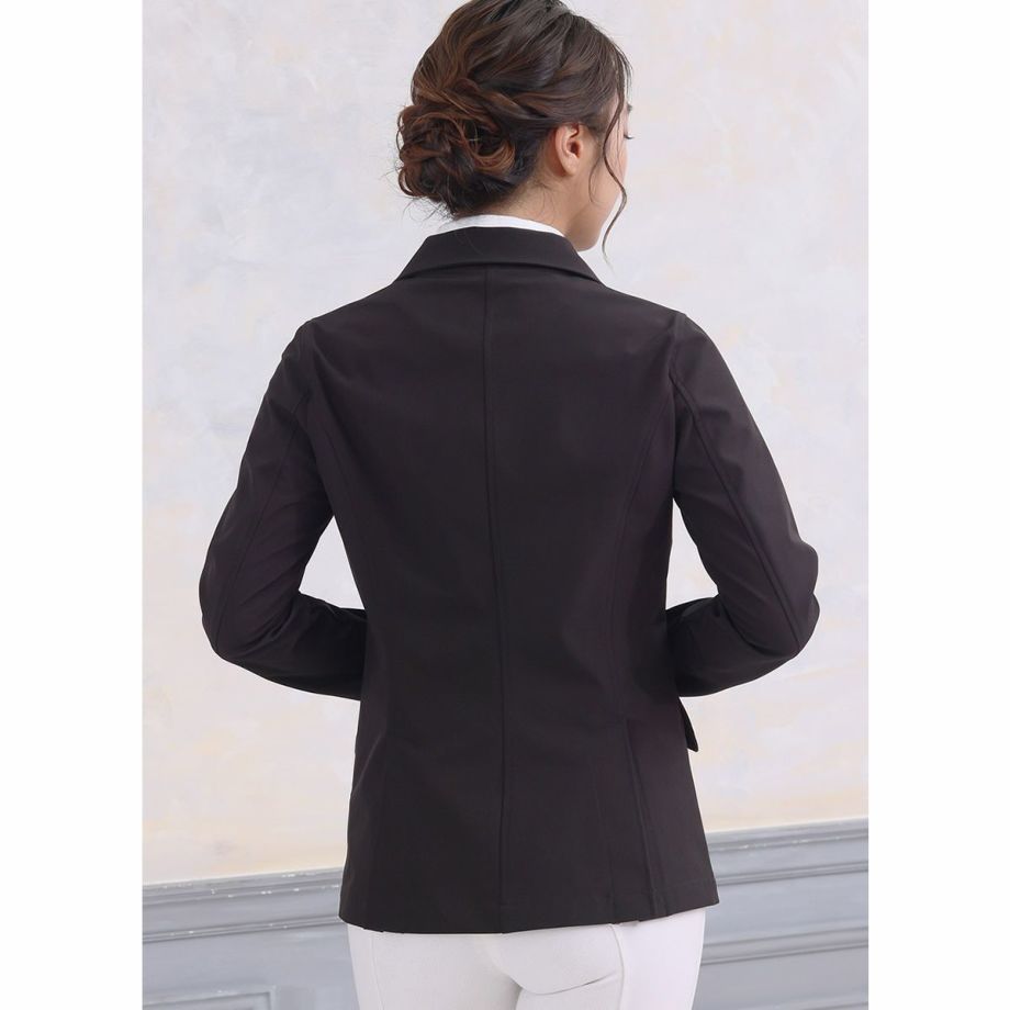 【ショージャケット】・高機能で人気が高いソフトシェル素材の乗馬用ショージャケット。・ストレッチ性があり、フィット感がいいのはもちろん、UPF50+、撥水機能なども備え、あらゆる天候下での騎乗にマッチします。・ムダをそぎ落としたシンプルなジャケットは、動きやすさと美しくクラシックなシルエットにこだわっています。・幅広いサイズ展開なのでピッタリのサイズをお選びいただけます。・ポケット:フロント2ヶ所。・袖口にボタンがないタイプなのでボタンの干渉や落下の心配がありません。・動きやすさを追求肩口から袖が前方に流れているデザインを採用し、騎乗時の腕・肩周りの窮屈さを軽減しました。縦にも横にも伸びる2WAYストレッチは、動きやすくてフィット感抜群です。・オールシーズン快適な着心地このアイテムのために開発された独自の高機能ソフトシェルファブリックを採用。雨や雪の日には撥水、寒い冬でも防風で体温を保持、暑い夏でも通気性を確保するオールシーズン対応。・撥水機能多少の雨や雪なら気にせず騎乗できます。・透湿湿気を外に逃がす生地なので汗をかいても快適。・防風防風効果のある生地だから、冬場の騎乗でもしっかり保温されます。・防汚、防花粉汚れにくい生地でメンテナンスもカンタンです。ご家庭での洗濯もOK。花粉もつきにくいので花粉症の方にもおすすめ。・UVカットUPF50+の紫外線ガード機能。馬場の日差しから肌を守ります。・騎乗に最適化されたシルエット生地の特性を考慮して熟練パタンナーがデザインしたショージャケットは、姿勢の美しさと動きやすさを両立しました。・素材へのこだわり使用する素材は国内の専門機関で百貨店並みの厳しい試験に合格したものを採用しました。※フロントの合わせは、レディースサイズは右前(ボタン4つ)、ジュニアサイズは左前(ボタン3つ)です。【ジャケットキャリーバッグ】・ジャケットから丈の長い燕尾服まで収納できるガーメントバッグ。・三つ折りなのでコンパクト。試合場への持ち運びも楽々。・表側の丈夫なポリエステルが衣類を保護。裏側の不織布は通気性抜群で湿気を逃がします。・2層構造の生地が大事な衣類を最適な状態に保ちます。持ち運びにも、保管にも。マルチに使える便利バッグ。・専用ハンガー付き。