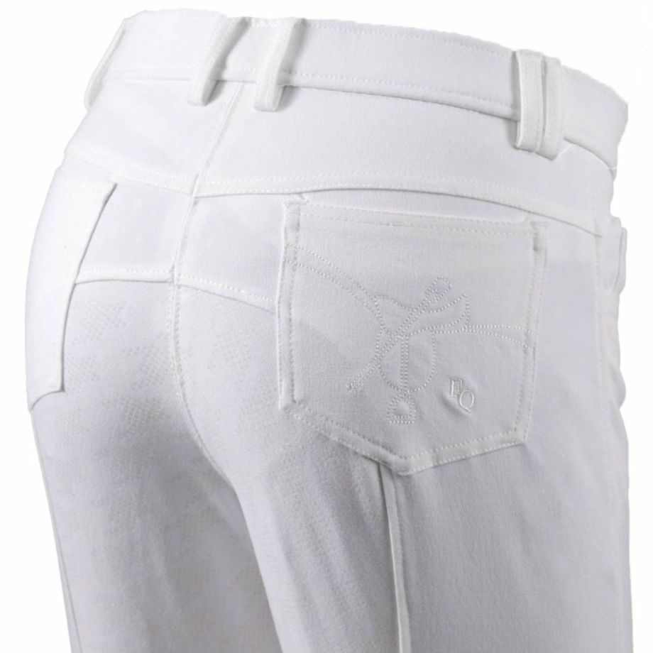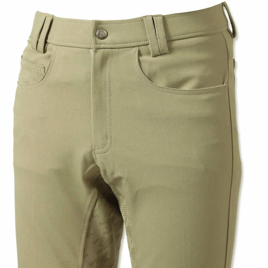 しっかりした丈夫な生地なのに伸びがよく、身体にフィットして動きやすいとユーザーから高く評価されているベストセラーのオールシーズンキュロット。コインポケットやバックポケットのステッチなどデニムっぽさを取り入れながらカジュアルすぎずシンプルで落ち着いた雰囲気。バックポケットステッチはよく見ると馬の背に乗った鞍のデザイン。さりげないこだわりです。薄すぎず厚すぎず、オールシーズン着まわせる使いやすさ。ビギナー・ベテランを問わず1着は持っていたいアイテムです。・人気のシリコングリップを採用従来の合皮タイプに比べ、グリップ力が大幅に向上し、ごわつきがなく、伸びやすく、通気性や吸汗性も高いシリコンタイプは、段違いの使いやすさと履き心地。今まで合皮だった部分が通気性の良い生地になったので、涼しさも大幅にUPしました。シリコンプリントは英国伝統のハウンドトゥース柄。エレガントでクラシックな印象のデザインです。シリコンはグリップが効きすぎると逆に使いにくくなることもあります。本製品では様々なシリコン形状をテストして、ちょうど良いグリップに調整しました。・日本人の騎乗姿勢にあったデザイン熟練デザイナーとパタンナーが、生地の特性を考慮して型紙からデザインしたキュロットは、姿勢の美しさと動きやすさを両立しました。ウエストのフロントが浅くバックが深いデザインは、騎乗時の座り込んだ姿勢でウエストをきっちりカバー。股部分を工夫してまたがりやすく、ひざ部分にゆとりをもたせ曲げやすくし、騎乗のしやすさを追及したシルエットに仕上がっています。・高い縫製技術を活かしたフィット感生産はヨーロッパ向けキュロットを手がけるメーカーが協力。長年培われた技術が活かされた縫製は耐久性とフィット感が抜群です。・素材へのこだわり生地やボタンなど全ての素材にこだわりました。ボタンは騎乗に適したものをドイツから取り寄せ。生地は国内の専門機関による厳しい試験に合格したものを採用しています。・足首周りはストレッチ素材で快適足首周りにストレッチ素材を採用。ふくらはぎまでストレッチ素材を伸ばすことで抜群のフィット感と快適な履き心地を実現しました。※フロントボタンはレディースサイズは右前、ジュニアサイズは左前となります。