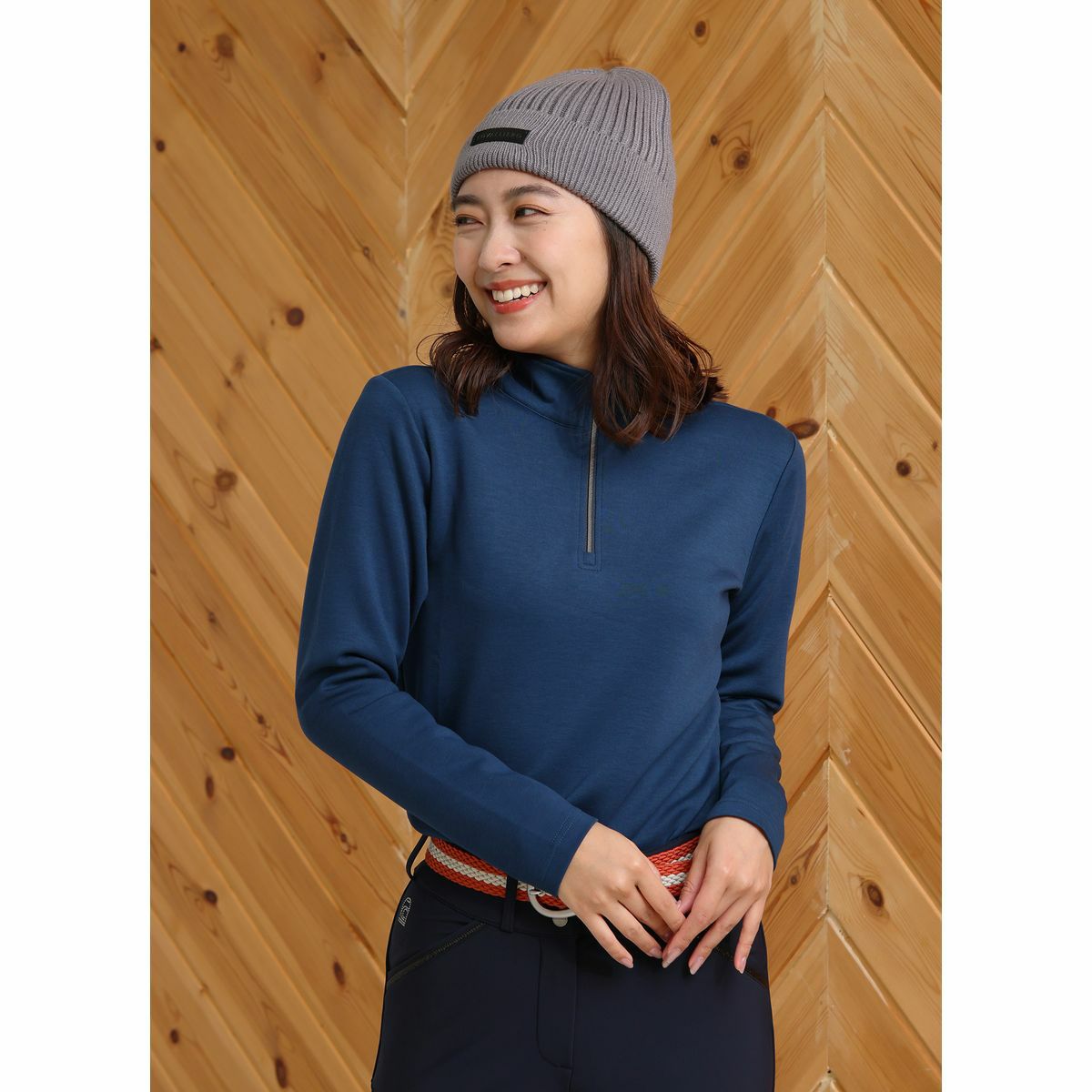 ・程よくフィットするハイネックのデザインが、首元への冷気の侵入を軽減し、顔周りをすっきりと見せます。