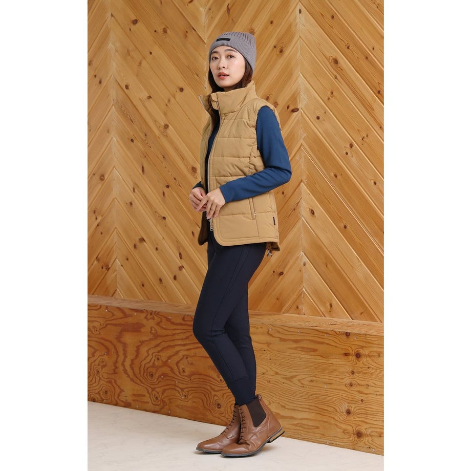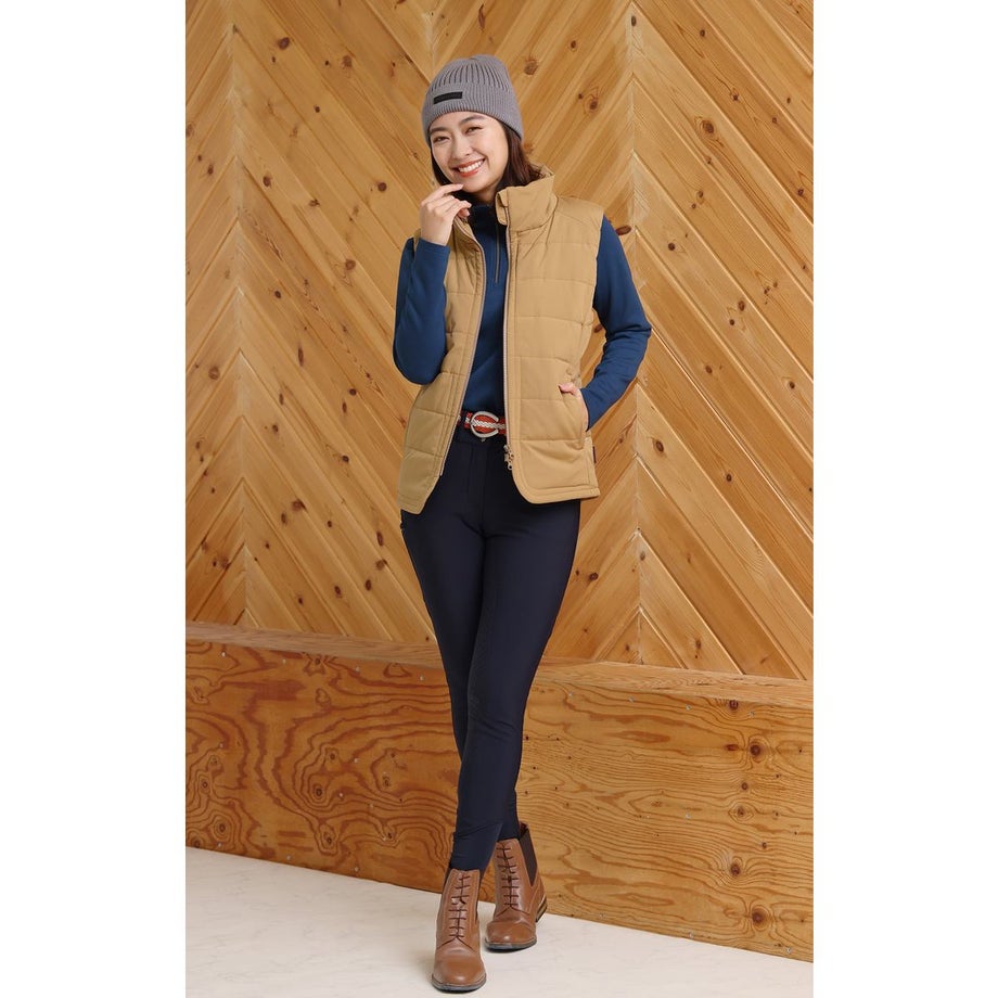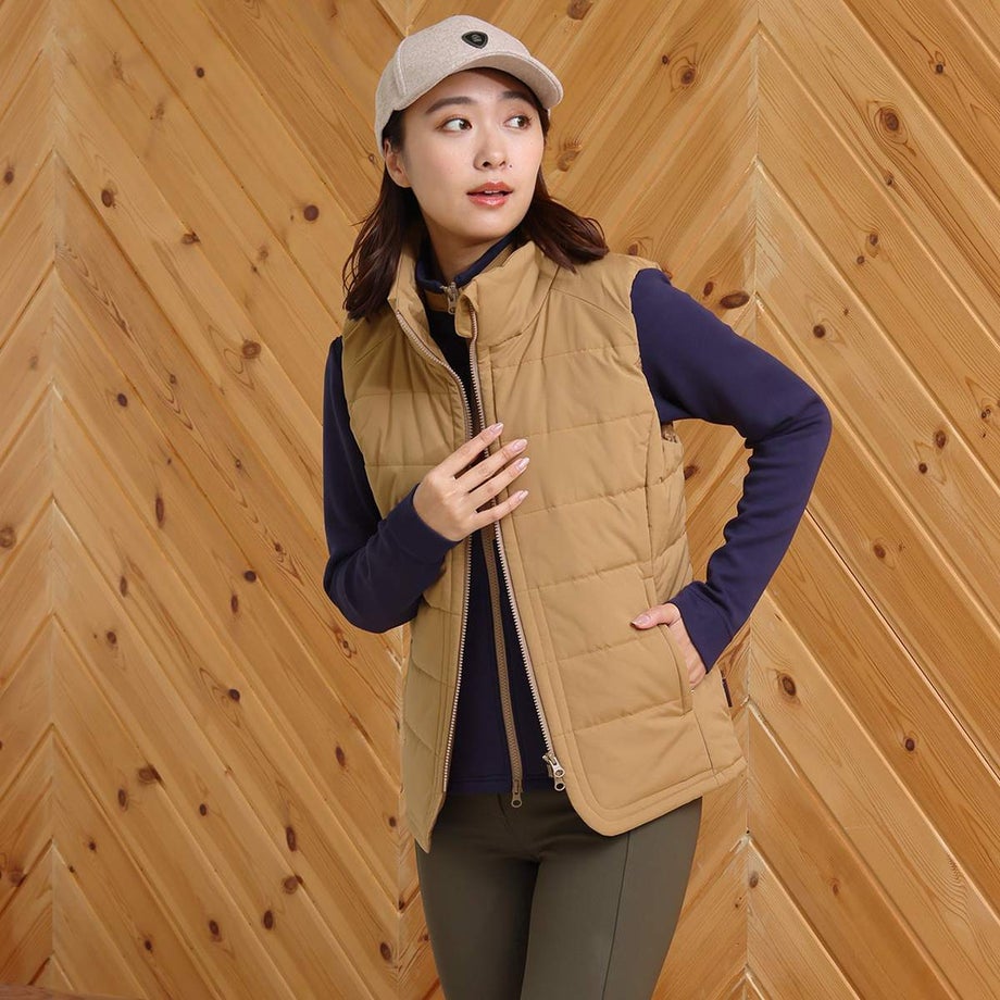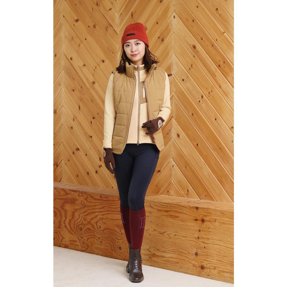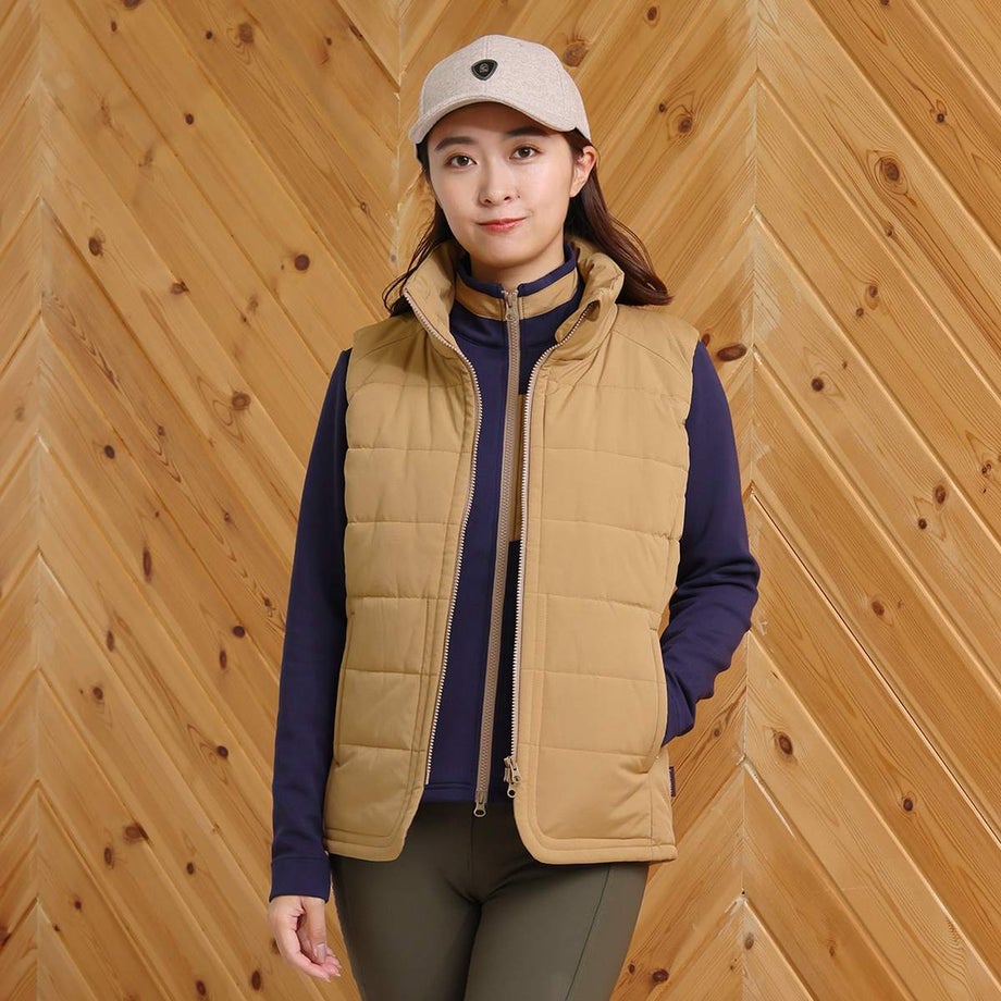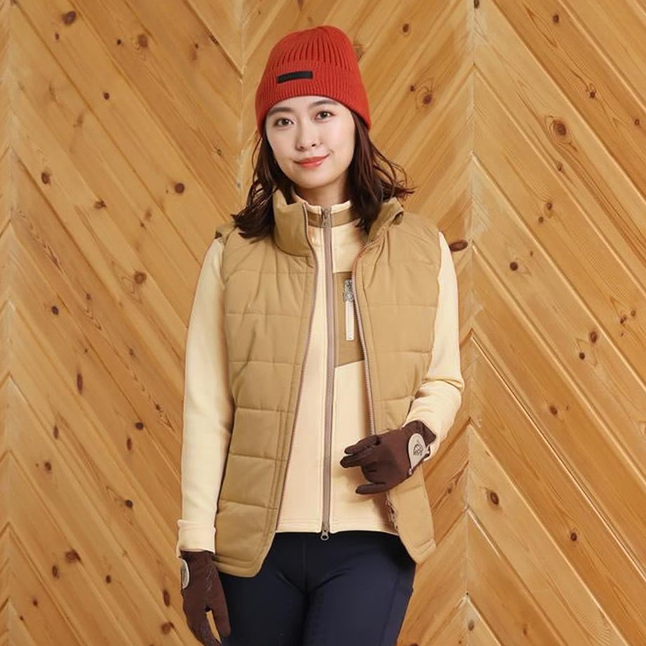 「中綿入りなのに、驚くほどスマート」3シーズン、着ぶくれ知らずで美しく。計算し尽くされた絶妙ボリューム。■ 「3シーズン」フル活用。季節をまたぐ、計算されたボリューム感。春・秋・冬と、長い期間使い倒せるベストを目指しました。 肌寒い時期には主役として、真冬にはインナーとして。 「薄すぎず、厚すぎない」。 中綿入りでありながら、季節を選ばないこの「絶妙な厚み」こそが、このベストが1年を通して重宝される最大の理由です。■ 「中綿=太って見える」を、緻密な設計で解決。中綿特有の温かさを保ちながら、着ぶくれを最小限に抑えるため、綿の量をパーツごとに細かく調整しました。薄手でスリムな設計にこだわり抜いたことで、ジャケットの中に着込んでも、外からのシルエットは驚くほどスマート。「暖かいのに、着痩せして見える」。そんな理想のバランスを、緻密なステッチデザインとあわせて実現しました。■ 顔周りを凛と見せる「三日月台衿(みかづきだいえり)」首元には、衿の形を立体的にキープする「三日月台衿」を採用。美しい立ち上がり:衿の土台にカーブをつけることで、ジップを開けても閉めても形が崩れず、顔周りをスッキリ見せます。柔らかな肌触り:衿端を「中縫い仕立て」にすることで、首への当たりを優しく。防寒性を高めつつ、上質な着心地を叶えます。■ 乗馬ブランドならではの、機能美と動きやすさ。「アクティブに動けて、かつ美しい」ことが、開発時のこだわりです。可動域の確保:アームホールを低めに設計。厚手のトップスの上からでも脇がもたつかず、腕の上げ下げもストレスフリー。タフなスペック:撥水・防風・防汚加工を施したリップストップ生地。汚れを気にせず、デイリーから乗馬シーンまでタフに使い回せます。・撥水 多少の雨や雪なら騎乗できます。・防風 冷気を遮断し、暖かさをキープ。・防汚 汚れが付きにくく、落ちやすい。洗練されたライン:前裾は角を落とした曲線ラインで女性らしく。座った時もお腹周りがもたつかず、美しいシルエットを保てます。後ろ身頃は長めの設計で、気になる腰回りをしっかりカバーします。