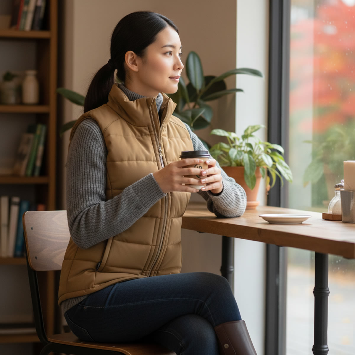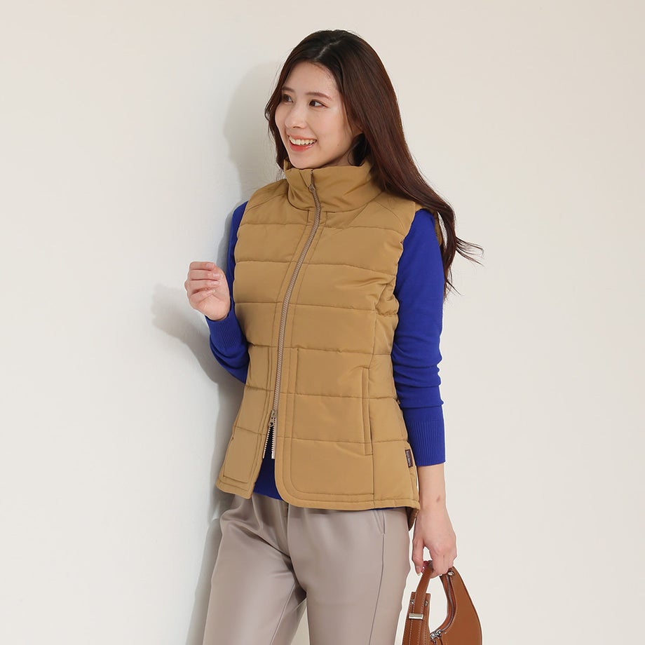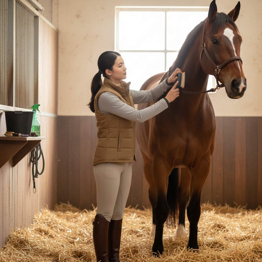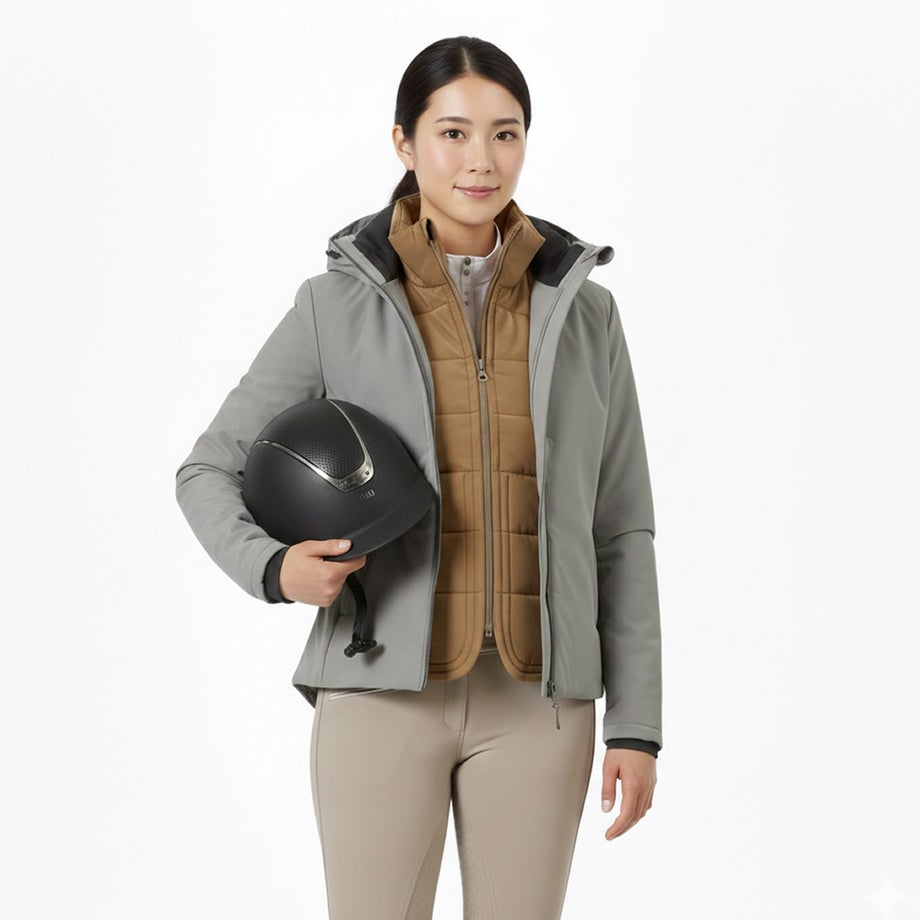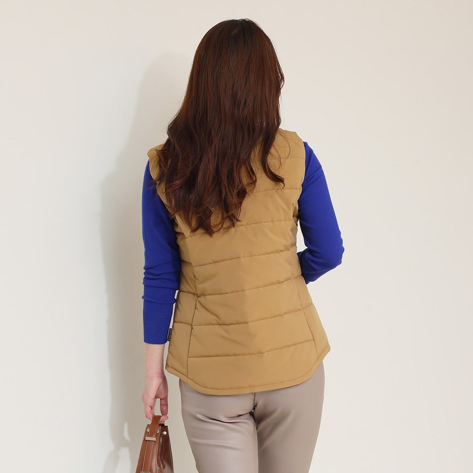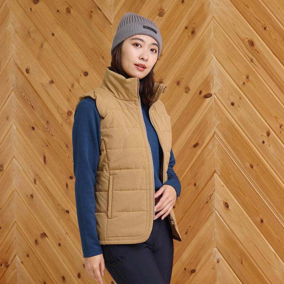 「中綿入りなのに、驚くほどスマート」3シーズン、着ぶくれ知らずで美しく。計算し尽くされた絶妙ボリューム。■ 「3シーズン」フル活用。季節をまたぐ、計算されたボリューム感。春・秋・冬と、長い期間使い倒せるベストを目指しました。 肌寒い時期には主役として、真冬にはインナーとして。 「薄すぎず、厚すぎない」。 中綿入りでありながら、季節を選ばないこの「絶妙な厚み」こそが、このベストが1年を通して重宝される最大の理由です。■ 「中綿=太って見える」を、緻密な設計で解決。中綿特有の温かさを保ちながら、着ぶくれを最小限に抑えるため、綿の量をパーツごとに細かく調整しました。薄手でスリムな設計にこだわり抜いたことで、ジャケットの中に着込んでも、外からのシルエットは驚くほどスマート。「暖かいのに、着痩せして見える」。そんな理想のバランスを、緻密なステッチデザインとあわせて実現しました。■ 顔周りを凛と見せる「三日月台衿(みかづきだいえり)」首元には、衿の形を立体的にキープする「三日月台衿」を採用。美しい立ち上がり:衿の土台にカーブをつけることで、ジップを開けても閉めても形が崩れず、顔周りをスッキリ見せます。柔らかな肌触り:衿端を「中縫い仕立て」にすることで、首への当たりを優しく。防寒性を高めつつ、上質な着心地を叶えます。■ 乗馬ブランドならではの、機能美と動きやすさ。「アクティブに動けて、かつ美しい」ことが、開発時のこだわりです。可動域の確保:アームホールを低めに設計。厚手のトップスの上からでも脇がもたつかず、腕の上げ下げもストレスフリー。タフなスペック:撥水・防風・防汚加工を施したリップストップ生地。汚れを気にせず、デイリーから乗馬シーンまでタフに使い回せます。・撥水 多少の雨や雪なら騎乗できます。・防風 冷気を遮断し、暖かさをキープ。・防汚 汚れが付きにくく、落ちやすい。洗練されたライン:前裾は角を落とした曲線ラインで女性らしく。座った時もお腹周りがもたつかず、美しいシルエットを保てます。後ろ身頃は長めの設計で、気になる腰回りをしっかりカバーします。