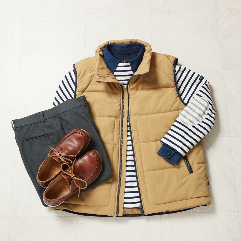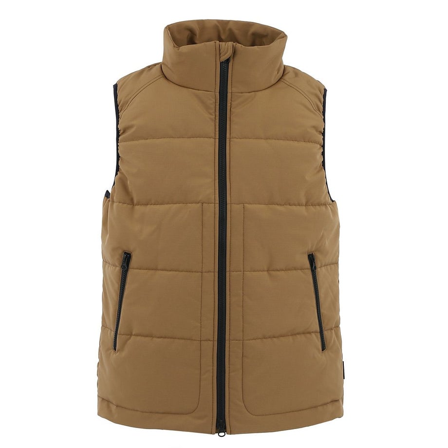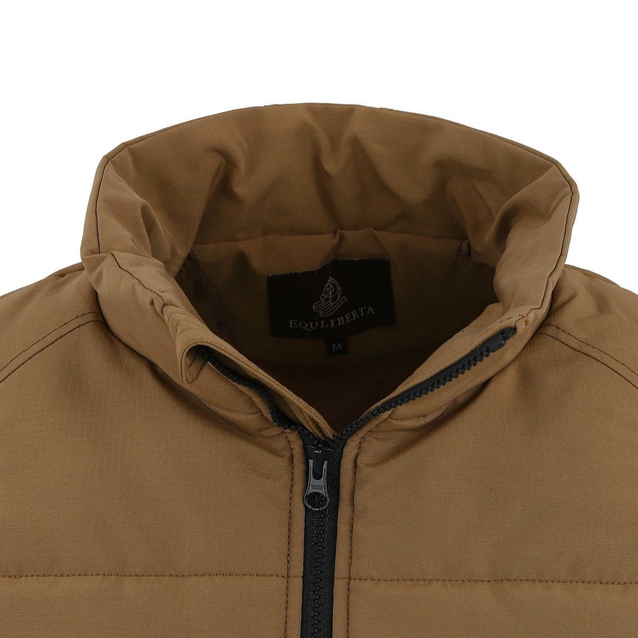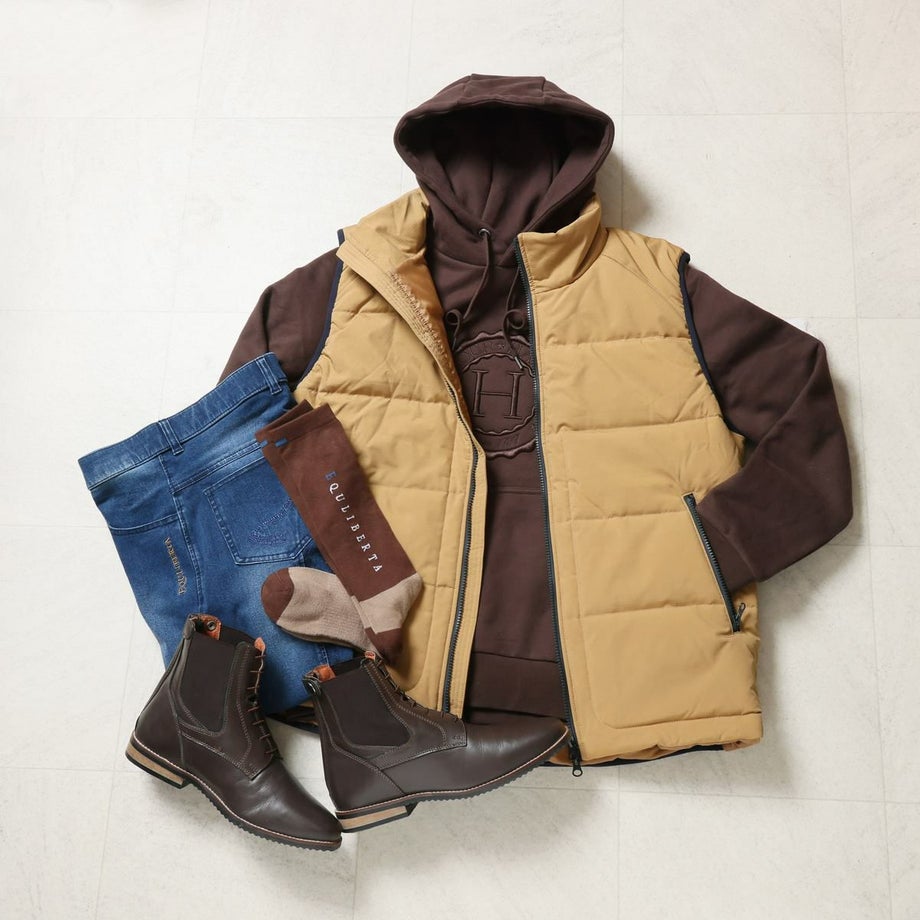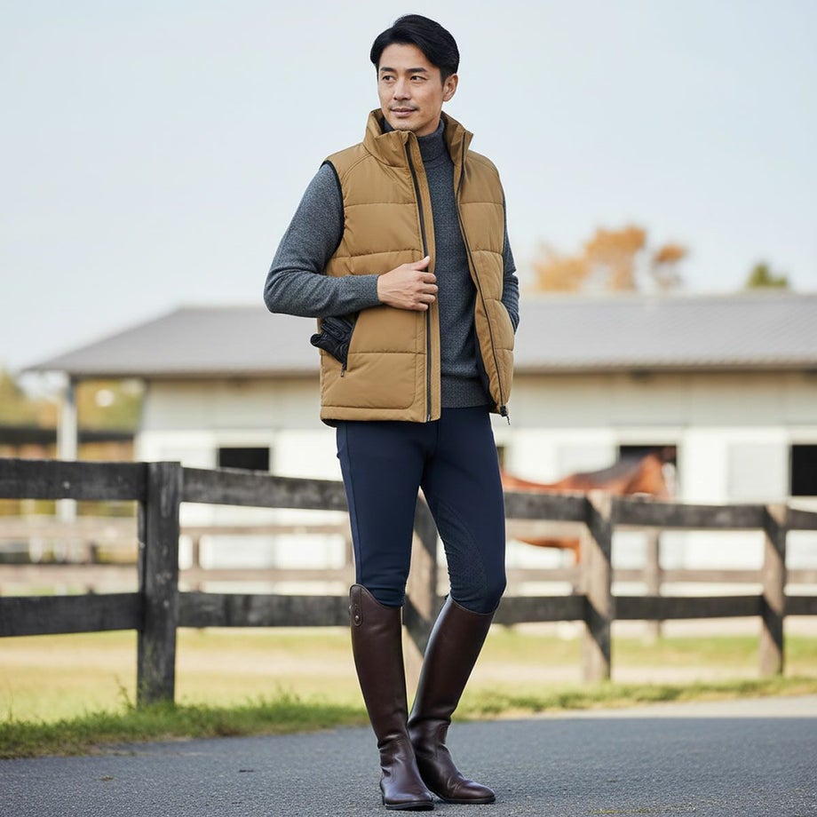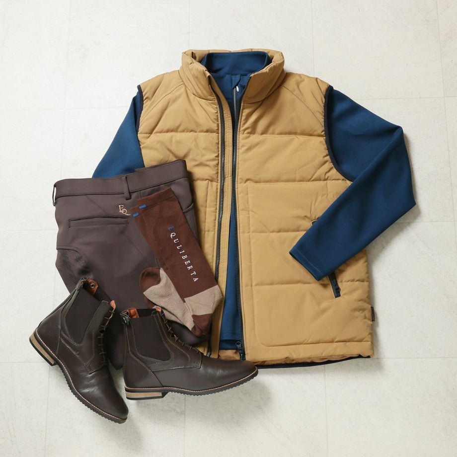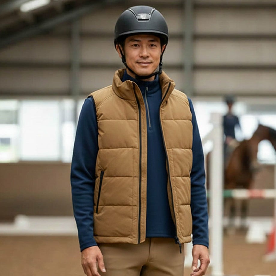 ・EQULIBERTAメンズライン初となるベストです。・3シーズン着用可能な中綿ベストです。・素材はタフで機能的なポリエステルリップストップを使用しています。・薄手でスリムな設計により、重ね着しても着ぶくれせず、すっきりとした印象に見せます。・シンプルで使いやすいデザインが特徴です。・メンズモデルは、ファスナーを配色にし、メンズらしいアクセントを加えています。・スタンドカラー(立ち襟)が高く、首元までしっかりカバーし防寒性を高めます。・急な雨にも安心な撥水加工で、水濡れを防ぎます。・風を通しにくい防風機能で、冷たい外気をシャットアウトします。・汚れがつきにくい防汚性も備え、お手入れが簡単です。・フロントポケットはファスナー付きで、貴重品などの落下を防ぎます。・内ポケット付きで、収納に便利です(メンズのみの仕様です)。・マルチに使え、季節感を高めるアイテムです。・乗馬シーンでの動きやすさはもちろん、タウンユースのオーバーサイズウェアの上にも合わせられるよう、鎌底(アームホール下部)を下げる工夫を施しています。・着回し力が非常に高く、ポロシャツ、パーカー、ニットなど多様なインナーに対応します。・丈夫で保温性も高い一品です。・マットな質感で、どんなコーディネートにも合う万能カラーです。・前身頃のステッチデザインがポイントです。・暖かさ、動きやすさ、ボリューム感にこだわり、中綿の量を試行を重ねて調整しています。・後裾の配色ストレッチバインダー使いが、デザイン性とピタッとフィットする機能性を兼ねています。・後ろ身頃が長めのデザインです。・衿がきれいに立つように、後ろ衿に切替を入れる工夫をしています。・衿端は中縫い仕立てで、柔らかく仕上がっています。