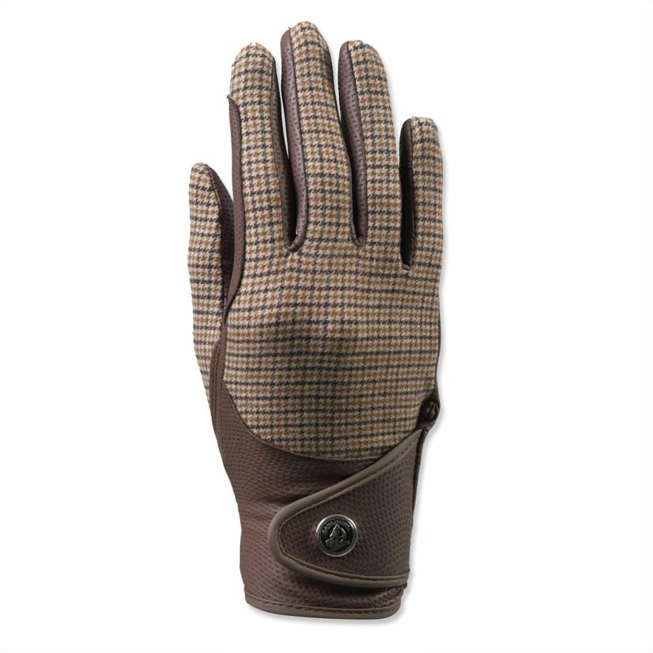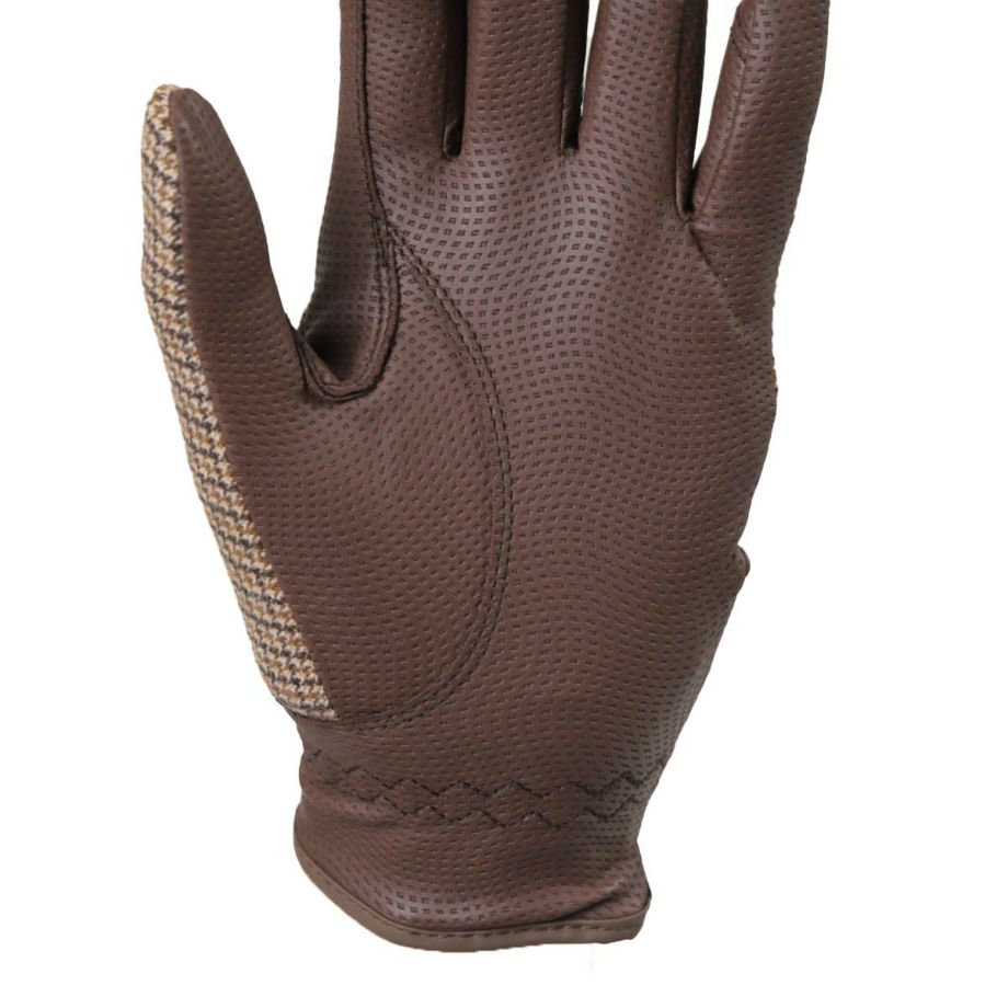 ・フィット感にすぐれた乗馬用の合皮グローブ。・クラシカルなガンクラブチェックのストレッチ素材をセレクト。・雰囲気のある英国調のスタイル。・すべりにくく伸縮性が高い合皮を手の平や指の間に使用しています。・手綱を握る人差し指や小指まわりには補強があります。・フィット感や通気性など騎乗時の快適さにこだわった設計です。・生地が絡みにくいマジックテープを採用。・エレガントに手元を演出してくれるグローブは乗馬はもちろん、普段使いもしたくなります。