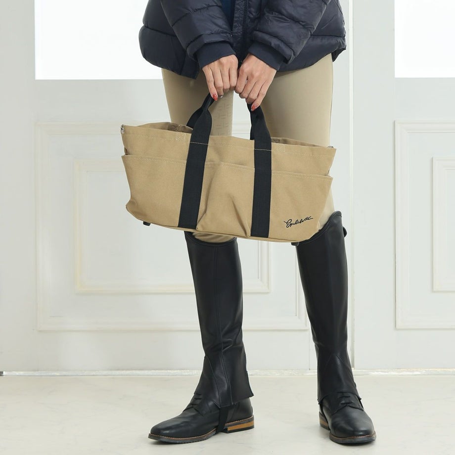 ・手提げバッグ、ショルダーバッグ、吊り下げバッグの3WAYで使える便利なグルーミングバッグ。・バッグ内にあるワンタッチベルトを使用し、バーなどにかけ吊り下げバッグとして使用可能。・お手入れの際、バッグ内にあるワンタッチベルトを使用して洗い場のバーにかけることが可能。・ベビーカーにもワンタッチベルトを使用して取り付け可能。(ベビーカーに取り付ける際は収納重量にご注意ください)・着脱可能なショルダーベルト付きなので、肩から下げることもできます。・バッグの底はラウンド型になっており、バッグの底を保護する底鋲があります。・口が広く開くタイプなので中身が見やすく、出し入れがスムーズ。・外側に3つのポケットがついています。・上部は巾着タイプになっており、中身が落ちる心配もなく雨や埃も入りません。・撥水キャンバス地なので、少し水に濡れる程度であれば大丈夫です。