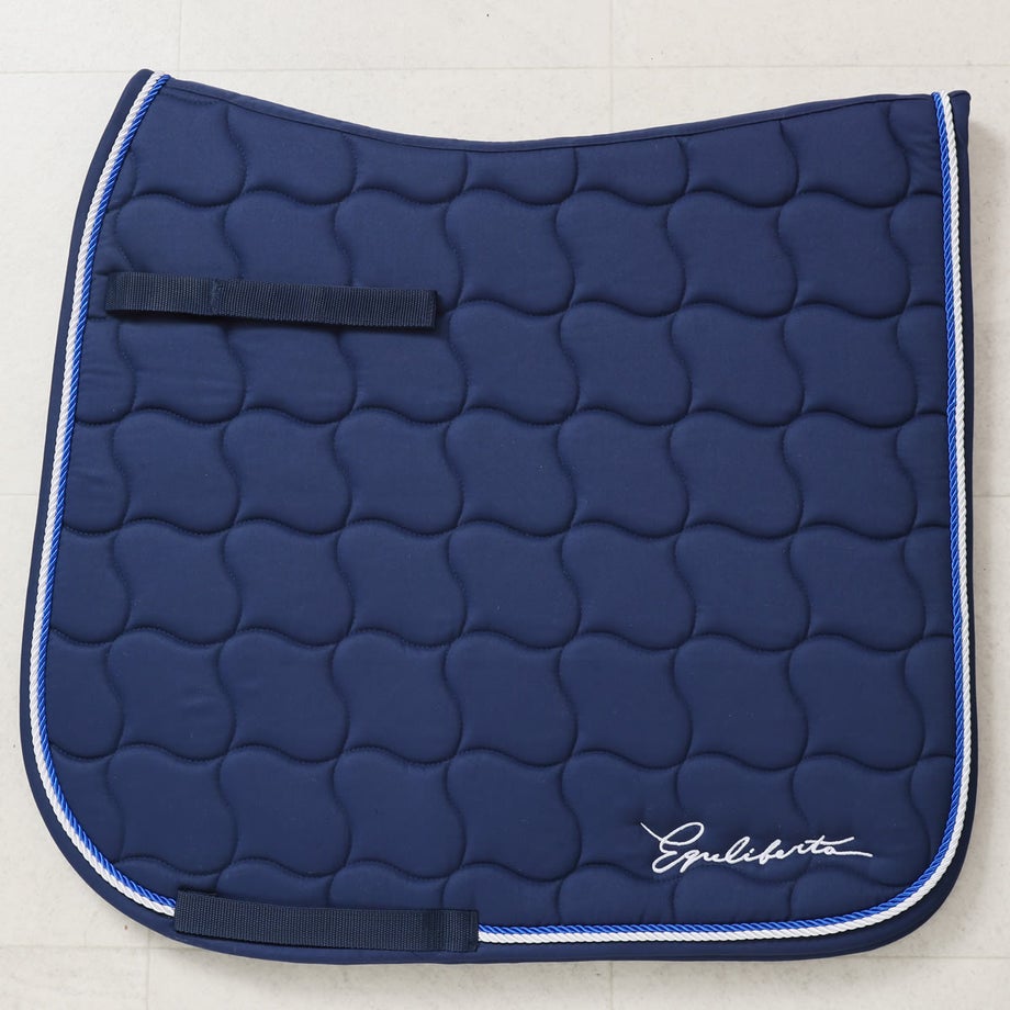 ・上品さが際立つ、クラシックなキルティングデザイン。・馬体にやさしくフィットし、クッション性に優れた快適な乗り心地。・ネイビー×ホワイトのブレードパイピングが、洗練された印象を演出。・同系色のイヤーネットや馬具とのコーディネートも可能。・さりげないロゴ刺繍入りと、シンプルな無地タイプからお選びいただけます。