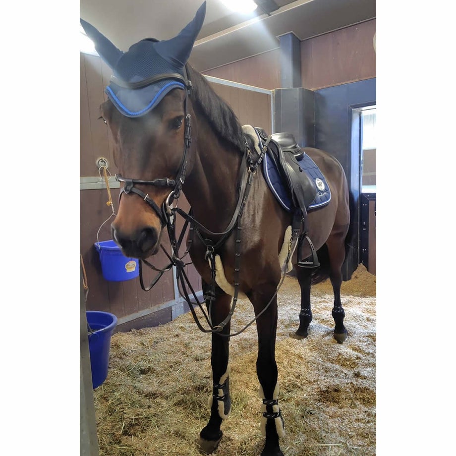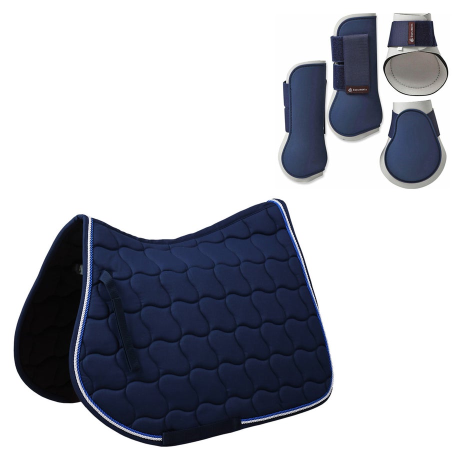 【サドルパッド】・上品さが際立つ、クラシックなキルティングデザイン。・馬体にやさしくフィットし、クッション性に優れた快適な乗り心地。・ネイビー×ホワイトのブレードパイピングが、洗練された印象を演出。・同系色のイヤーネットや馬具とのコーディネートも可能。・さりげないロゴ刺繍入りと、シンプルな無地タイプからお選びいただけます。【プロテクター】・練習用から試合用まで幅広く使えるコスパの高い定番プロテクターの登場です。・内側は厚手で弾力の高いネオプレン、外側はプラスチックのように硬いTPUで繊細な馬の脚をしっかり保護します。・強力なダブルベルクロでしっかり装着できるので、障害飛越などの激しい動きでもずれずに固定。・丈夫な素材で丸ごと水洗いできるのも嬉しいポイント。泥馬場でも気にせず使えます。