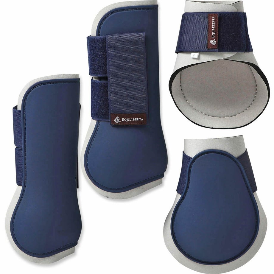 【短鞭】・光沢のあるグリップエンドにブランドロゴデザインが高級感のある短鞭。・「EQULIBERTA」のエンボス加工が施されたグリップもプレミアムな雰囲気。・同デザインで長鞭もあります。・グリップにストラップホールがあるのでチャームやキーホルダーが取り付けられます。・チャームやキーホルダーなどを取り付けると目印になって、よくあるムチの取り間違え防止にも。・JODHPURS ムチ用リストバンドも取り付けしやすい。【サドルパッド】・上品さが際立つ、クラシックなキルティングデザイン。・馬体にやさしくフィットし、クッション性に優れた快適な乗り心地。・ネイビー×ホワイトのブレードパイピングが、洗練された印象を演出。・同系色のイヤーネットや馬具とのコーディネートも可能。・さりげないロゴ刺繍入りと、シンプルな無地タイプからお選びいただけます。【イヤーネット】・馬の耳を虫や騒音から守る、実用性とデザイン性を兼ね備えたイヤーネット。・通気性の良いメッシュ素材で、暑い季節でも快適な着け心地。・耳部分はやわらかくフィットし、違和感を与えにくい設計。・ネイビーの落ち着いたカラーに、上品なコードトリミングがアクセント。・普段使いだけでなく競技会にも映える、シンプルかつ洗練されたスタイル。【プロテクター】・練習用から試合用まで幅広く使えるコスパの高い定番プロテクターの登場です。・内側は厚手で弾力の高いネオプレン、外側はプラスチックのように硬いTPUで繊細な馬の脚をしっかり保護します。・強力なダブルベルクロでしっかり装着できるので、障害飛越などの激しい動きでもずれずに固定。・丈夫な素材で丸ごと水洗いできるのも嬉しいポイント。泥馬場でも気にせず使えます。