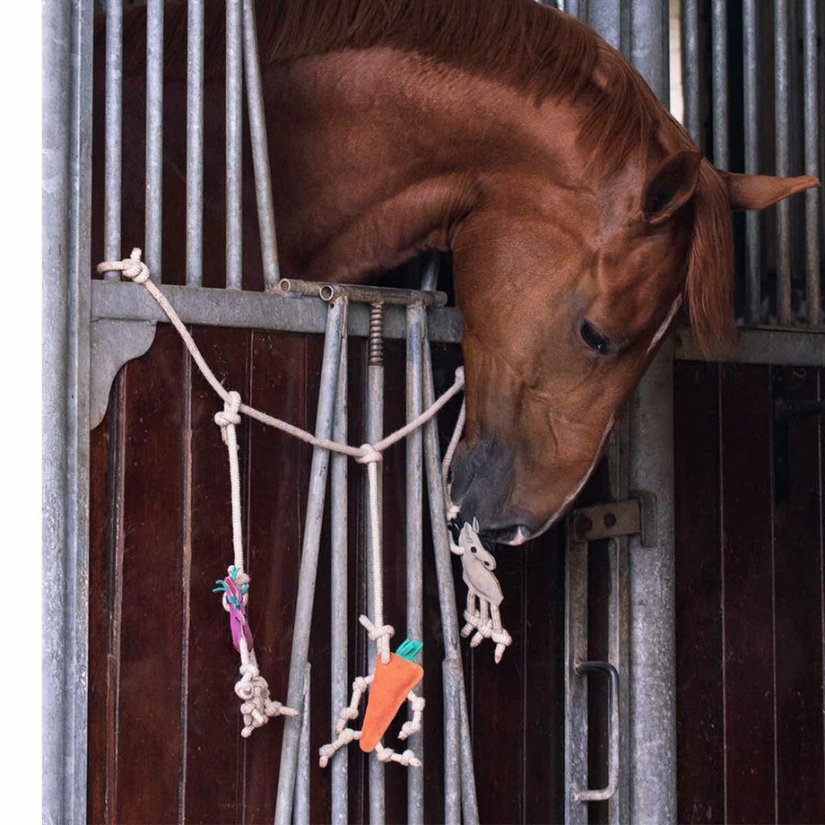 ・厩舎などで馬が遊べる、ナチュラルな素材でできたホーストイ。・ユニコーンや馬、にんじんの3つのモチーフが目を引くデザイン。・ユラユラと揺れる紐付きです。・しっかりとしたつくりで耐久性があります。・厩舎の柵などに紐で固定できます。・天然由来の素材で作った、馬に優しいおもちゃです。