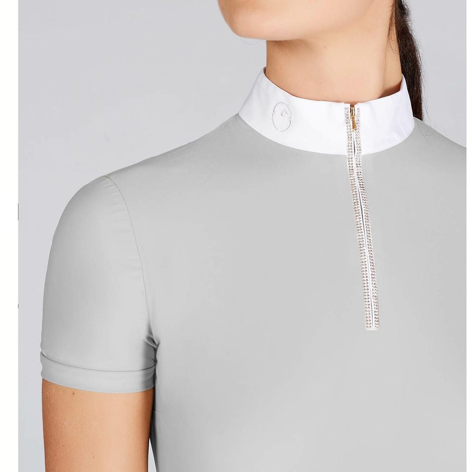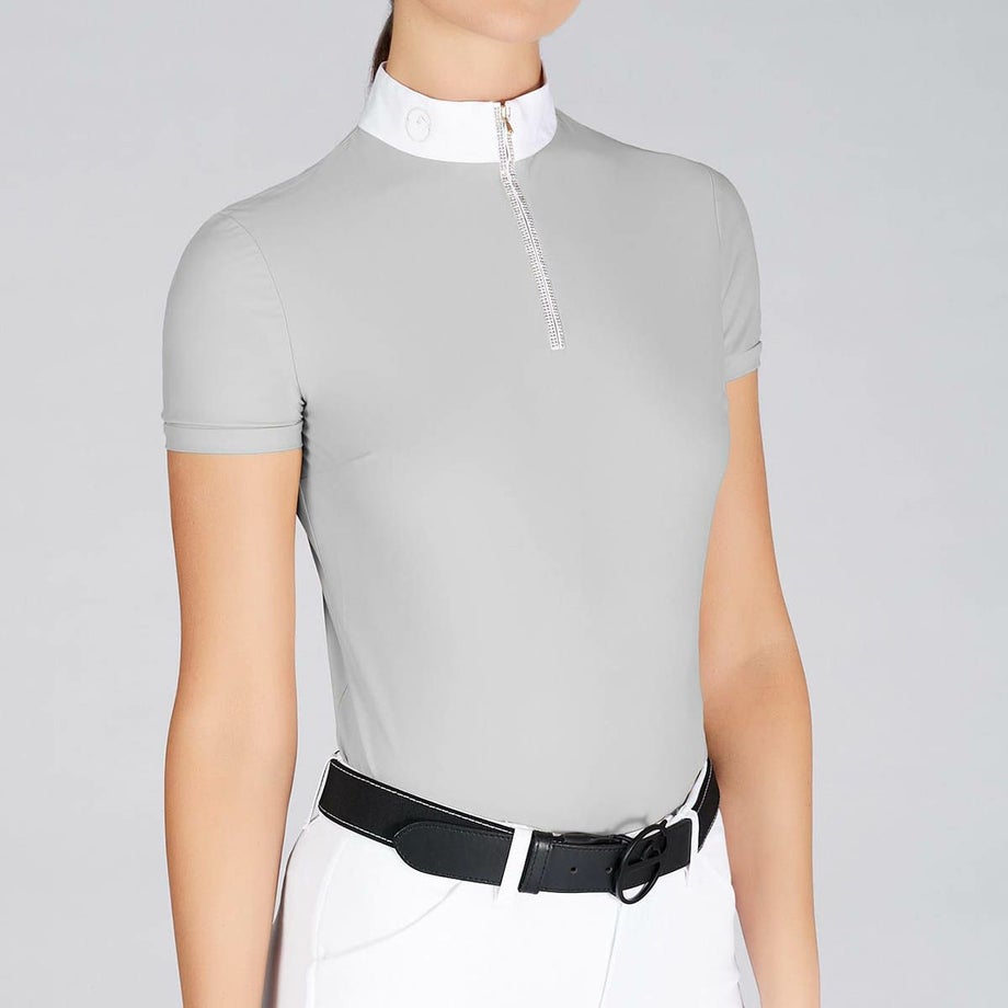 ・ハイグレードの機能性素材で仕立てた軽やかな乗馬用のプレミアムショーシャツ。・襟元のロゴ刺繍や洗練されたスタッズ使いで格調高く仕上げました。・とても軽く、伸縮性バツグンの素材はストレスフリーの着用感。・通気性、速乾性を備え、快適さが長続きします。・ウエストシェイプですっきりとしたシルエットに見せてくれます。・襟元にジップをあしらい、着脱をスムーズにサポートします。・ノーブルな印象を与えるライトグレー。■シーズン品入荷数が少なく再販はありませんのでお早めのご注文をお勧めします。人気商品はすぐに完売となりますので、新商品をいち早くご案内している当店メールマガジンやLINEをご活用ください。