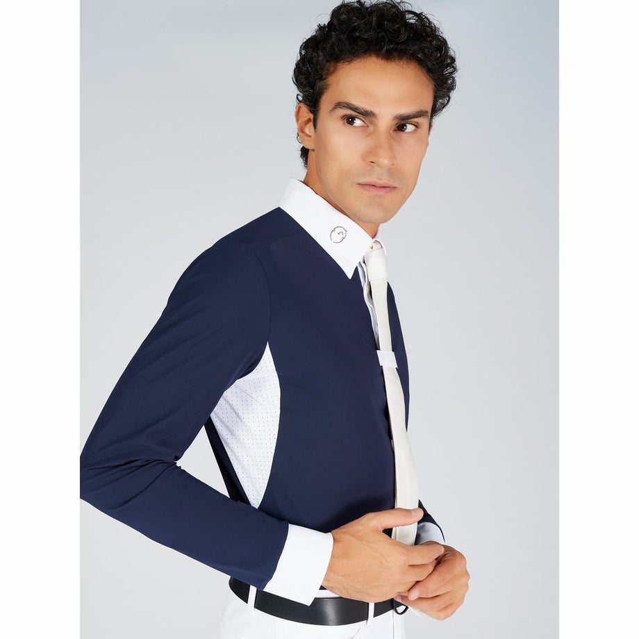 ・伸縮性のあるバイエラスティックジャージー素材で快適なフィット感。・サイドにメッシュインサートを配置し、通気性と速乾性を確保。・前立ては3つボタン+タイストラップ付きで、競技仕様に対応。・襟元には隠しスナップボタンで安定感をプラス。・右襟にVestrumロゴ刺繍入りで、控えめなブランドアクセント。・アイロン不要でお手入れも簡単。・イタリアらしい洗練されたデザインと機能性を兼ね備えた一枚。