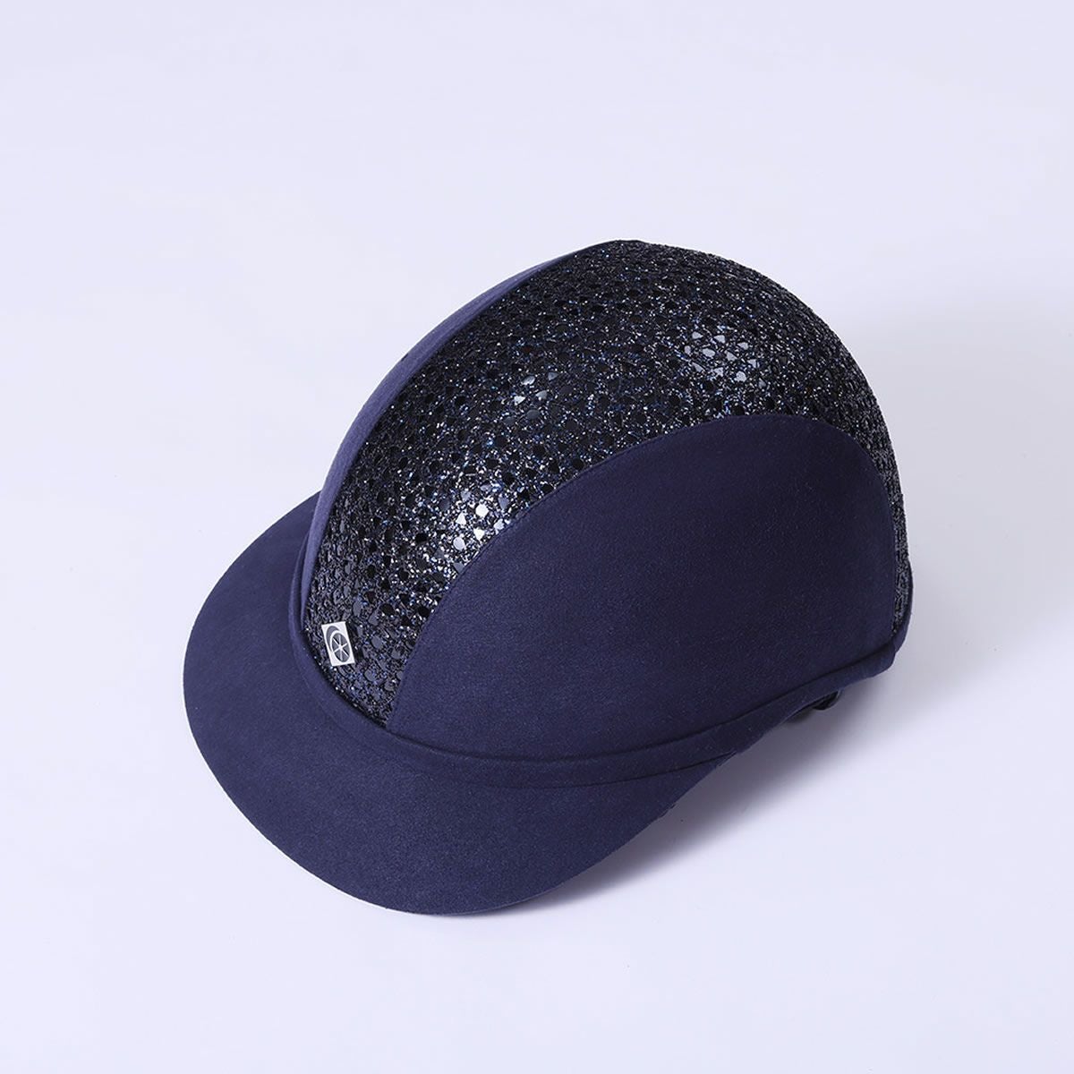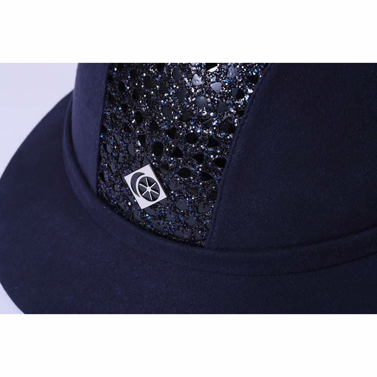 太陽の光で輝くセンターパネルがエレガントなツバ広ヘルメット CHARLES OWEN SP8プラス ネイビースパークリー マイクロスエード