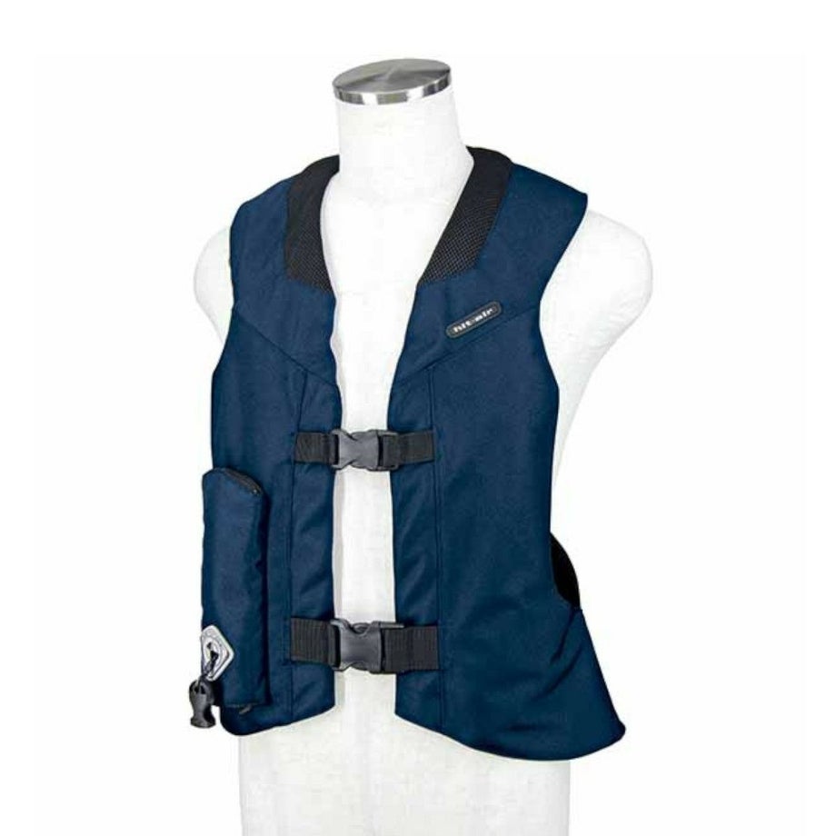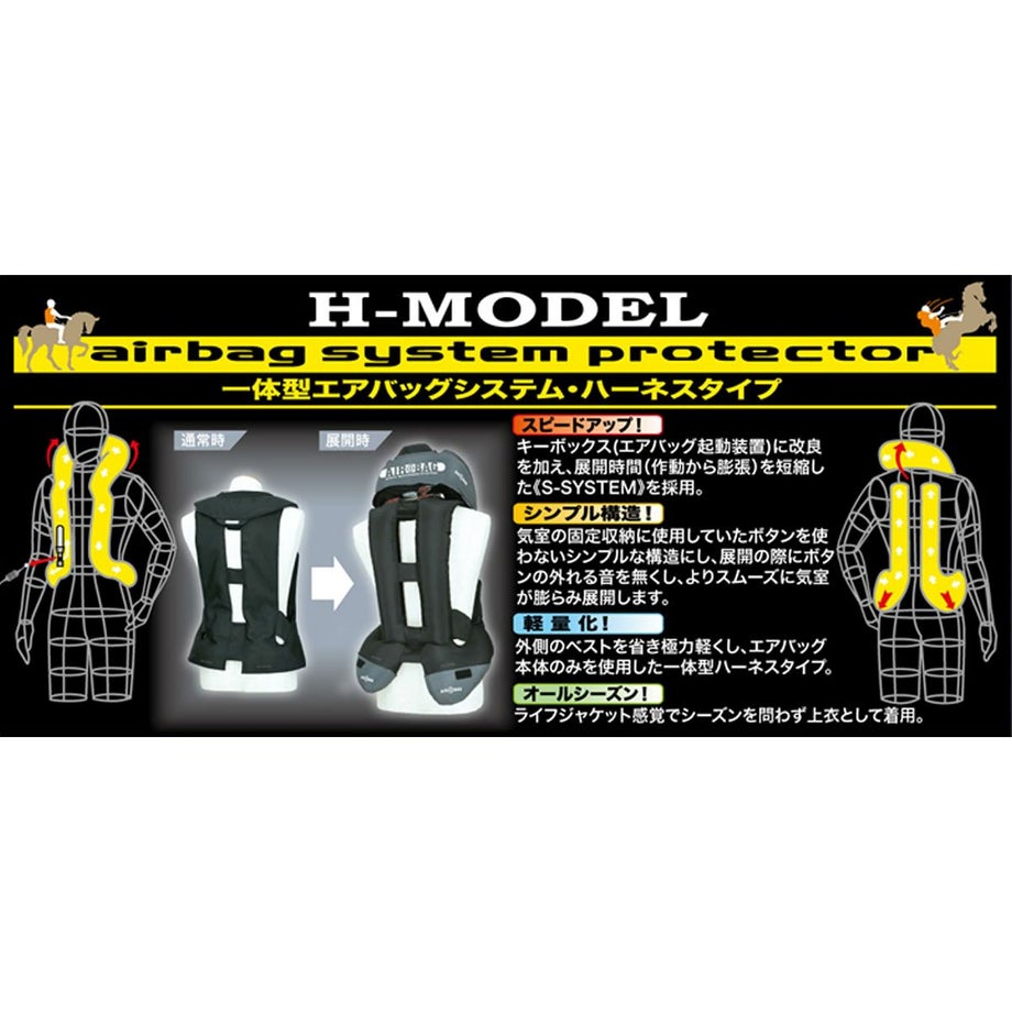 乗馬クラブからのアドバイスを元に改良されたモデル。落馬時に打ちやすいヒップまわりまでカバーした形状に進化しました。多くの乗馬クラブで推奨されているモデルです。①乗馬クラブ協力の元、デザインしなおした安全性の高いモデルです。②ヒップの左右までエアバッグが出るようになっています。落馬時にお尻の左右を負傷することが多いため、その部分もカバーしています。③エアバッグチューブの固定をボタンから柔軟なベルクロに変更したのでエアのふくらみが早くなっています。・落馬などで馬からライダーが飛ばされた瞬間にエアーバッグが作動し、首、背中、胸、脇、尻を守ります。・SHOCK-BUFFERING SYSTEM(衝撃緩和保護システム)は、ライダーが馬から”一定の距離”を離れた瞬間にキーボールが抜け、キーボックスが作動しカートリッジボンベより炭酸ガスが首気室、胸気室、背中気室、尻気室へと送り込まれます、エアーバッグが瞬時に膨張し人体への衝撃を緩和するシステムです。・作動から展開に至るまでにも衝撃緩和効果を発揮します。・エアーバッグは最大限に膨らんだ後、徐々に炭酸ガスが抜ける仕組みになっています。(息苦しい場合は、脱衣して圧迫を解消してください)・別売りのCO2カートリッジボンベに交換することで、何度でも繰り返しお使い頂けます。【メーカー保証・メンテナンスサービスについて】・メーカー1年保証が付いています。商品同封の保証書とご購入時の納品書やレシートを大切に保管下さい。・メーカーで実施している保証やサービスについては製造元の無限電光株式会社へ直接お問い合わせ下さい。