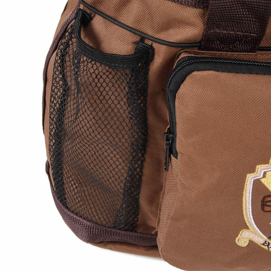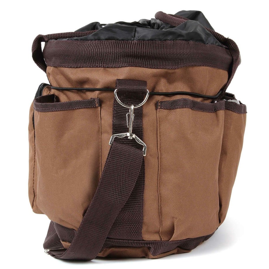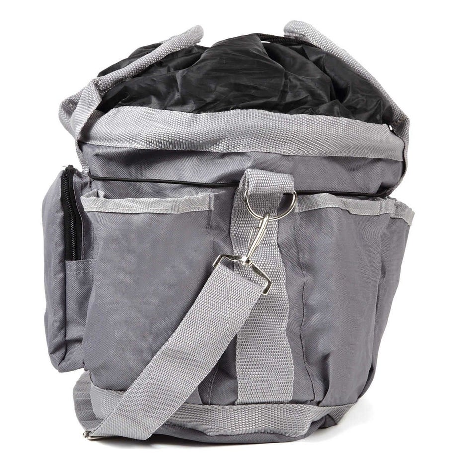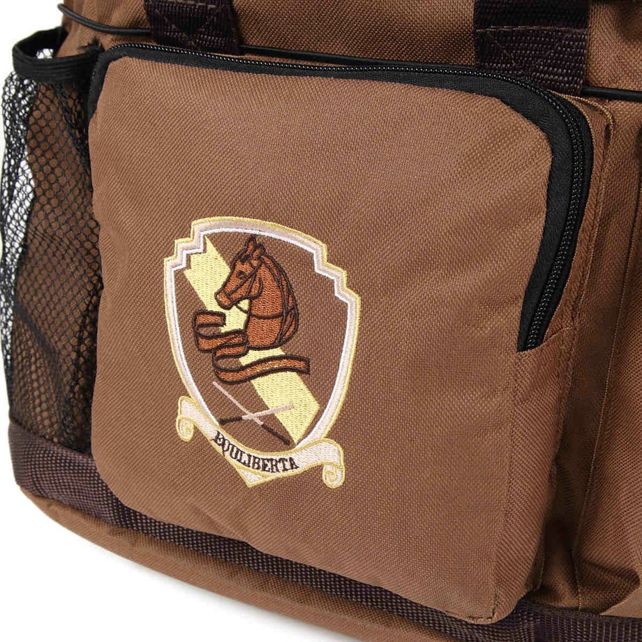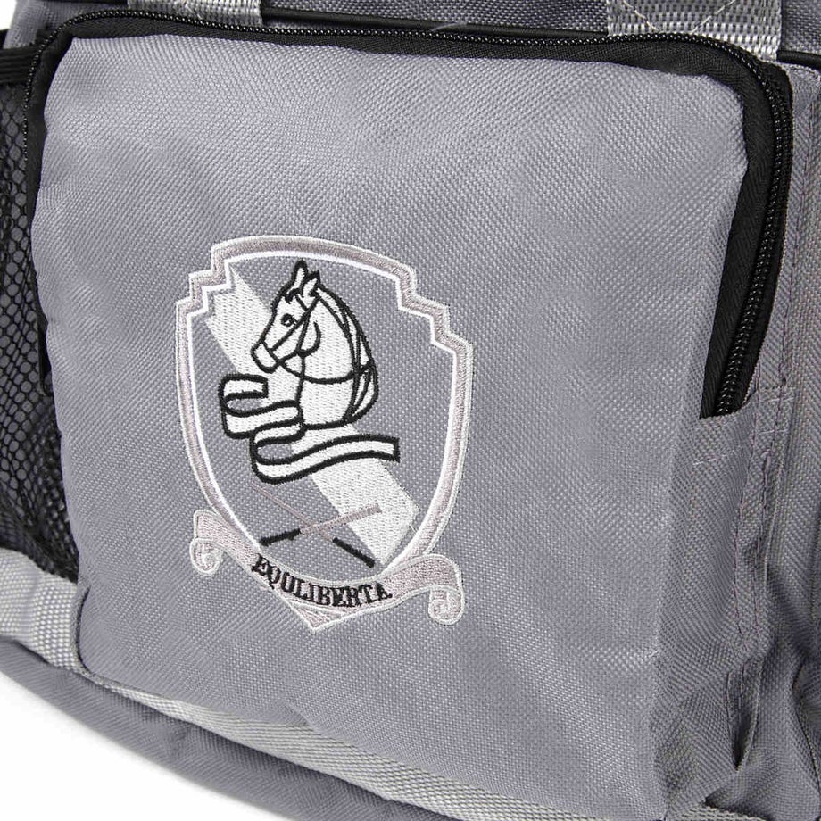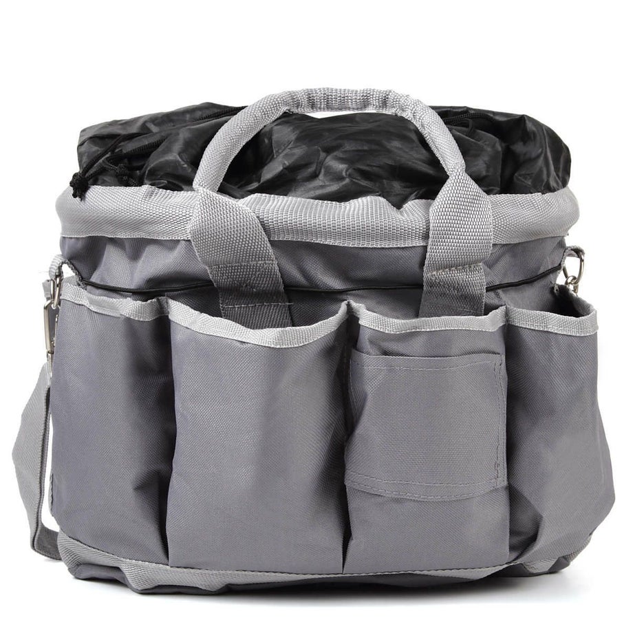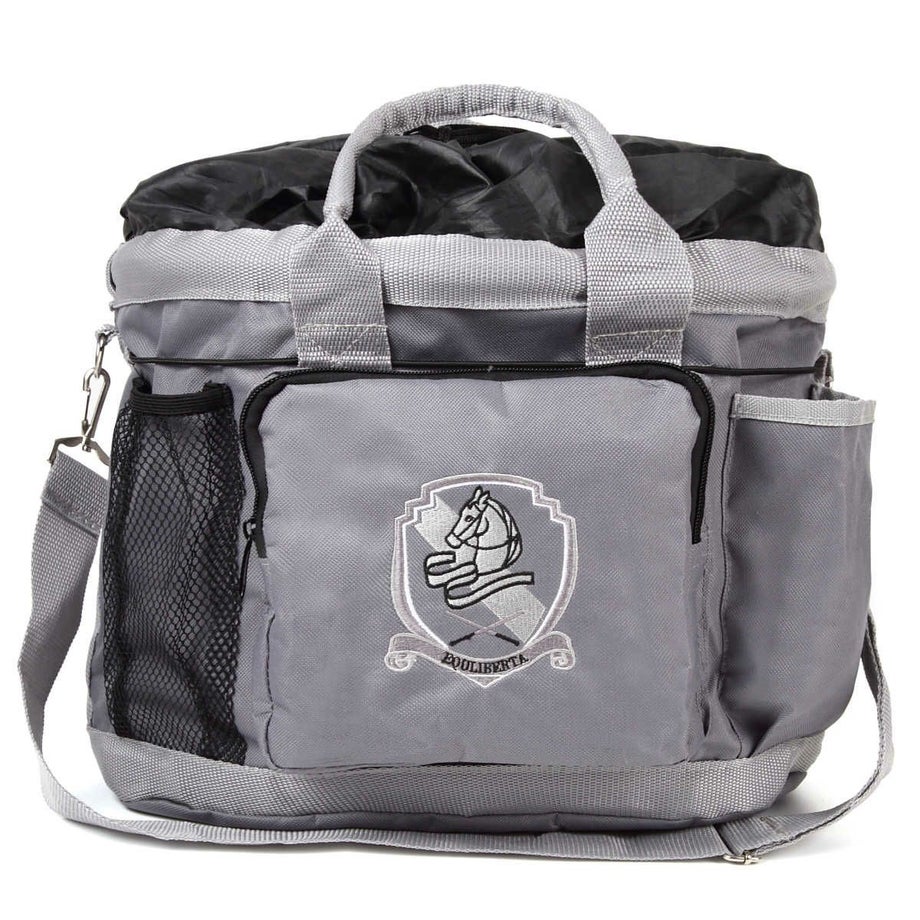 収納力バツグンのグルーミングバッグ。外ポケットがたくさんあるので小さなものはファスナー付きへ、乾かしたいものは編み部分へ、長いものはゴムひもで押さえるなど、とっても便利です。・ポケットは外側に7ヵ所。内側に1ヵ所。 外側:フリーポケット4、マジックテープ付ポケット1 ファスナー付ポケット1、ミニポケット1 内側:マジックテープ蓋付ポケット1・周囲にぐるりと張られたゴム紐がてっぴやブラシを押さえるのでポケットから落ちません。・入れ口は巾着タイプになっており、背の高いスプレーなどの収納もラクラク。・お手入れ道具から脚元プロテクターやグローブまでひとまとめに出来ます。・汚れがつきにくい素材を使用しています。・ショルダーにもなるので荷物が多いときにも持ち運びラクラク。・底面はしっかりした底板と底鋲なので濡れた洗い場でも汚れにくいです。・同じデザインのEQULIBERTAの手入れ道具シリーズで揃えるとより一層引き立ちます。