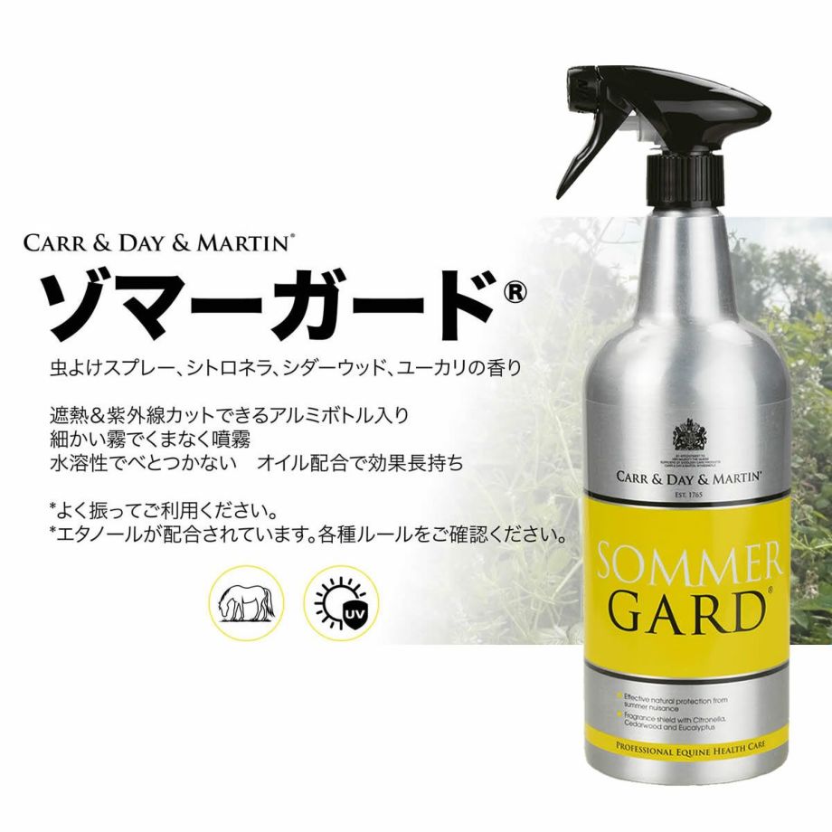 ・持続性の高い馬用の虫よけフレグランススプレー。・シトロネラオイル、シダーウッド、ユーカリの香り。・遮熱と紫外線カットができるアルミボトル入り。・シューっと遠くまで細かい霧で、くまなく噴霧できます。・さらりとした水溶性の液体でべとつかず、お手入れも楽。・ハーブオイル配合で効果長持ち。・オイルは汗に流れにくくUVカットにも。・さわやかなレモン系ハーブの香り。・内容量 1000ml