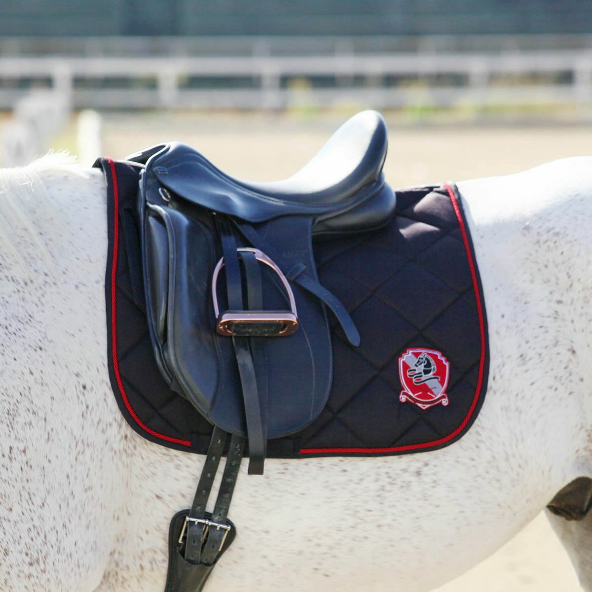 ・コスパの高い定番サドルパッド。・クラシカルなクロスステッチに紐飾りとロゴワッペンがアクセントとなりCOOLな雰囲気。・縁取りの紐飾りは光沢感のある素材。ワッペンのロゴ刺繍にも光沢糸が使われシンプルながらキラリと目立つデザインです。・内部クッションが2層構造で馬にやさしく人は乗りやすいです。外側はしなりがありクッション性の高いスポンジ、内側は柔らかくソフトな当たりの綿です。・吹き出し防止芯地が入っているので、中綿が外に飛び出しません。・ロゴワッペン無しのバリエーションもありますので、オリジナル刺しゅうを入れてチームゼッケンにするのもおすすめです。