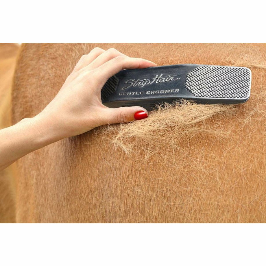 ・ストリップヘアは、馬体のすべての部分を綺麗に整えることができる便利なお手入れグッズです。・一番のおすすめは抜け毛の季節に使うこと!気持ち良いほど抜けます。・耐久性があり柔軟性にも優れたオリジナルのゴム素材で出来ています。・水洗いで簡単に汚れが落ち、衛生的です。・一番大きな広い面はボディ用、裏面の小さな面は顔や肢などの細かい部分に。・エッジの部分は汗こきや抜け毛取りとして使用できます。・これひとつで多くの使用法があり、グルーミング、汗こき、シャンプー、艶だしなどユニークなオールインワングルーマー。・お手入れ道具箱もこれひとつあればスッキリ収納上手に。