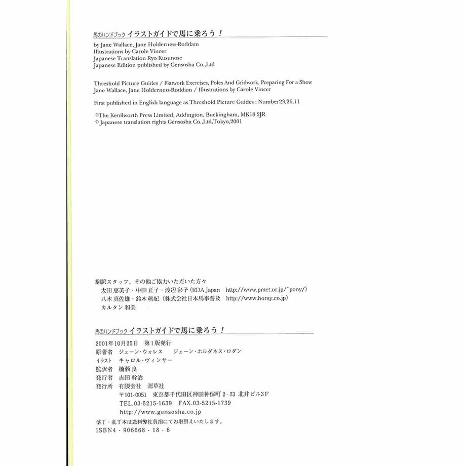 英国のビジュアル乗馬解説。ロングセラー・シリーズの邦訳!馬術・乗馬の本場・英国のロングセラーで、多くの言語に翻訳され世界各地で親しまれている「スレショールド・ピクチャー・ガイドシリーズ」から3冊をピックアップして翻訳、コンパクトな1冊にまとめた。「馬場馬術の基礎」、「障害馬術の基礎」、「馬術大会に出るための準備」など。本書には、あらゆる乗馬ファンに役立つ情報が掲載されている。どんなスタイルの乗馬でも、その基本は同じ。ここには、馬とより上手にコミュニケーションをとるための提案が満載されている。常歩・速歩などの歩法のマスターから、地上の横木の通過、高い連続障害飛越、競技会で必要な装備や馬のグルーミング、健康管理法など、馬場馬術・障害馬術の基礎から競技会に出場するまでをイラストを使って分かりやすく解説。・著者・編集 ジェーン・ウォレス, ジェーン・ホルダネス・ロダム・監訳者 楠瀬良・サイズ A5判・ページ数 72ページ・出版社 源草社
