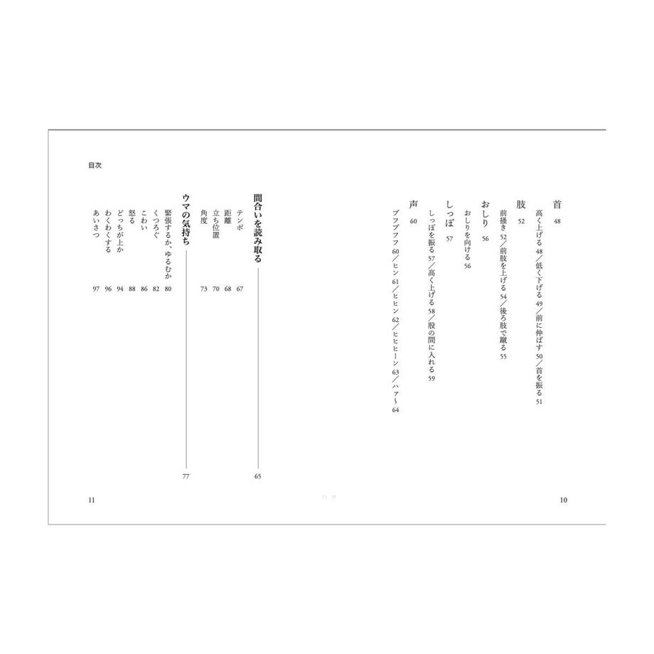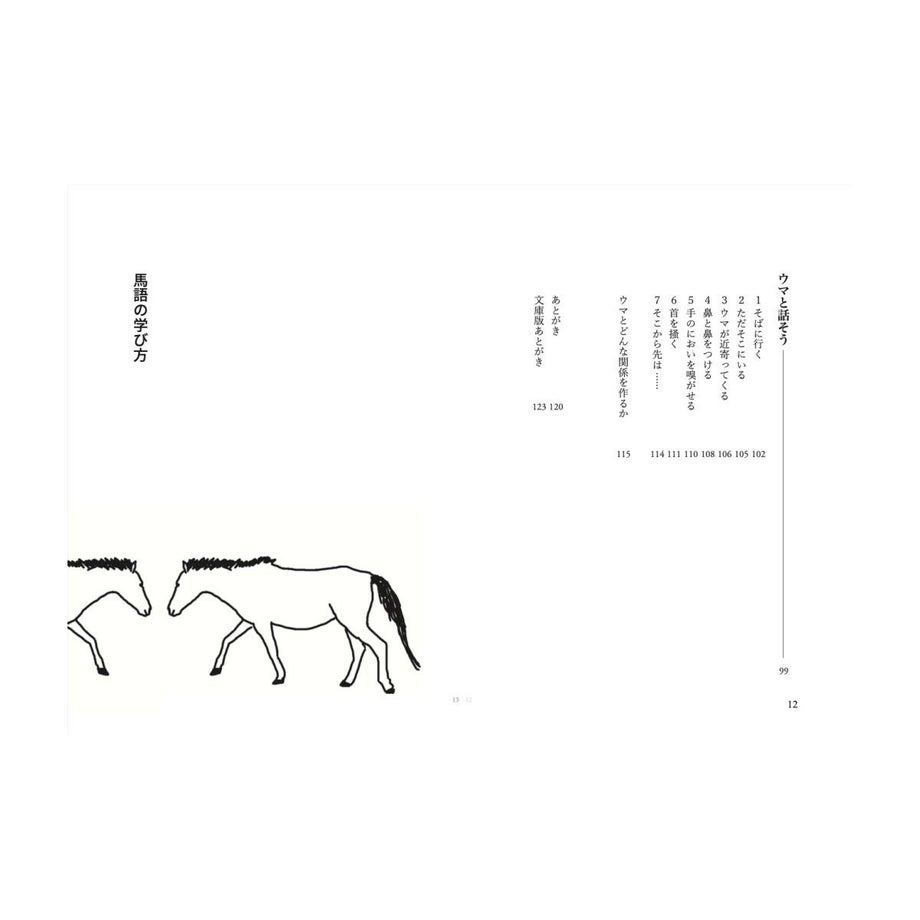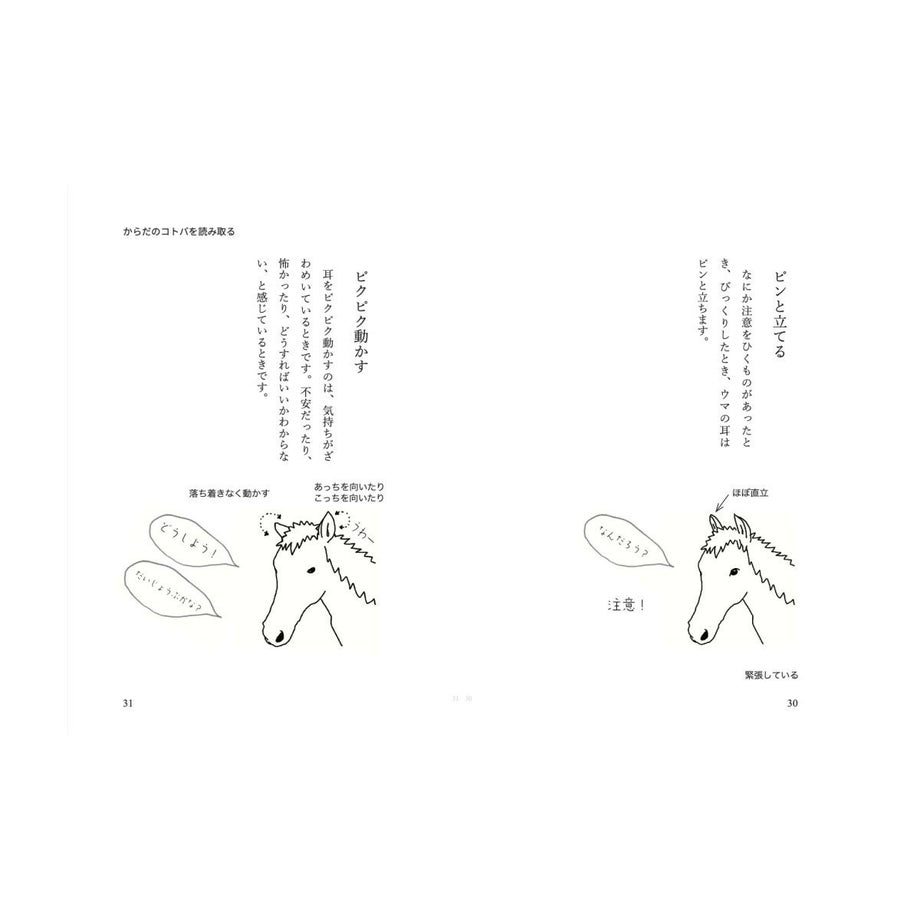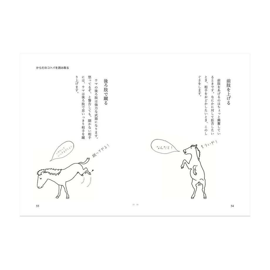 ウマがどんなふうに話すか、知っていますか?鼻をブルルルッと鳴らしたり、ヒヒーンといなないたり。そう、それもたしかに彼らの言葉です。でもたぶん、声を使うのは全体の5%ぐらい。ウマの会話の中心は体を使ったボディランゲージです。耳やしっぽを動かしたり、体全体で動いたりしながら、ウマはいつも仲間同士でいろいろな会話をしています。たとえば「静かに草を食べている」姿の中にも、実はたくさんのコトバが隠れています。ぱっと見てもわからないかもしれないけれど、たしかに彼らは話しているのです。この、音だけに限定されないウマたちの言葉、コミュニケーションする手段が「馬語」です。ウマは賢い動物です。人間が簡単な言葉や合図を教えれば、それを覚えて、反応してくれるようになります。あなたが愛情を持って(人間の言葉で)話しかけたり、やさしく触ったりすれば、ウマはそのトーンを感じ取ってくれもします。でもそれは、あくまでも人間中心。ウマの立場に立った会話ではありません。その逆に、もし人間であるあなたが馬語を理解したら、(人間だって賢い動物なのだから、やればできるはず)さあ、どんなことが起こるでしょう。まずウマは、「お!」と驚きます。「このいきものはヒトのようにみえるけれど、どうやらウマのことばがわかるようだぞ」と、あなたに注意を向けてきます。そして、これまでとは違う態度を取り始めます。たとえば言葉の通じない外国に行った時、「こんにちは」「ありがとう」とカタコトの言葉を話すだけで、その国の人は、ぐっとあなたに親近感を持ってくれますよね。そんな感じに近いと思います。ウマはいろいろなことをあなたに語りかけ始めます。この本は、馬語の世界へとつながっています。といっても、ほんの入り口にしかすぎません。あくまでも人間であるわたしが、「どうもこういうことかもしれない」と翻訳して書き留めた覚え書きのようなものです。・出版社: カディブックス・文と絵:河田桟・編集と装丁:賀内麻由子・本文設計:大木美和+賀内麻由子・サイズ:A6判126ページ