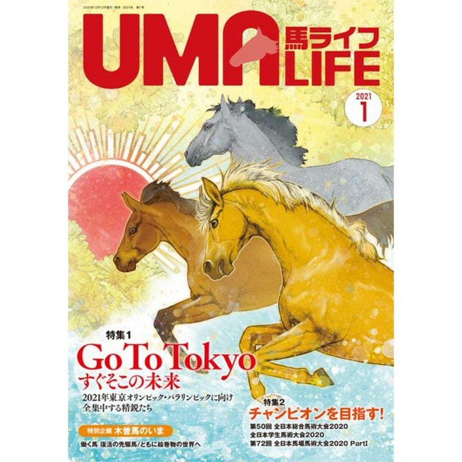 乗馬を始める、楽しむ情報マガジン「UMA LIFE」動物が好き?それなら馬と遊びましょう!乗馬というと何だかチャレンジしづらいイメージがあるかもしれませんが、じつは国内にはおよそ700の乗馬クラブがあるんです。大別すると【1】馬場内でのレッスンがメインのもの【2】海や山、草原を馬でお散歩する《外乗》をメインにしたものの2タイプです。もちろん初めての人向けのプランも充実しています。たとえば4回のレッスンがセットになった体験乗馬教室(15,000円前後)や簡単なレクチャーつきの外乗(1時間10,000円程度)などなど。そうして馬と仲良くなったら、馬と遊ぶ楽しみが膨らみます!どんな風にして遊びましょう?「UMA LIFE」には、馬と過ごす時間が楽しくなるような国内外の情報が満載です。さらにあなたの地域の乗馬クラブがすぐにわかる【乗馬クラブガイド】もついていて、あなたの乗馬ライフをサポートします!・サイズ A4判・出版社 メトロポリタンプレス【内容】特集1 Go To Tokyo すぐそこの未来2021年東京オリンピック・パラリンピックに向け全集中する精鋭たち大岩義明(総合馬術)田中利幸(総合馬術)戸本一真(総合馬術)広田龍馬(障害馬術)桝井俊樹(障害馬術)原田喜市(馬場馬術)黒木 茜(馬場馬術)稲葉 将(パラ馬術)特別企画 木曽馬のいま・働く馬 復活の先駆馬 木曽馬・空号をしのんで・和装で和種馬に跨り いざ、絵巻物の世界へクリスマス企画・UMA LIFE Christmas Gift Collection 2020アートジュエリー/アダージョ/プラチナウーマ/ルーベスジャパンブルーリボン/マツバラプロジェクトチーム/エクイマーケット 日本馬事普及ショールーム特集2 チャンピオンを目指す!・第50回 全日本総合馬術大会2020・全日本学生馬術大会2020・第72回 全日本馬場馬術大会2020 PartⅠ・ Made in Japanの馬たち 遠野市乗用馬市場・JRA調教師 小島茂之さんが指南! サラブレッド牝馬との付き合い方感度は360° 人&馬ナビゲーション・東京オリンピックに向けメディアのための「馬術講座」開催・人と馬に優しい競技会 コルザカップ2020・子ども専門の乗馬クラブ 教科書的な指導は全くナシ!・ピアッフェ通信 広げよう“馬友”の輪! 竹原佳誉子さん・十和田乗馬倶楽部からリアルな流鏑馬を世界に発信!好評連載・馬がいる場所 現代(いま)を働く馬たち in 北海道・森 裕悟のこんな感じで、どうでしょう ツーポイントとハーフシート(後編)・迷馬のトリセツ ヤレバデキル(導入編) 菊澤大助・千本木倫子のイギリスからNeigh Neigh聞いて ポロクロス競技の人気上昇・馬乗りのためのピラティス入門 身体の歪みを正す・Horse Talk ナチュラル・ホースマンシップ②・馬探訪NEO バランスオブゲーム・馬ちがい探し7・クラブガイド/馬のお仕事・リクルート・うまうまVOICE・UMA LIFE Collection/Information/読者プレゼント