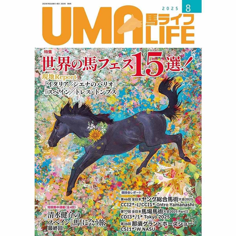 乗馬を始める、楽しむ情報マガジン「UMA LIFE」動物が好き?それなら馬と遊びましょう!乗馬というと何だかチャレンジしづらいイメージがあるかもしれませんが、じつは国内にはおよそ700の乗馬クラブがあるんです。大別すると【1】馬場内でのレッスンがメインのもの【2】海や山、草原を馬でお散歩する《外乗》をメインにしたものの2タイプです。もちろん初めての人向けのプランも充実しています。たとえば4回のレッスンがセットになった体験乗馬教室(15,000円前後)や簡単なレクチャーつきの外乗(1時間10,000円程度)などなど。そうして馬と仲良くなったら、馬と遊ぶ楽しみが膨らみます!どんな風にして遊びましょう?「UMA LIFE」には、馬と過ごす時間が楽しくなるような国内外の情報が満載です。さらにあなたの地域の乗馬クラブがすぐにわかる【乗馬クラブガイド】もついていて、あなたの乗馬ライフをサポートします!・サイズ A4判・出版社 メトロポリタンプレス【内容】●特集 世界各地の馬にまつわる祭典を一気に紹介「世界の馬フェス15選!」1.ロットアッハ=エーガン(ドイツ南東部バイエルン地方)2.ホワイト・ターフほか(スイス・サン・モリッツ) 3.野生馬ハンティング (ドイツ・ミュンスターランド)4.サ・サルティリア (イタリア・サルデーニャ島・オリスターノ)5.カルガリー・スタンピード (カナダ西部のアルバータ州カルガリー)6.野生馬のタテガミ切り祭り(スペイン・ガリシア州 ポンテベドラ県・サブセド村)7.へレスの馬祭り(スペイン・アンダルシア州カディス県ヘレス・デ・ラ・フロンテーラ)8.セビージャの春祭り (スペイン・アンダルシア州セビージャ)9.ワイン馬の祭り(スペイン・ムルシア州)10.サン・ジョアン祭り(スペイン・メノルカ島)11.シュヴァル・パシオン (フランス・アヴィニヨン)12.ダーバ祭 (ナイジェリア・カツィナ)13.リタンの競馬祭 (中華人民共和国・四川省リタン)14.★現地Reportパリオ(イタリア・シエナ)15.★現地Reportトレス・トンブス(スペイン)●The Live Horses 時を封じた祭り 写真=佐藤美子(Sato Yoshiko) Location=イタリア サルデーニャ島(Italy Sardegna)●短期集中連載(全4回) 清水健介のスペイン[馬]に会う旅 最終回(第4回)陸軍牧場(Yeguada Militar) ●競技会レポート・第46回全日本ヤング総合馬術大会2025 CCI2*-L/CCI1*-Intro Yamanashi・第77回 全日本馬場馬術大会2025 PartⅡ CDI3*/1* Tokyo 2025・第36回 那須グランドホースショー CSI1*-W NASU●UMAMIMI情報局・サムライハートで男も女も熱くなれ! 相馬野馬追2025レポート・元気があればなんでも!“あの”シルクボンバイエ25歳になりました。・馬と人がともに育つ場所 東関東馬事高等学院×Retouchが生み出す命の循環・ホースマンたちが重ねた歴史 フリーダム・ライディング・クラブ200回記念定例会●連載・馬の名は vol.46 プロメサアルムンド・初級インストラクターのための指南書教えて○○さん Vol.40 FEIスチュワードとして世界で活躍する秘訣 今回のエキスパート=大谷倫弘さん ・馬と人との安全を科学する!?SAFETY FIRST+第35回 危険範囲の認識はありますか? 菊澤大助・聞かせて!『世界の馬ライフ』第12回 YURIE KONO 日本代表馬術選手をアメリカから夢見る─カーソンかほりさん・輝け!みんなのホースセラピー 第46回 世界選手権出場に向けて躍動するパラ馬術選手 塚本めぐみ・ピアッフェで会いましょう Vol.37 セカンドキャリアを馬術に託したサラブレッドたちの競演! 第2回 JRA馬術フォーラム PIAFFER Presents 第1回 オールサラブレッドホースショー ・アロマテラピー for 愛馬 第24回 クレイを使ったホースケアについて 大森かずえ・馬探訪NEO File.195 カツゲキジャパンUMA LIFE CLUBUMA LIFE CROSSWORD PUZZLECLUB GUIDERecruitment 馬のお仕事・リクルートUMA LIFE CollectionUMA LIFE Information読者プレゼント