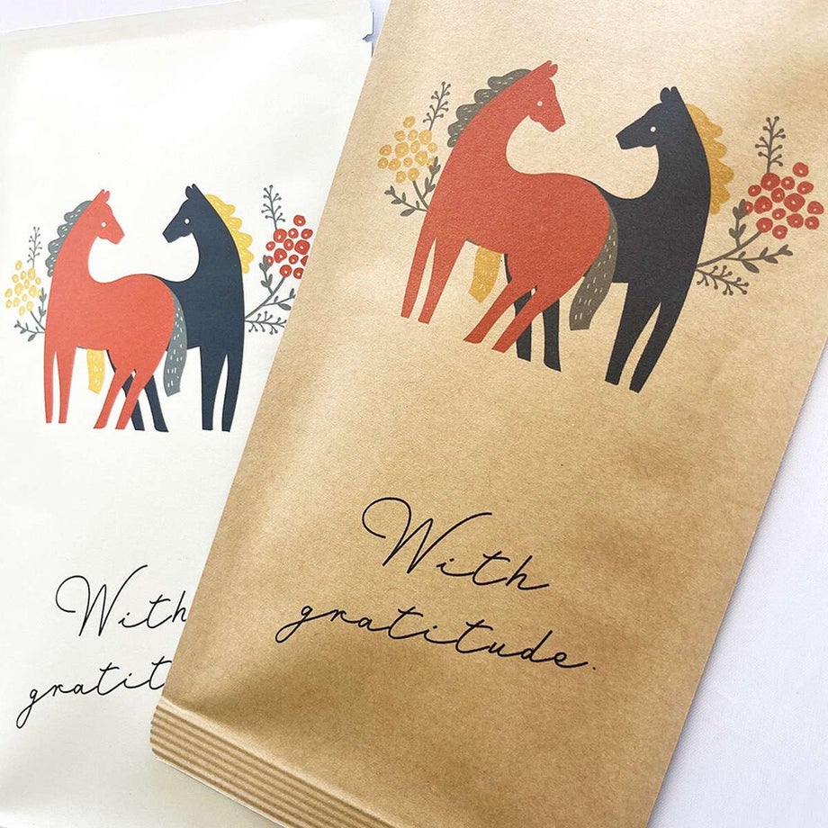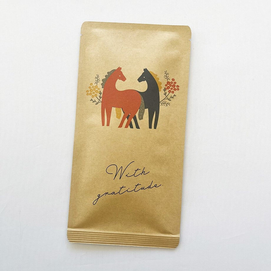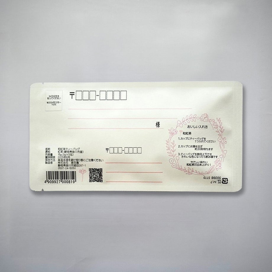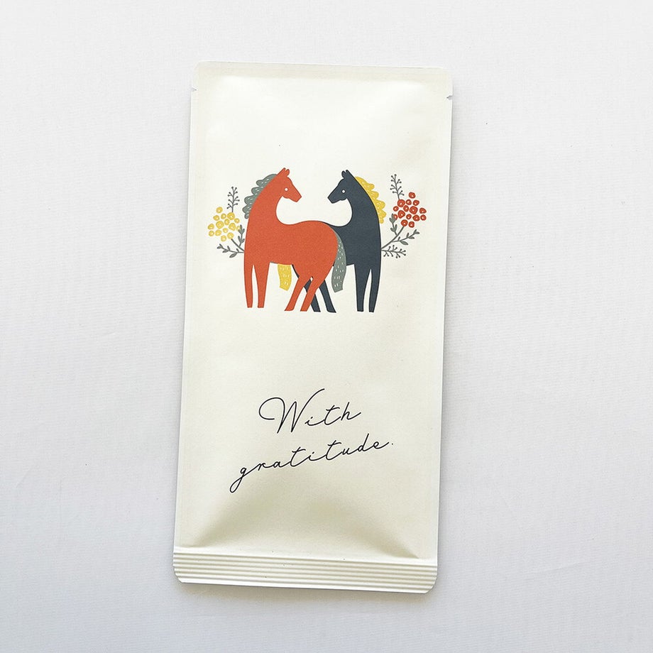 ・幸せの象徴「北欧馬」が彩るパッケージ幸せを運ぶとされる北欧馬と美しい花々をあしらった、ジョッパーズらしい心躍るデザイン。馬を愛する方はもちろん、日常に彩りを添える華やかなプチギフトとして喜ばれます。・名産地・掛川が育んだ極上の旨味お茶の名産地として名高い、静岡県掛川市産の厳選された茶葉を贅沢に使用。絶妙な焙煎により、雑味のないクリアな味わいと、和紅茶ならではの深い旨味を引き出しました。・砂糖いらずの「ほのかな甘み」と香り苦味や渋味が少なく、茶葉本来の優しい甘みが特徴です。お砂糖なしでも驚くほど飲みやすく、一口ごとに心まで解きほぐされるような柔らかな香りが広がります。・切手を貼ってそのままポストへ投函パッケージ裏面は郵送用のデザインになっており、110円切手を貼るだけで「香るお手紙」としてそのまま送れます。遠方の馬友達や大切な方へ、サプライズな贈り物はいかがですか。※郵送時のご注意郵送の際は、袋の中のティーバッグができるだけ平らになるように整えてから投函してください。厚みが1cmを超えると返送される恐れがありますのでご注意ください。・手書きメッセージで想いを形に余白部分にはボールペンなどで自由にメッセージを書き込めます。馬のデザインにあなたの言葉を添えて、世界にひとつだけの特別なメッセージカードとしてお届けください。・身体を労わるティーバッグギフト抽出が良い三角ティーバッグを採用し、手軽に本格的な味わいを楽しめます。ポリフェノールやテアニンを含み、リラックスしたひとときを贈れる健やかなギフトです。原材料名:紅茶(静岡県掛川市産)内容量 :15g(3g×5包)保存方法:高温多湿を避け、移り香にご注意ください。製作 :ひとつひとつ丁寧に手作業で製作しております。