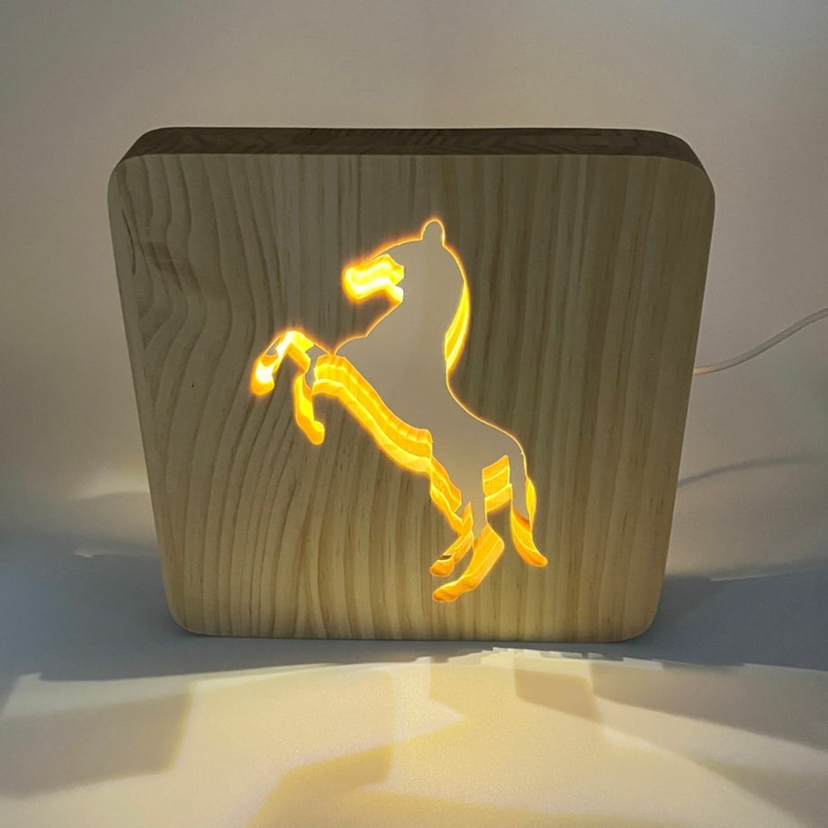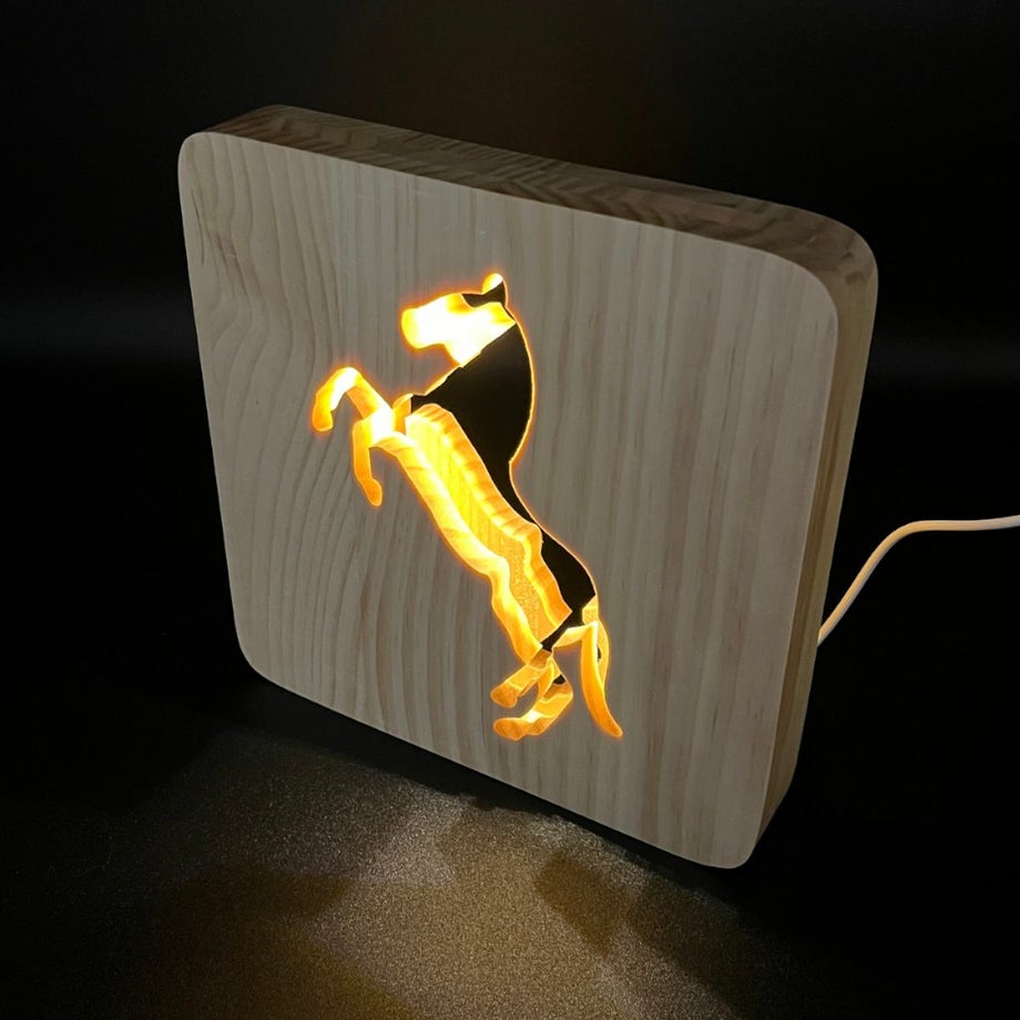・馬のシルエットがやさしく光るナチュラル&モダンな雰囲気のウッドホースライト。
