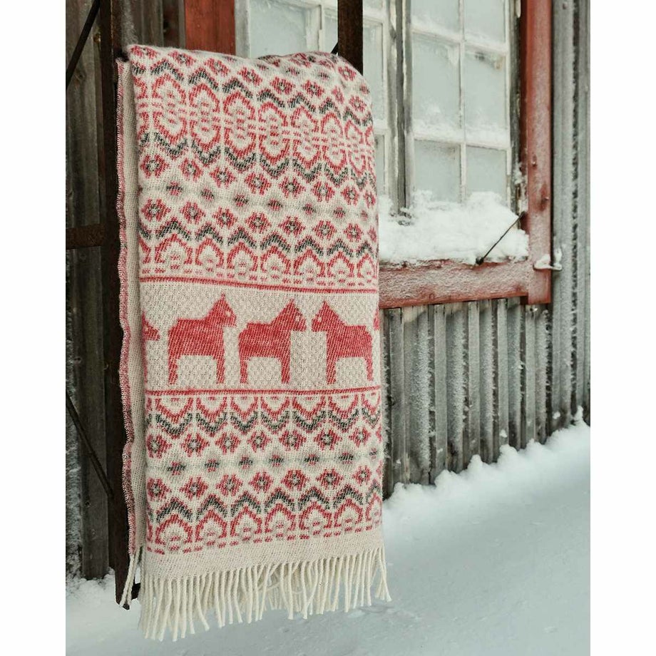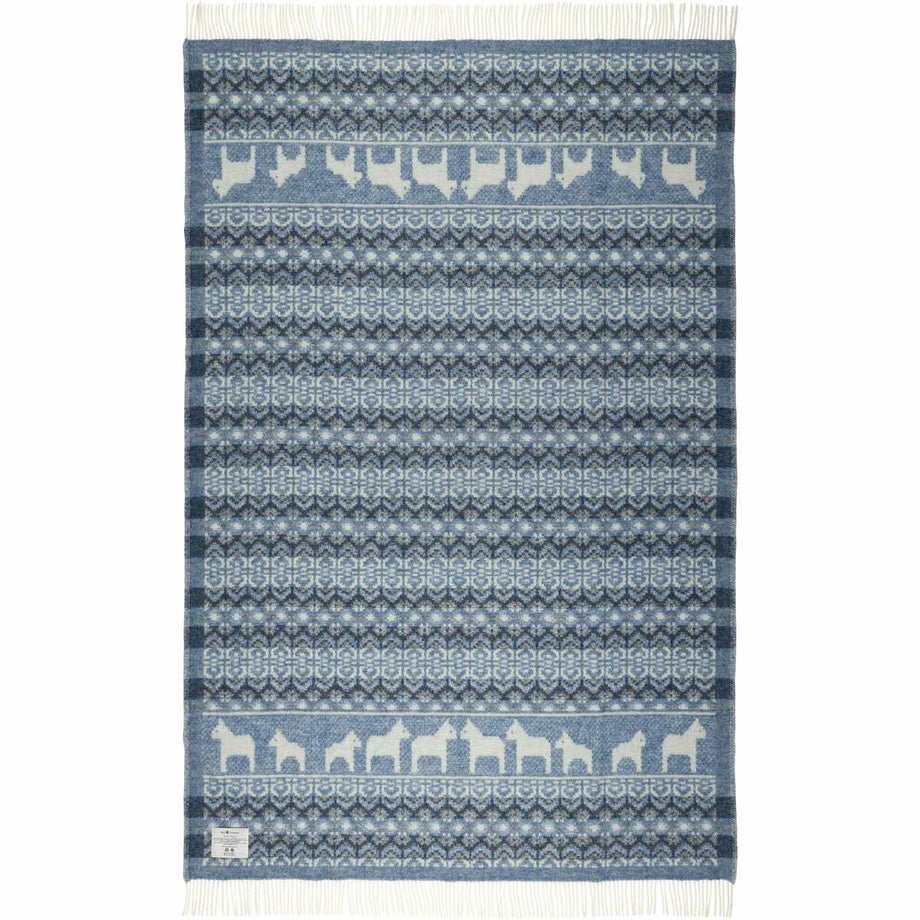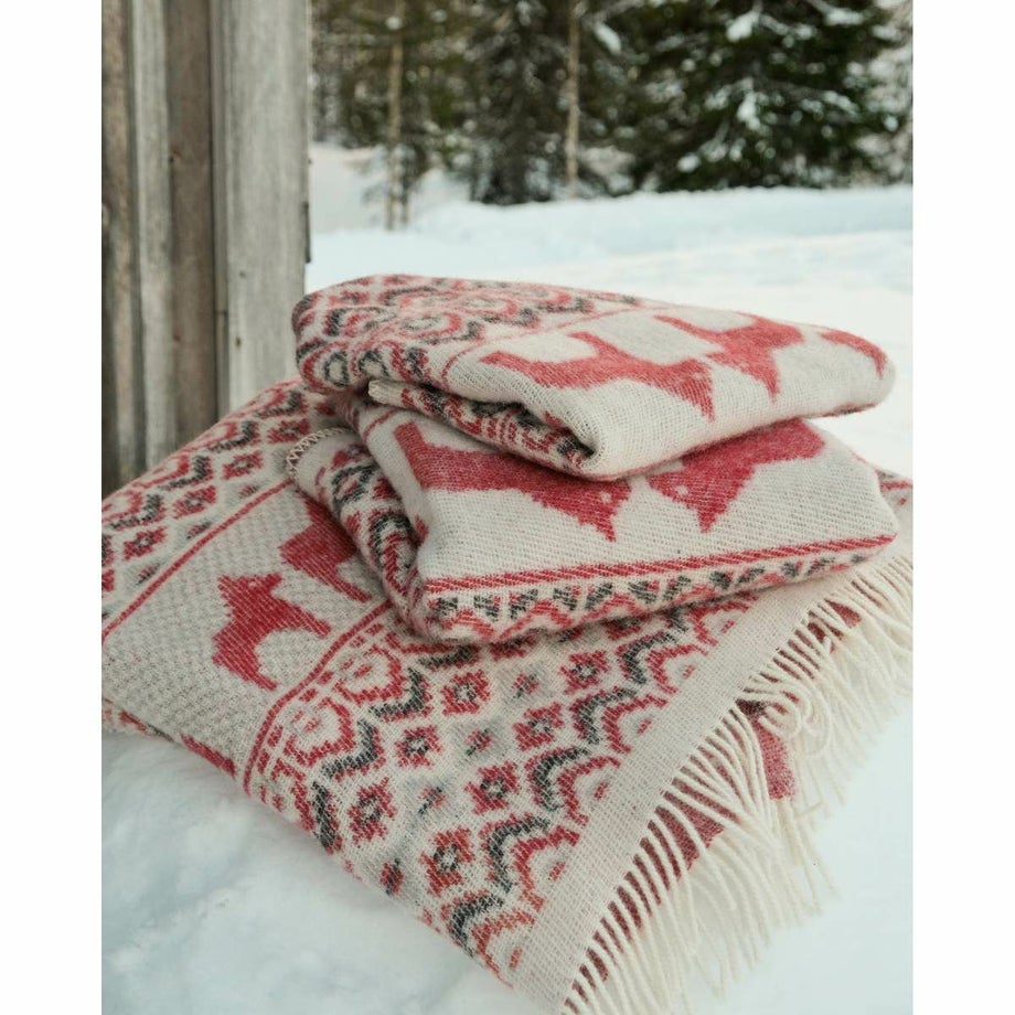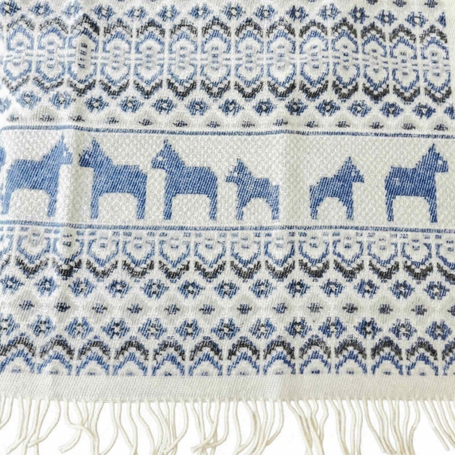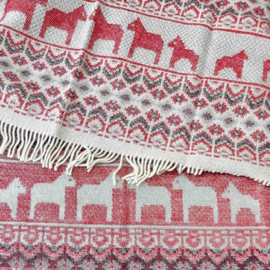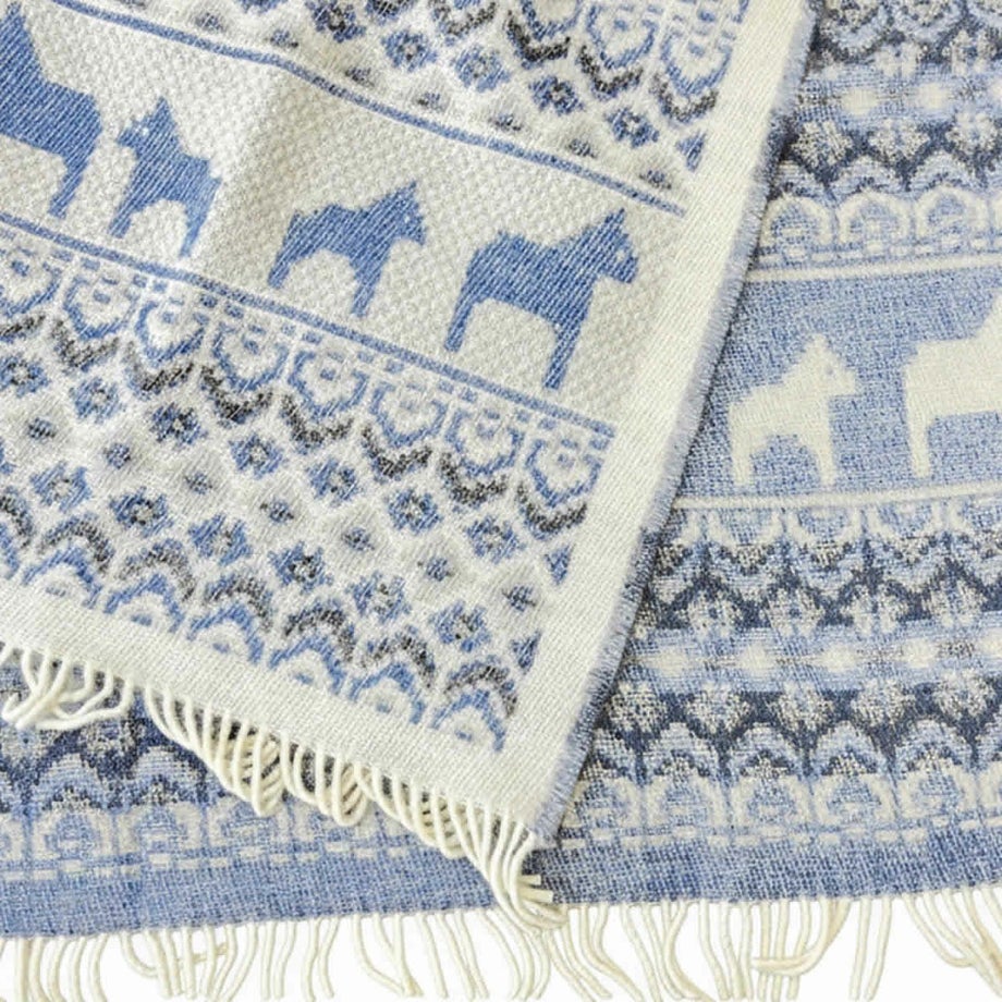 ・スウェーデンの伝統的な馬「ダーラナホース」と幾何学模様を組み合わせた、象徴的な北欧パターン。・ブルーは爽やかで落ち着いた印象、レッドは華やかであたたかみのある色使い。・ゆったりと使える大判サイズなので肩掛けやひざ掛けはもちろん、ベッドやソファでの使用にも対応。・見た目にも季節感を添える、繊細な織り模様。・熟練の職人による織り仕上げと、細部までこだわった縫製。・上下にフリンジをあしらった、仕上げまで丁寧なつくり。・厚手でしっかりとした質感と、肌触りの良さ。・ニュージーランド産メリノウール100%による、柔らかさと高い保温性。・PET FRIENDLY (ペットフレンドリー) のマークが付いており、ペットにもやさしい天然素材で、ファミリーで快適に使える安心感。・メリノウールは抗菌・防臭作用がありペット特有のニオイがこもりにくく、衛生的に保てます。・濡れた際は形を整えて自然乾燥可能。・冬の暮らしに彩りを添える、あたたかく美しい一枚。「オイブロ・バントファブリーク」1984年創業、スウェーデンのオイブロ家が営む家族経営のウール手袋靴下工場です。上質なメリノウール素材にこだわり、丁寧な製造を行っています。ほっこり優しいデザインは、スウェーデンの暮らしや自然、伝統文化からインスピレーションをうけて生まれました。丁寧に作られたぬくもりあふれるニット、スウェーデンからお届けします。