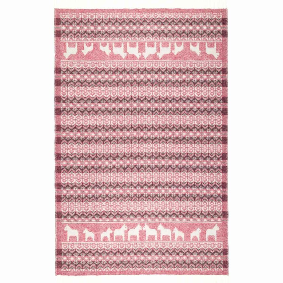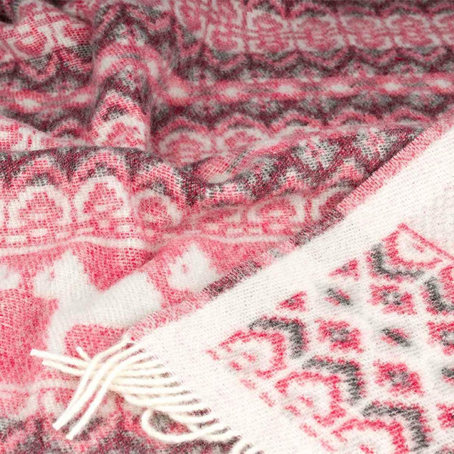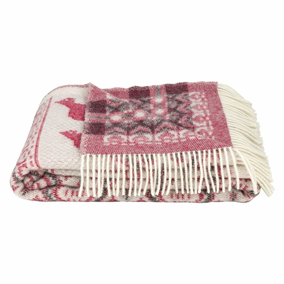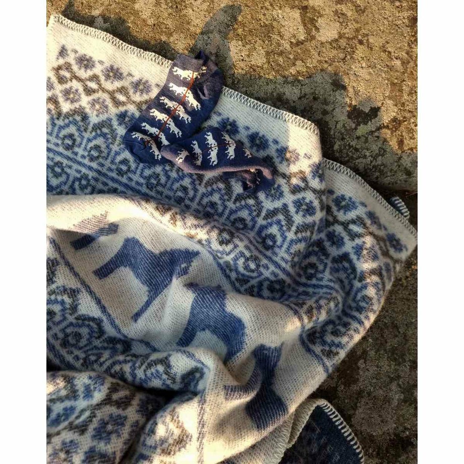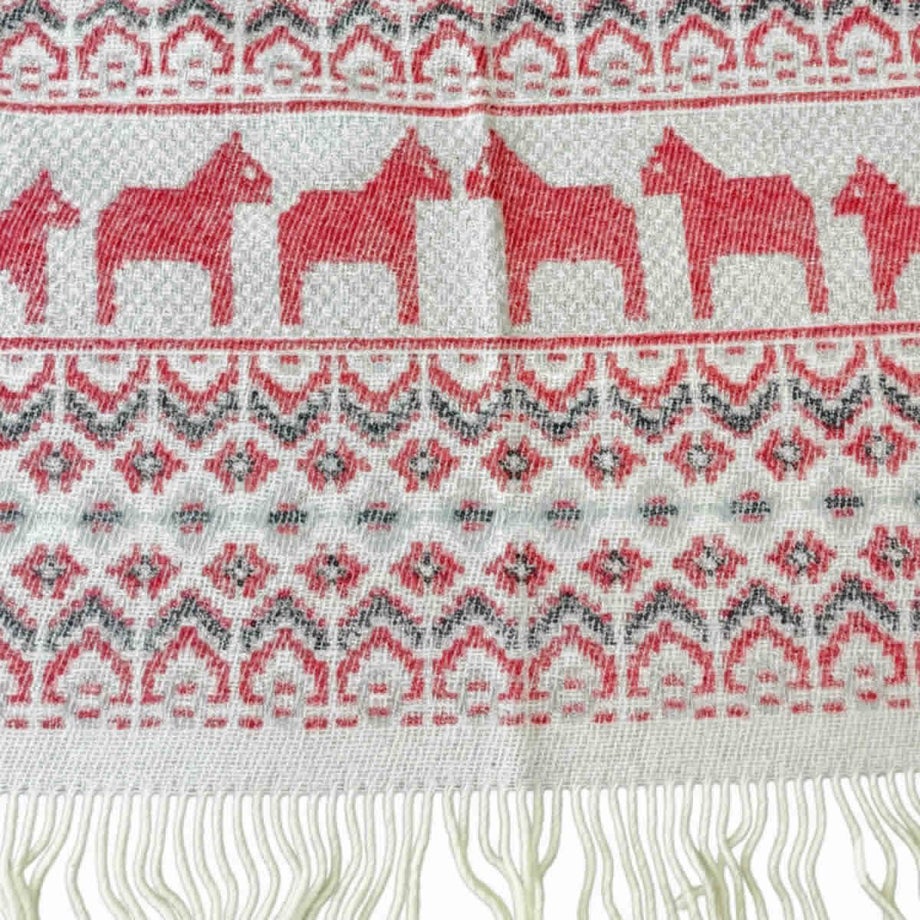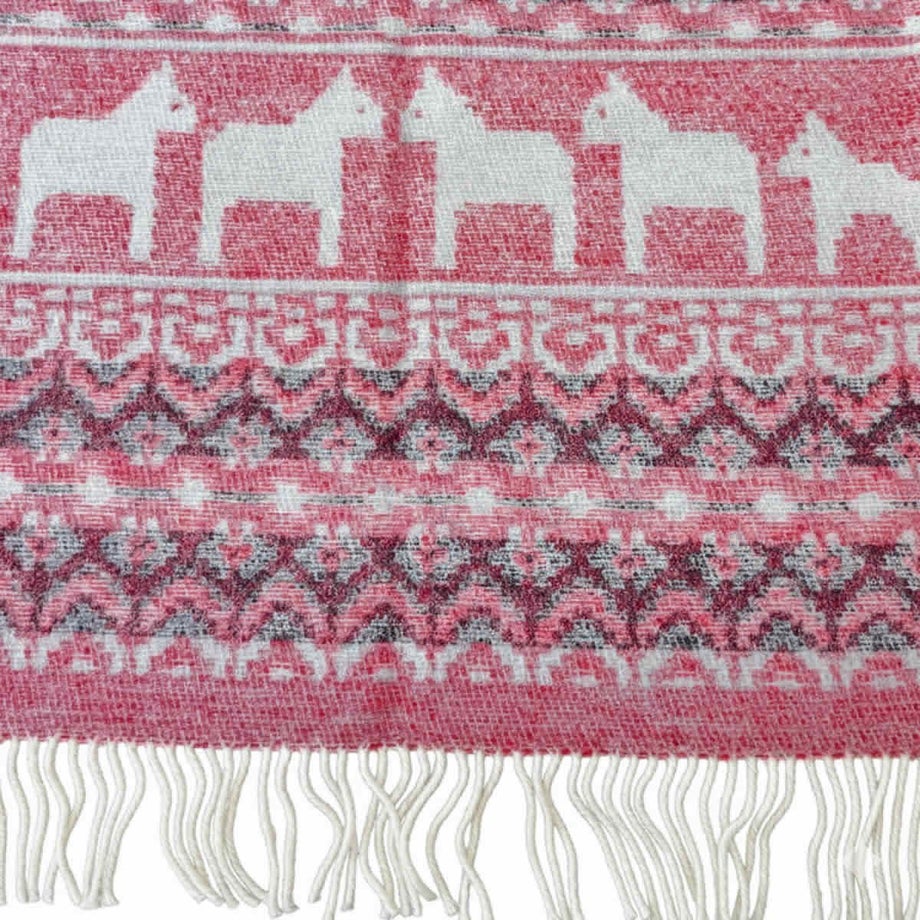 ・スウェーデンの伝統的な馬「ダーラナホース」と幾何学模様を組み合わせた、象徴的な北欧パターン。・ブルーは爽やかで落ち着いた印象、レッドは華やかであたたかみのある色使い。・ゆったりと使える大判サイズなので肩掛けやひざ掛けはもちろん、ベッドやソファでの使用にも対応。・見た目にも季節感を添える、繊細な織り模様。・熟練の職人による織り仕上げと、細部までこだわった縫製。・上下にフリンジをあしらった、仕上げまで丁寧なつくり。・厚手でしっかりとした質感と、肌触りの良さ。・ニュージーランド産メリノウール100%による、柔らかさと高い保温性。・PET FRIENDLY (ペットフレンドリー) のマークが付いており、ペットにもやさしい天然素材で、ファミリーで快適に使える安心感。・メリノウールは抗菌・防臭作用がありペット特有のニオイがこもりにくく、衛生的に保てます。・濡れた際は形を整えて自然乾燥可能。・冬の暮らしに彩りを添える、あたたかく美しい一枚。「オイブロ・バントファブリーク」1984年創業、スウェーデンのオイブロ家が営む家族経営のウール手袋靴下工場です。上質なメリノウール素材にこだわり、丁寧な製造を行っています。ほっこり優しいデザインは、スウェーデンの暮らしや自然、伝統文化からインスピレーションをうけて生まれました。丁寧に作られたぬくもりあふれるニット、スウェーデンからお届けします。