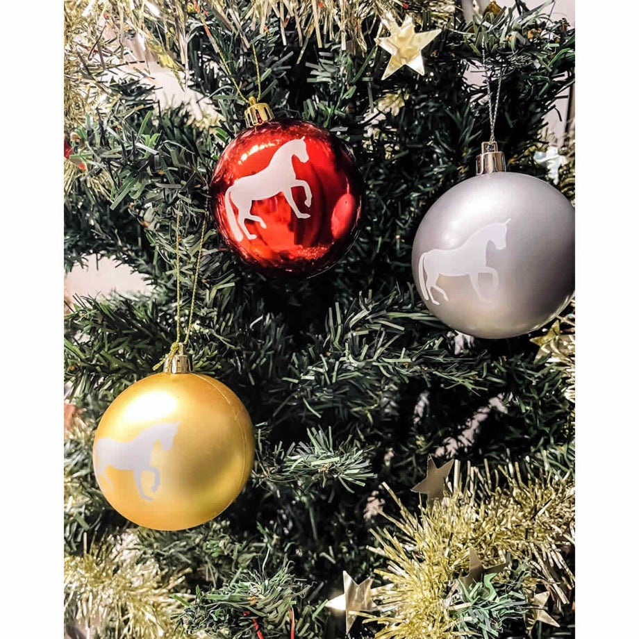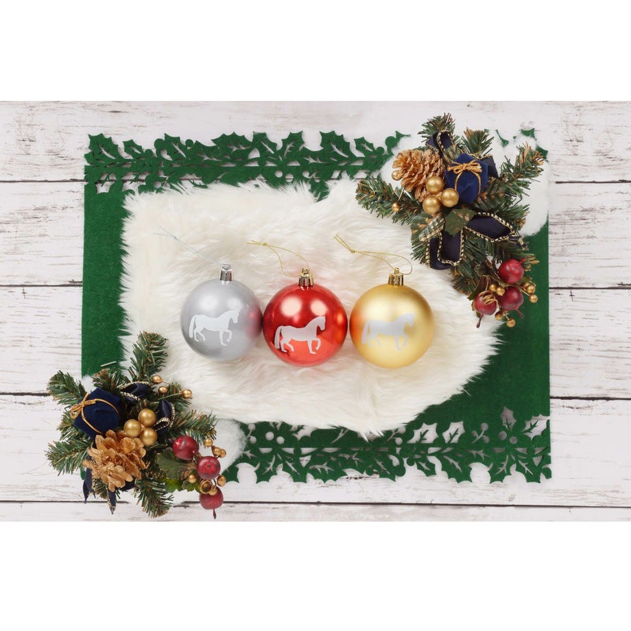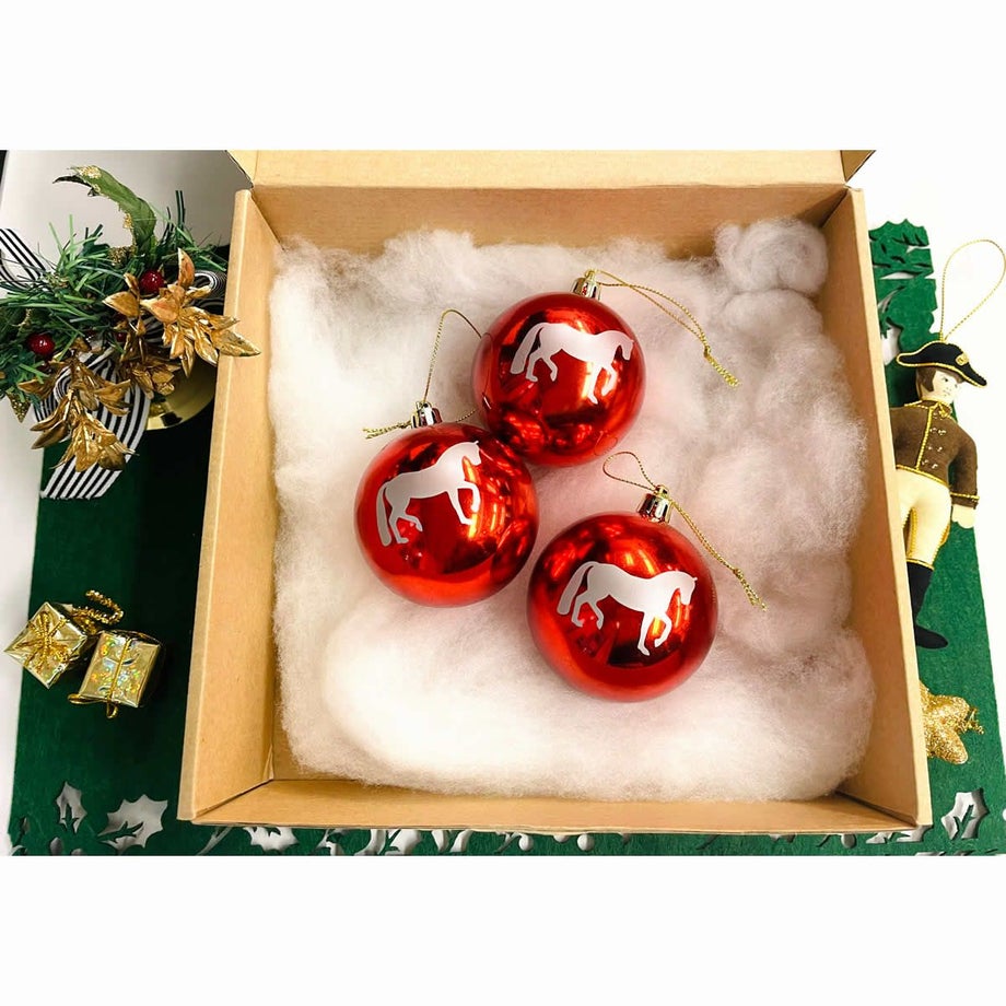 ・美しいホースモチーフが魅力的なクリスマスオーナメントボール9個セット。・ツリーやリースの装飾にピッタリなクリスマスオーナメントはレッド、ゴールド、シルバーのアソート。・クリスマスホリデーはもちろん、イベントやパーティーのデコレーションとしてもお使いいただけます。・レッドは光沢があり華やかに、ゴールドとシルバーはマットなツヤで上品な仕上がりです。・馬好きの方にオススメ。