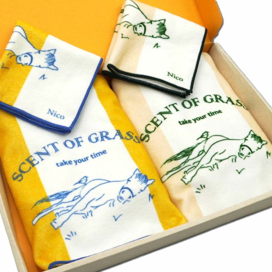 ・チャーミングな馬のNicoのイラストプリントが目を引くタオルの4枚ギフトセット。・肌にやさしいコットン100%でとてもソフト。・ビロードのようになめらかで吸水性がすぐれています。内容・Nico コットン ミニタオル「SCENT OF GRASS」 ホワイト×グリーン ×1・Nico コットン ミニタオル「SCENT OF GRASS」 ブルー×イエロー ×1・Nico コットン フェイスタオル「SCENT OF GRASS」 ホワイト×グリーン×1・Nico コットン フェイスタオル「SCENT OF GRASS」 ブルー×イエロー ×1【Nico/ニコ】かわいい馬の姿に見た人みんながニコっと笑顔になれる。Nicoをあなたの日常に。