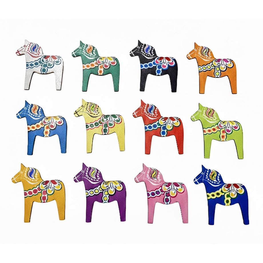 ・スウェーデンの伝統工芸をモチーフにしたダーラナホースのオーナメント。・鮮やかなカラーと繊細な模様が目を引く手描き風デザイン。・北欧らしい温かみと遊び心や木のぬくもりを感じるナチュラルな質感。・12種類の異なる色合いのホースが2個ずつセットになっており、並べても飾っても楽しいバリエーション。・季節のインテリアやギフト、パーティーデコレーションにもぴったり。・軽量で扱いやすく、壁やツリーへの吊り下げにも最適。・手のひらサイズで飾りやすいコンパクトなフォルム。