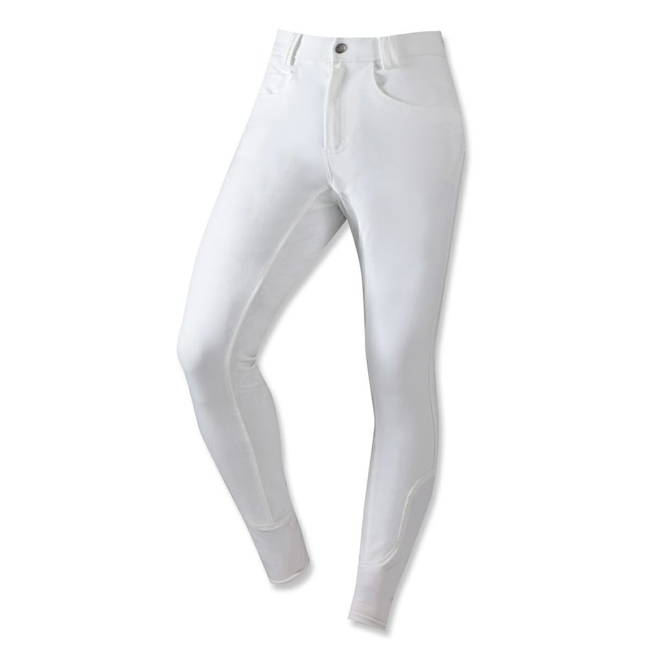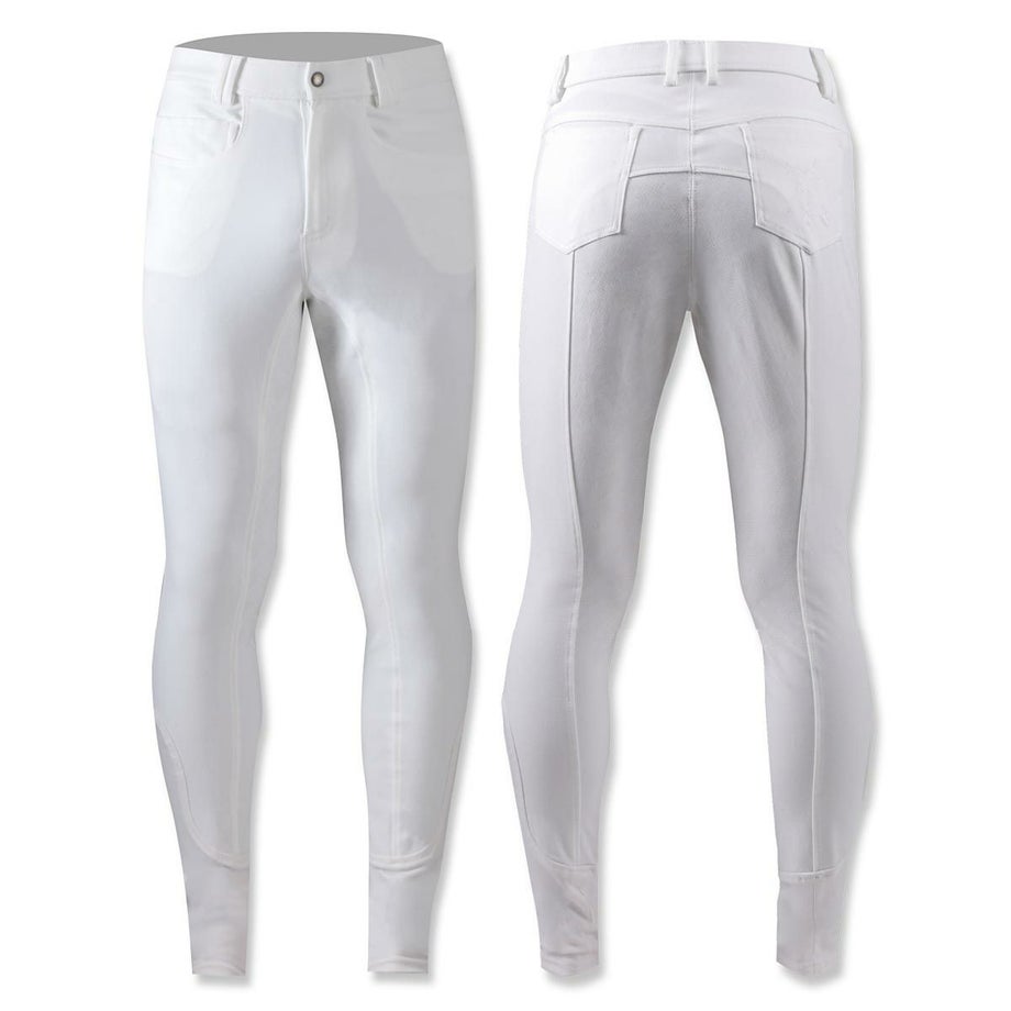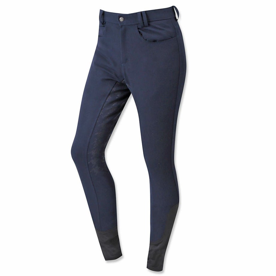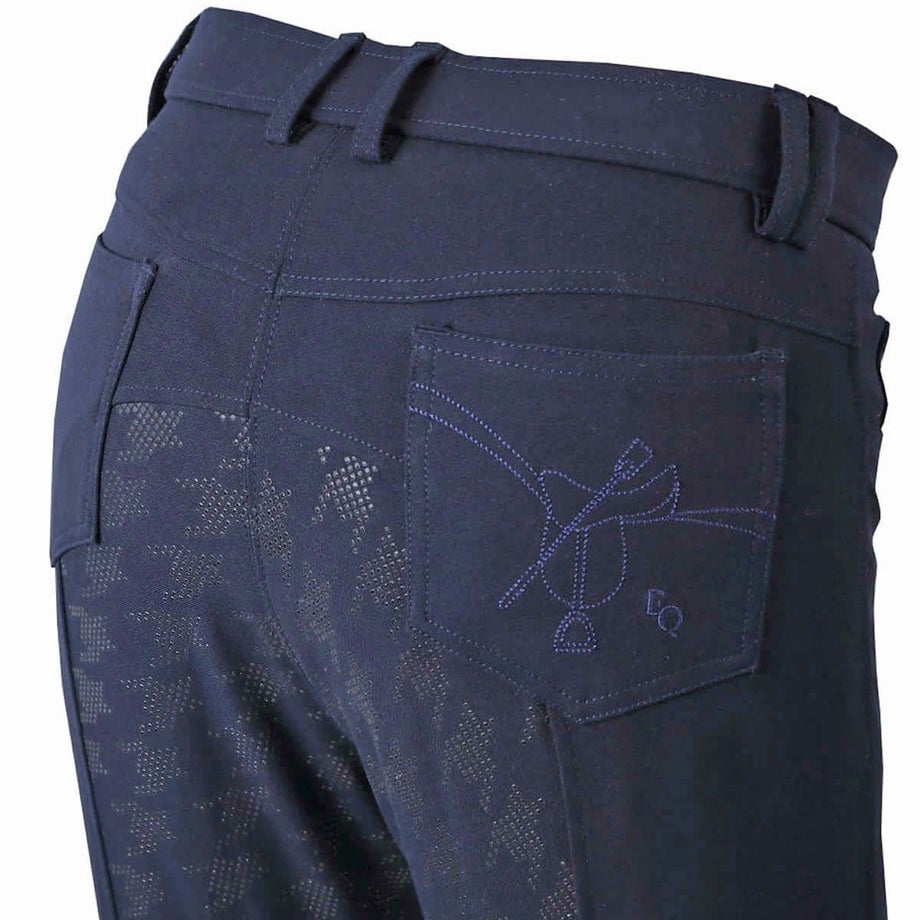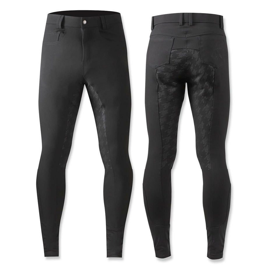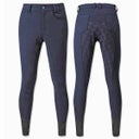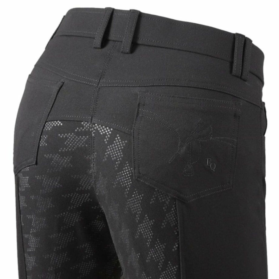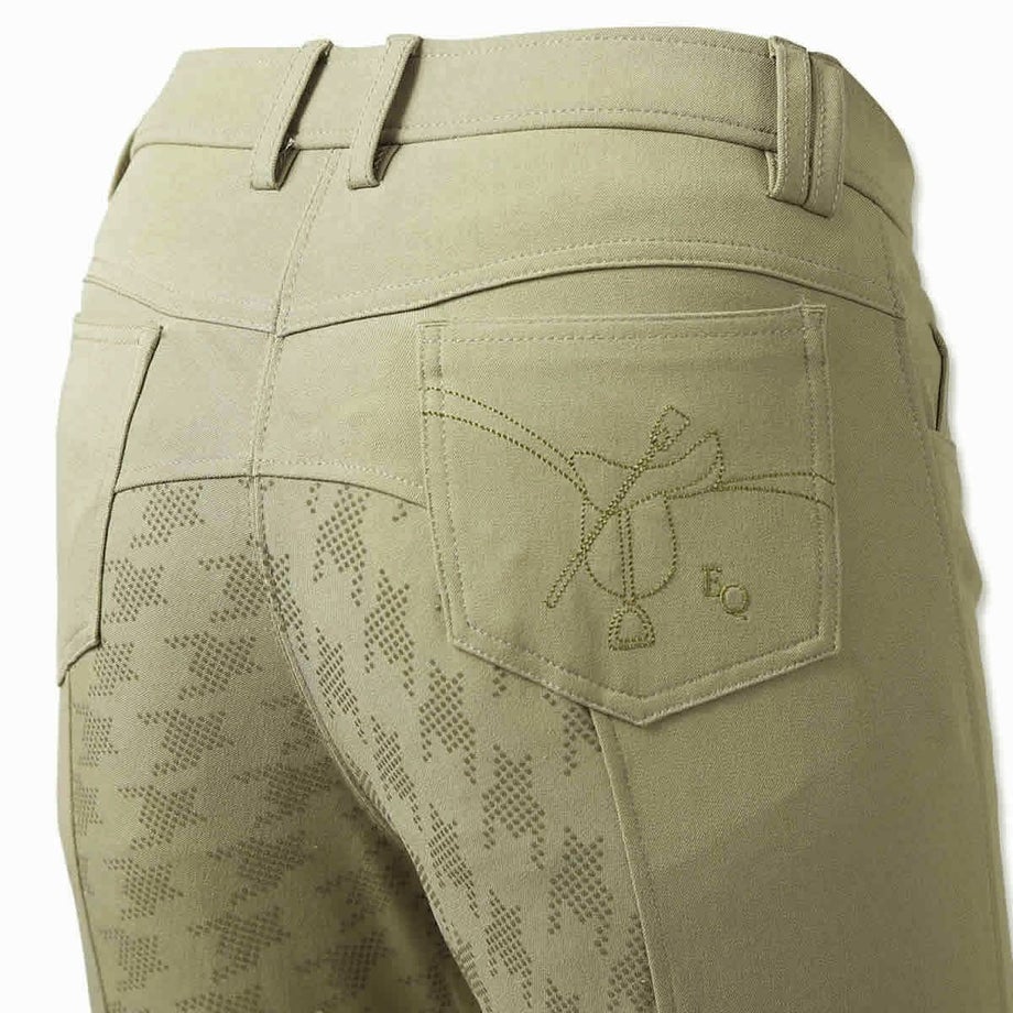 しっかりした丈夫な生地なのに伸びがよく、身体にフィットして動きやすいとユーザーから高く評価されているベストセラーのオールシーズンキュロット。コインポケットやバックポケットのステッチなどデニムっぽさを取り入れながらカジュアルすぎずシンプルで落ち着いた雰囲気。バックポケットステッチはよく見ると馬の背に乗った鞍のデザイン。さりげないこだわりです。薄すぎず厚すぎず、オールシーズン着まわせる使いやすさ。ビギナー・ベテランを問わず1着は持っていたいアイテムです。・人気のシリコングリップを採用従来の合皮タイプに比べ、グリップ力が大幅に向上し、ごわつきがなく、伸びやすく、通気性や吸汗性も高いシリコンタイプは、段違いの使いやすさと履き心地。今まで合皮だった部分が通気性の良い生地になったので、涼しさも大幅にUPしました。シリコンプリントは英国伝統のハウンドトゥース柄。エレガントでクラシックな印象のデザインです。シリコンはグリップが効きすぎると逆に使いにくくなることもあります。本製品では様々なシリコン形状をテストして、ちょうど良いグリップに調整しました。・日本人の騎乗姿勢にあったデザイン熟練デザイナーとパタンナーが、生地の特性を考慮して型紙からデザインしたキュロットは、姿勢の美しさと動きやすさを両立しました。ウエストのフロントが浅くバックが深いデザインは、騎乗時の座り込んだ姿勢でウエストをきっちりカバー。股部分を工夫してまたがりやすく、ひざ部分にゆとりをもたせ曲げやすくし、騎乗のしやすさを追及したシルエットに仕上がっています。・高い縫製技術を活かしたフィット感生産はヨーロッパ向けキュロットを手がけるメーカーが協力。長年培われた技術が活かされた縫製は耐久性とフィット感が抜群です。・素材へのこだわり生地やボタンなど全ての素材にこだわりました。ボタンは騎乗に適したものをドイツから取り寄せ。生地は国内の専門機関による厳しい試験に合格したものを採用しています。・足首周りはストレッチ素材で快適足首周りにストレッチ素材を採用。ふくらはぎまでストレッチ素材を伸ばすことで抜群のフィット感と快適な履き心地を実現しました。※フロントボタンはレディースサイズは右前、ジュニアサイズは左前となります。