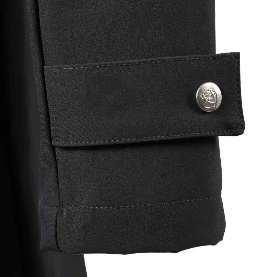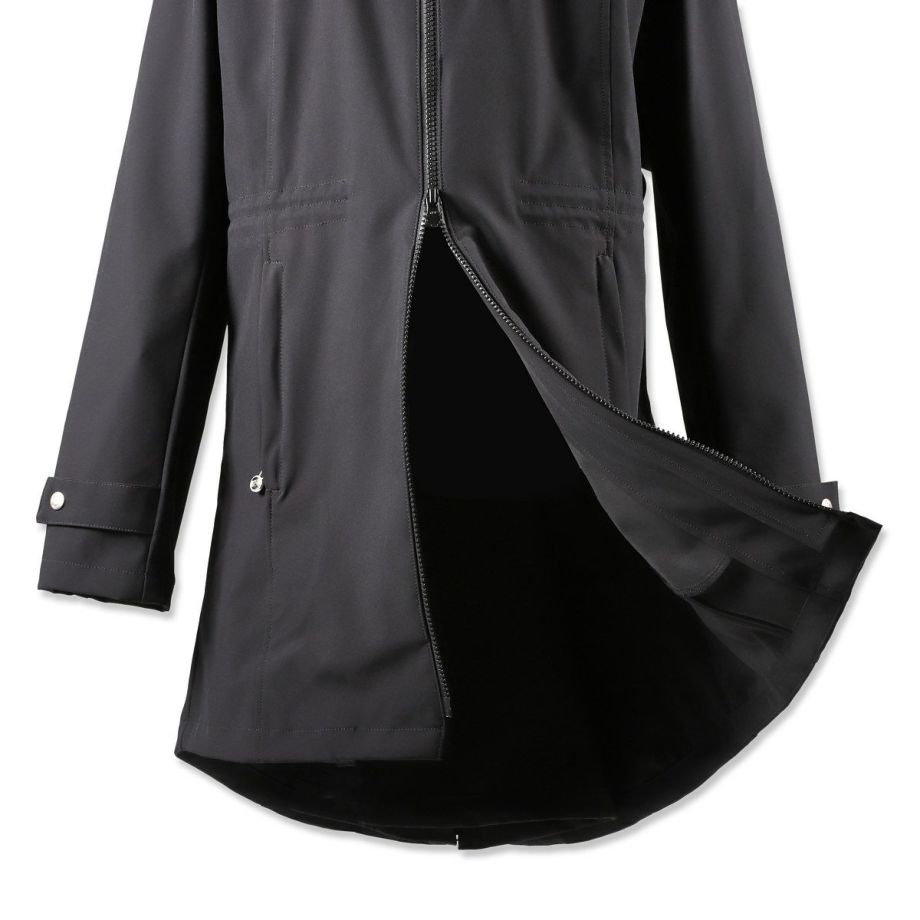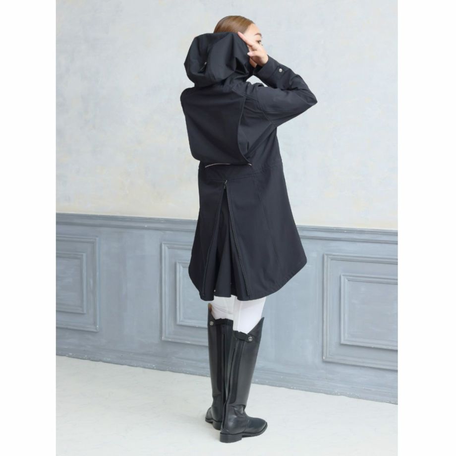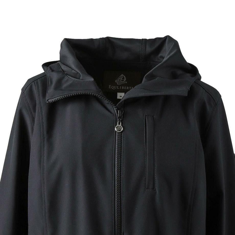 伸縮性が高く動きやすい生地とぴったりフィットするデザインは、立ち姿も騎乗姿も優雅に映えさせる逸品。撥水・透湿・防風・防汚・防花粉・UVカットなど、高機能で実用性も抜群です。・美しいシルエット横から見るとまるで燕尾服のように裾がすらりと流れ、正面からみるとフレアコートのように裾が広がる優雅なシルエット。デザイナーがこだわり抜いて仕上げたデザインです。・動きやすさを追求2WAYストレッチ生地なので動きやすく、裏地がなく軽量で疲れにくいです。前丈は膝上あたりまでの長さで足が動かしやすく、前後のファスナーを開ければ騎乗時も裾が邪魔になりません。・高機能生地2年以上の歳月をかけて開発された独自の高機能ソフトシェルファブリックを採用。雨の日には撥水、寒い冬でも防風で体温を保持、汗をかいても透湿性を確保。真夏以外は着用できるオールラウンダーな便利アイテムです。・撥水多少の雨や雪なら気にせず騎乗できます。・透湿湿気を外に逃がす生地なので汗をかいても快適。・防風防風効果のある生地だから、冬場の騎乗でもしっかり保温されます。・防汚、防花粉汚れにくい生地でメンテナンスもらくちん。ご家庭での洗濯もOK。花粉もつきにくいので花粉症の方にもおすすめです。・UVカットUPF50+の紫外線ガード機能。馬場の日差しから肌を守ります。・様々な便利機能内側のゴムベルトでウエストを絞り込むことができます。袖口のボタンで微調整ができます。大きく開くジップ式のバックスリット。スリット内側にも生地がついているので、外に出して雨から鞍をカバーすることができます。左右のジッパー付きポケットの他、左胸に縦ファスナーのミニポケットがあり、カギなどの小物入れに便利です。・高級感のあるパーツ左腕のEQULIBERTAロゴが入ったワッペンや、刻印のあるボタン、ジップ金具など高級感のあるパーツがさりげなく使われています。後ろのウエストラインを装飾するライトグレーのパイピングはうっすらと光を反射して何気に目を引きます。・乗馬以外にもサッと着れて軽くて高機能なアウターなので、乗馬以外の用途にもおすすめ。キャンプ、ロードバイク、ゴルフなどのアウトドアはもちろん、上品なデザインなので通勤などの普段使いにもおすすめです。