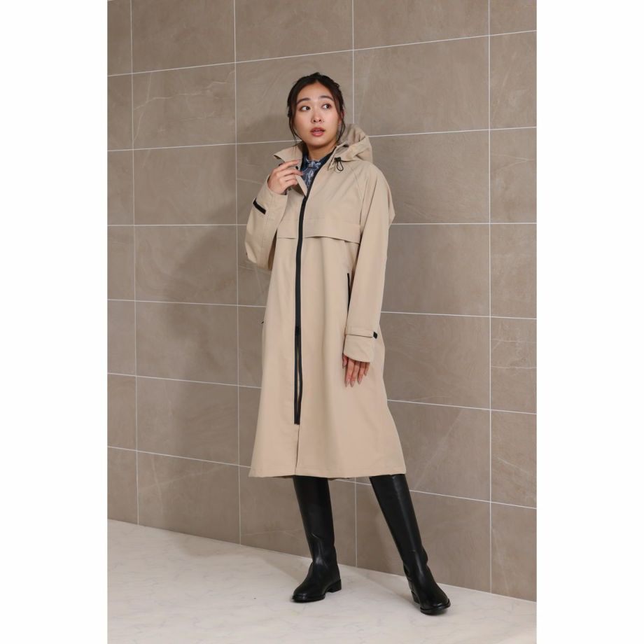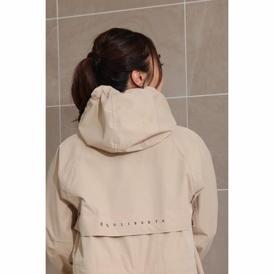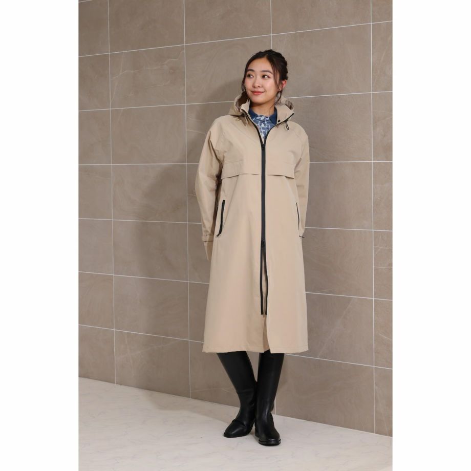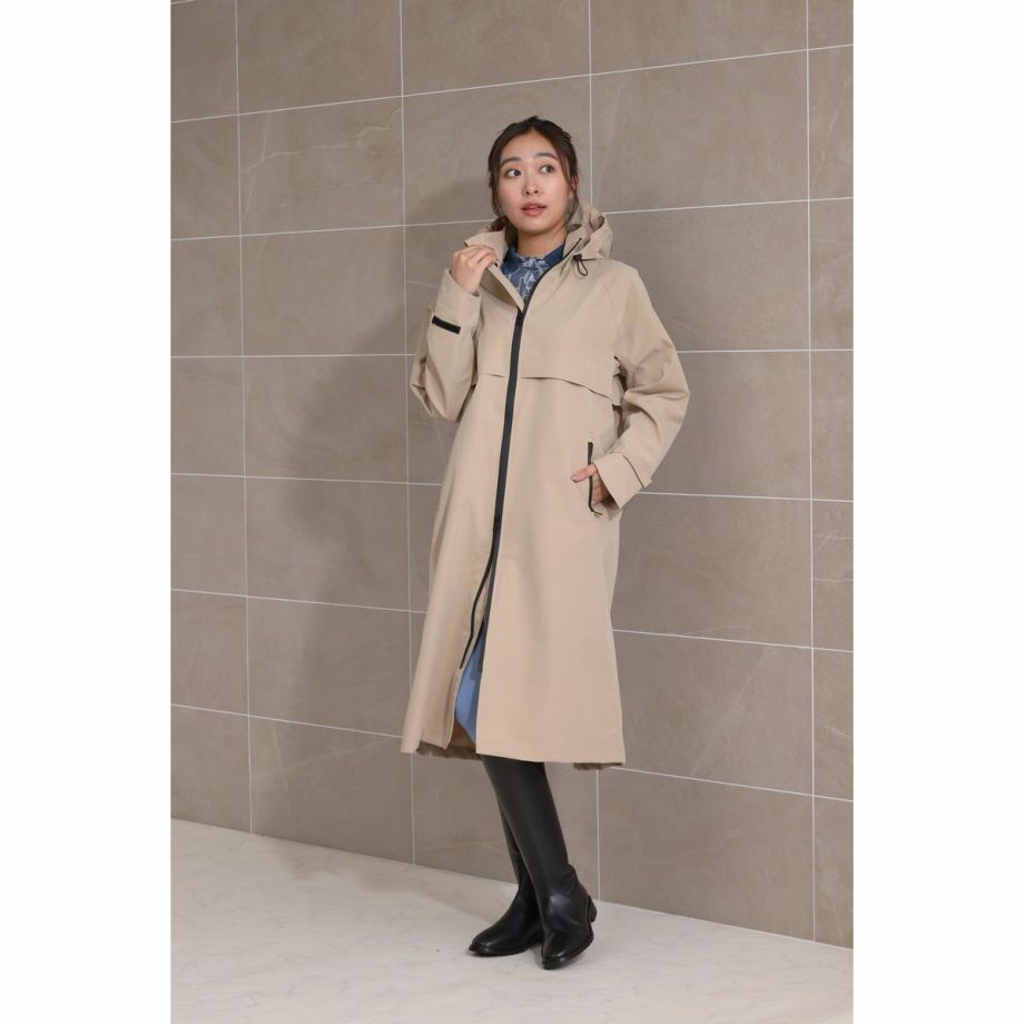 ■開発時のこだわり・レインコートといえば重い。そんなイメージを払拭すべく軽量化にこだわった製品で、ロングレインコートなのに非常に軽い着心地で動きやすく疲れにくいです。■優れた防水・撥水効果で雨をシャットアウト・耐水圧8,000㎜・特殊加工を施した生地が、雨水をしっかりと弾きます。・水滴が玉のようになり、生地に染み込むことなく滑り落ちるため、悪天候の中でもライダーを濡れから守り、集中力を維持します。■透湿性がありドライで快適な着心地雨はしっかりと防ぎながらも、レインコートの最大の課題である「ムレ」を解消します。運動などでかいた汗による湿気を外に放出し、ドライで快適な着心地を保ちます。■ファッション性へのこだわり・本体カラーにはベーシックな黒や紺ではなく、着るだけで雨の憂鬱さも和らぐような明るめのベージュをセレクト。・中央には太くスタイリッシュな黒いファスナー。・背面部分には横書きの「EQULIBERTA」ロゴがさりげなく配され、ブランドの個性を際立たせます。・男女問わず着用できるユニセックスデザインで、普段使いにも最適です。・シンプルながらも洗練されたベージュカラーは、どんな服装にも合わせやすく、急な雨の日の外出やアウトドアシーンでもおしゃれさを損ないません。・機能的ながらもタウンユースに馴染むデザインです。■より動きやすく、より快適に・肘部分にはダーツをとって、ツッパリ感を軽減。・手綱を持ったときにもできるだけ雨に濡れないようにカーブした袖口を採用。・袖口やウエストの絞りを微調整して、フィットさせることができます。・ウエストのスピンドルコードは内側に備え、スッキリと邪魔にならない設計です。・大きく開くバックスリットは内側にも生地がついているので、外に出して雨から鞍をカバーすることができます。・フロントは開閉を調節できる便利なダブルジップ。・騎乗時に裾の広がりをおさえるボタン付きの足用ループ(伸縮ゴム製)が付属、留め具が2か所にあり腿の太さによって調整可能。・フードはボタンで取り外しが可能です。・雨水が侵入しにくいジップ付きのポケット:フロント2ヶ所。・速乾性と肌ざわりを向上するメッシュの裏地。・パネルの通気孔で熱気を逃がすベンチレーション仕様。・襟元にあるループは、雨などで濡れた後にレインコートをサッとかけるのに便利です。■乗馬以外のシーンでも・動きやすく見栄えのするイージス高機能レインコートは乗馬以外の様々なシーンでも活躍します。・キャンプやフェスなどのアウトドアはもちろん、バイクや自転車でのお出かけ、雨の日の通勤などにもオススメです。
