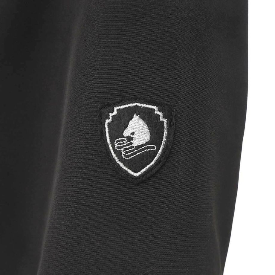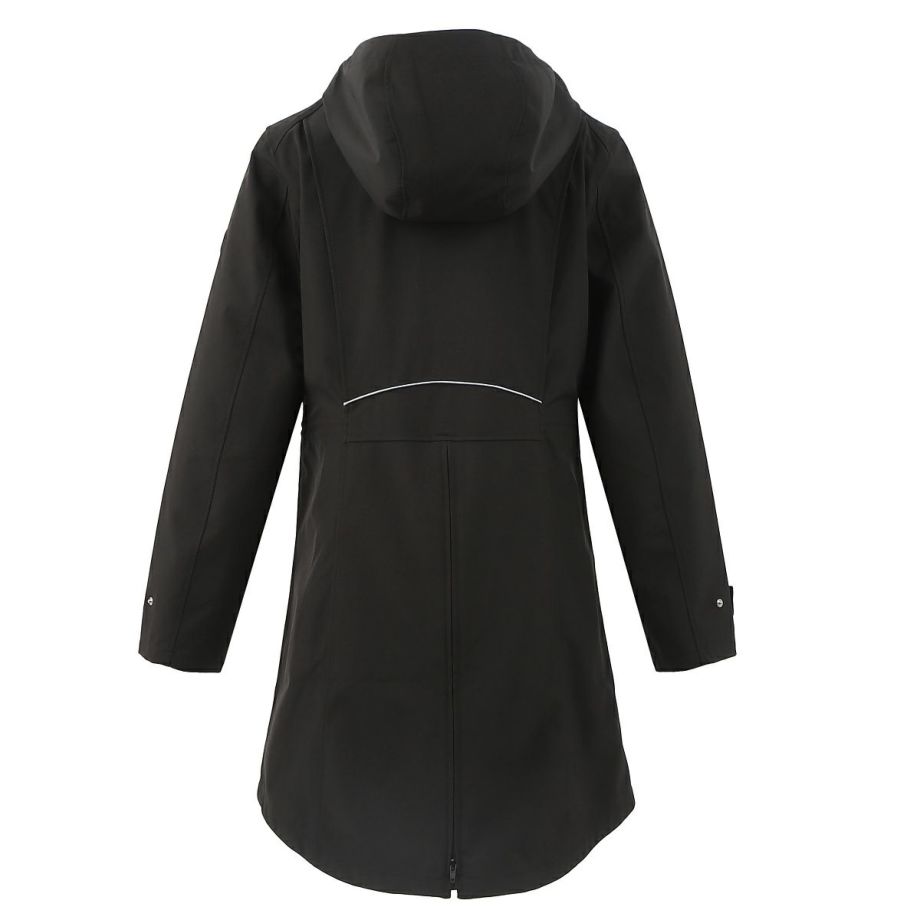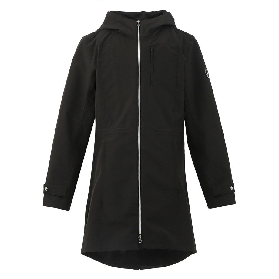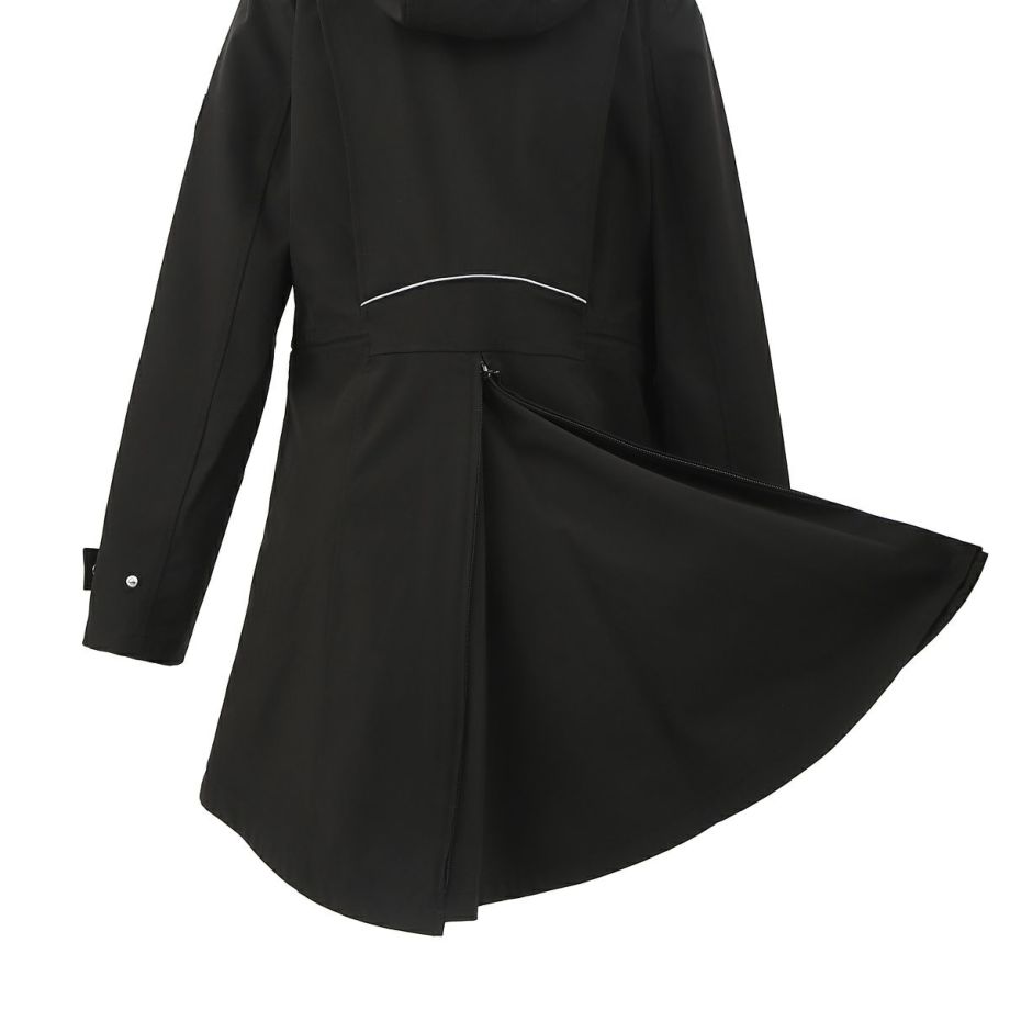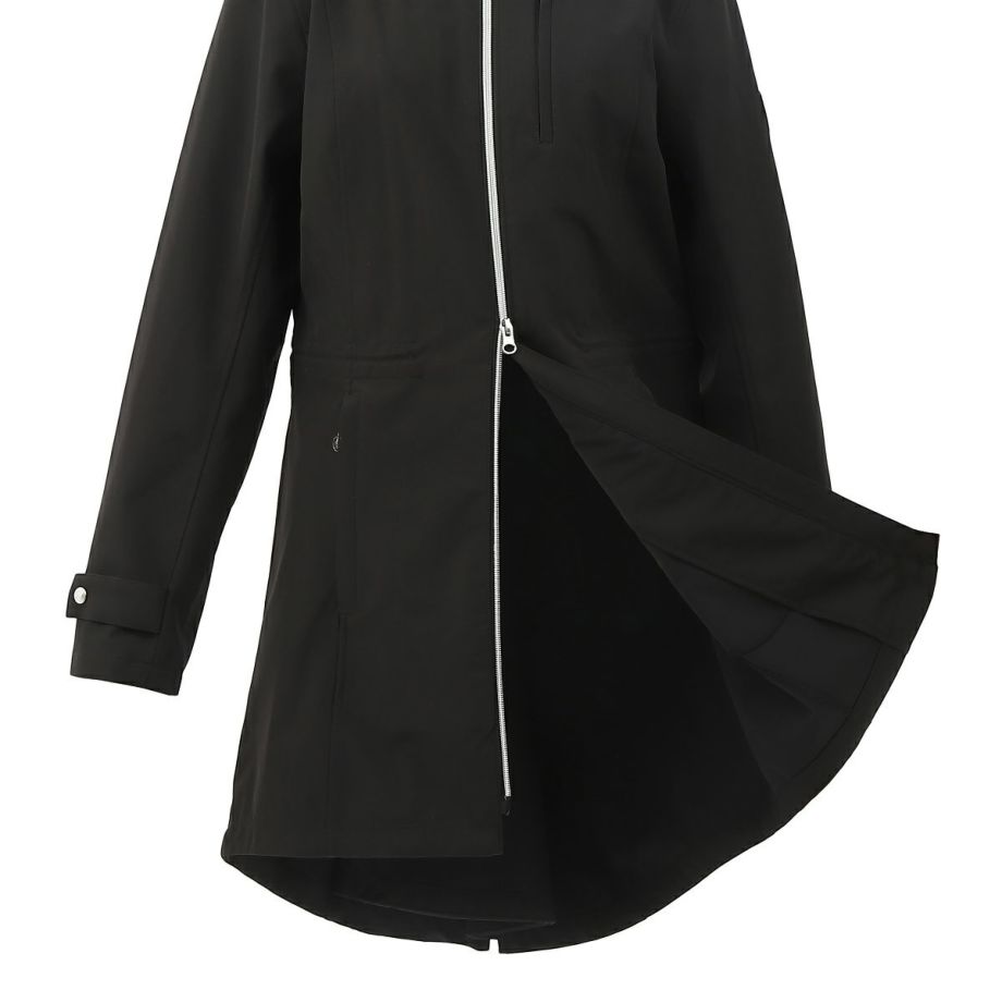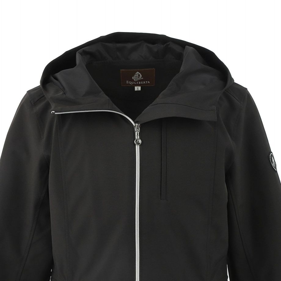 ・美しいシルエット横から見るとまるで燕尾服のように裾がすらりと流れ、正面からみるとフレアコートのように裾が広がるシルエットは、デザイナーがこだわり抜いて仕上げたデザインです。・動きやすさを追求2WAYストレッチ生地なので動きやすく、裏地がなく軽量で疲れにくいです。前丈は膝上あたりまでの長さで足が動かしやすく、前後のファスナーを開ければ騎乗時も裾が邪魔になりません。・高機能生地独自の高機能生地プライムテックソフトシェルを採用。雨の日には撥水、寒い冬でも防風で体温を保持、汗をかいても透湿性を確保。真夏以外は着用できるオールラウンダーな便利アイテムです。・撥水機能多少の雨や雪なら気にせず騎乗できます。・透湿湿気を外に逃がす生地なので汗をかいても快適。・防風防風効果のある生地だから、冬場の騎乗でもしっかり保温されます。・防汚、防花粉汚れにくい生地でメンテナンスもらくちん。ご家庭での洗濯もOK。花粉もつきにくいので花粉症の方にもおすすめです。・UVカット紫外線カット機能により、馬場の日差しから肌を守ります。・様々な便利機能内側のゴムベルトでウエストを絞り込むことができます。袖口のボタンで微調整ができます。大きく開くジップ式のバックスリット。スリット内側にも生地がついているので、外に出して雨から鞍をカバーすることができます。左右のジッパー付きポケットの他、左胸に縦ファスナーのミニポケットがあり、カギなどの小物入れに便利です。・高級感のあるパーツ左腕のEQULIBERTAロゴが入ったワッペンや、刻印のあるボタン、ジップ金具など高級感のあるパーツがさりげなく使われています。後ろのウエストラインを装飾するライトグレーのパイピングはうっすらと光を反射して目を引きます。・乗馬以外にもサッと着れて軽くて高機能なアウターなので、乗馬以外の用途にもおすすめ。キャンプ、ロードバイク、ゴルフなどのアウトドアはもちろん、上品なデザインなので通勤などの普段使いにもおすすめです。
