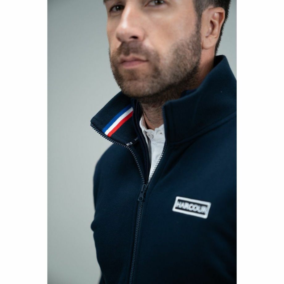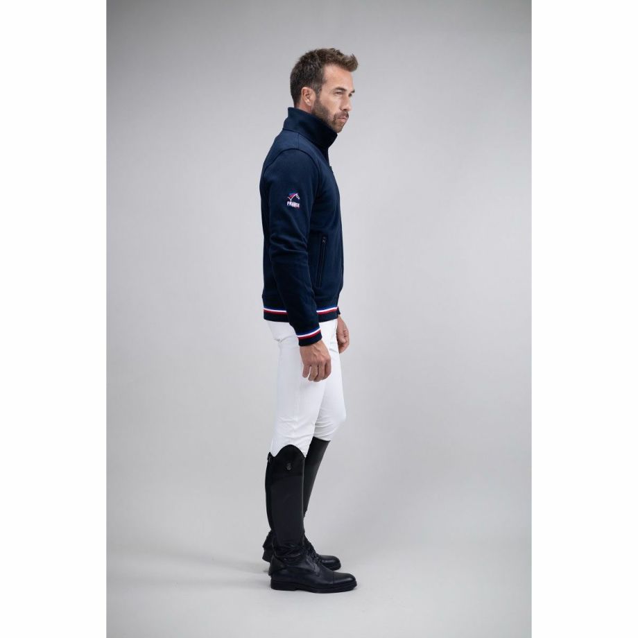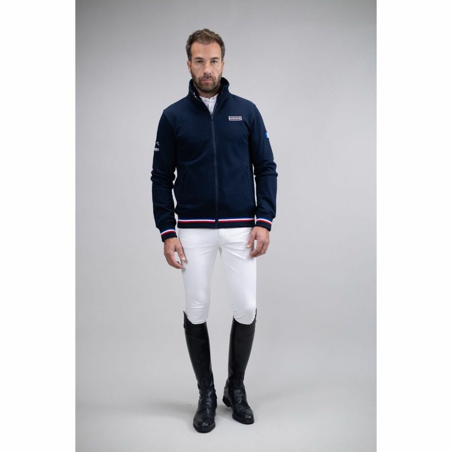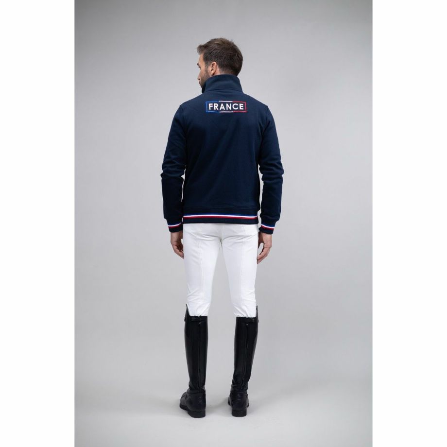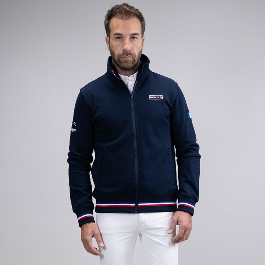 ・フランスをテーマにした限定コレクション。・ゆったりとしたシルエットで、リラックスした着心地。・体型を気にせず幅広い年齢層にマッチするデザイン。・インナーにシャツなどを重ね着しても、もたつかないシルエット。・貴重品や小物の収納に便利なジッパー付きポケット。・着脱が容易なフロントジップタイプで温度調節も簡単。・フランス国旗をモチーフにしたデザインでバックスタイルも印象的。・袖口と裾に配したトリコロールのリブ編みが、落ち着いたネイビーカラーのアクセントに。・混紡素材で肌触りが良く、適度な保温性と吸湿性を提供。
