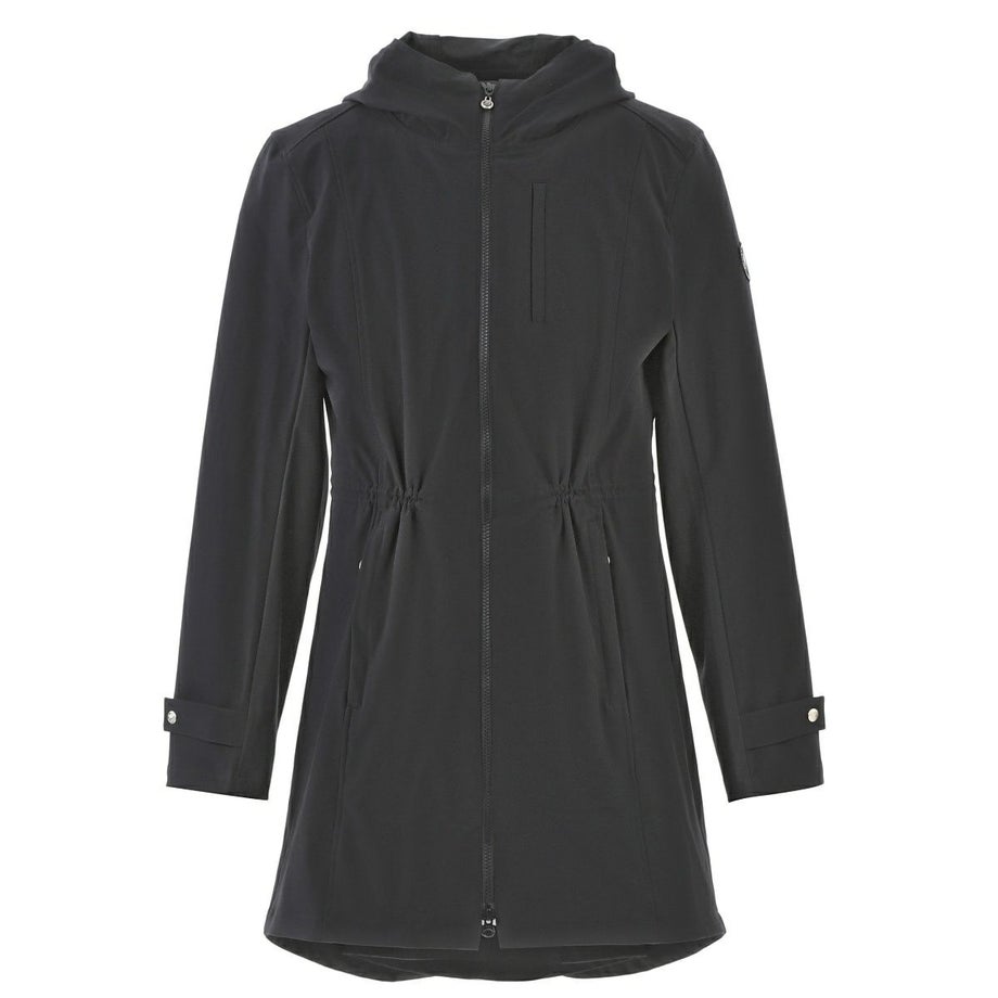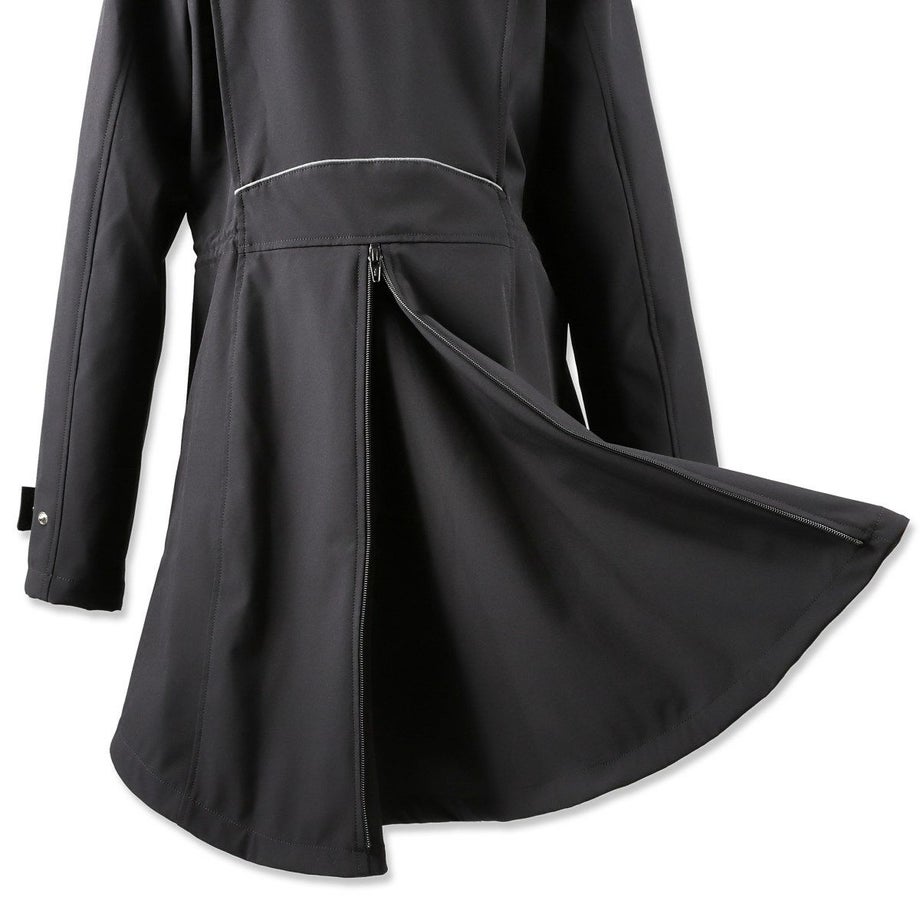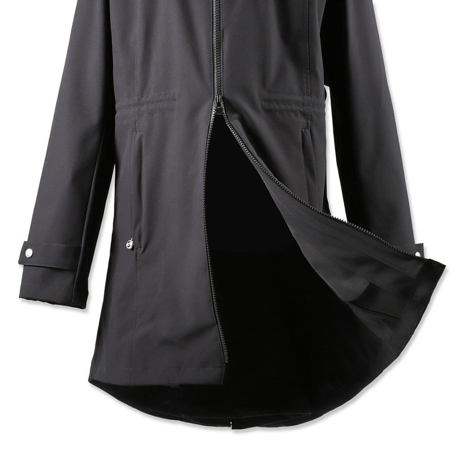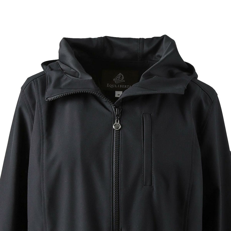騎乗時はもちろん、あらゆるアウトドアで活躍する乗馬用のロングテールジャケット。伸縮性が高く動きやすい生地とカラダに沿ってフィットするデザインなので騎乗時のパフォーマンスもUP。撥水・透湿・防風・防汚・防花粉・UVカットなど、高機能で実用性も抜群です。・洗練された佇まい横から見るとまるで燕尾服のように裾がすらりと流れ、正面からみるとフレアコートのように裾が広がります。気品が感じられ、スタイルがよく見えるようにデザイナーがこだわり抜いて仕上げたデザインです。・動きやすさを追求2WAYストレッチ生地なので動きやすく、裏地がなく軽量で疲れにくいです。前丈は膝上あたりまでの長さで足が動かしやすく、前後のファスナーを開ければ騎乗時も裾が邪魔になりません。・高機能生地2年以上の歳月をかけて開発された独自の高機能ソフトシェルファブリックを採用。雨の日には撥水、寒い冬でも防風で体温を保持、汗をかいても透湿性を確保。真夏以外は着用できるオールラウンダーな便利アイテムです。・撥水多少の雨や雪なら気にせず騎乗できます。・透湿湿気を外に逃がす生地なので汗をかいても快適。・防風防風効果のある生地だから、冬場の騎乗でもしっかり保温されます。・防汚、防花粉汚れにくい生地でメンテナンスもらくちん。ご家庭での洗濯もOK。花粉もつきにくいので花粉症の方にもおすすめです。・UVカットUPF50+の紫外線ガード機能。馬場の日差しから肌を守ります。・様々な便利機能内側のゴムベルトでウエストを絞り込むことができます。袖口のボタンで微調整ができます。大きく開くジップ式のバックスリット。スリット内側にも生地がついているので、外に出して雨から鞍をカバーすることができます。左右のジッパー付きポケットの他、左胸に縦ファスナーのミニポケットがあり、カギなどの小物入れに便利です。・高級感のあるパーツ左腕のEQULIBERTAロゴが入ったワッペンや、刻印のあるボタン、ジップ金具など高級感のあるパーツがさりげなく使われています。後ろのウエストラインを装飾するライトグレーのパイピングはうっすらと光を反射して何気に目を引きます。・乗馬以外にもサッと着れて軽くて高機能なアウターなので、乗馬以外の用途にもおすすめ。キャンプ、ロードバイク、ゴルフなどのアウトドアはもちろん、上品なデザインなので通勤などの普段使いにもおすすめです。
