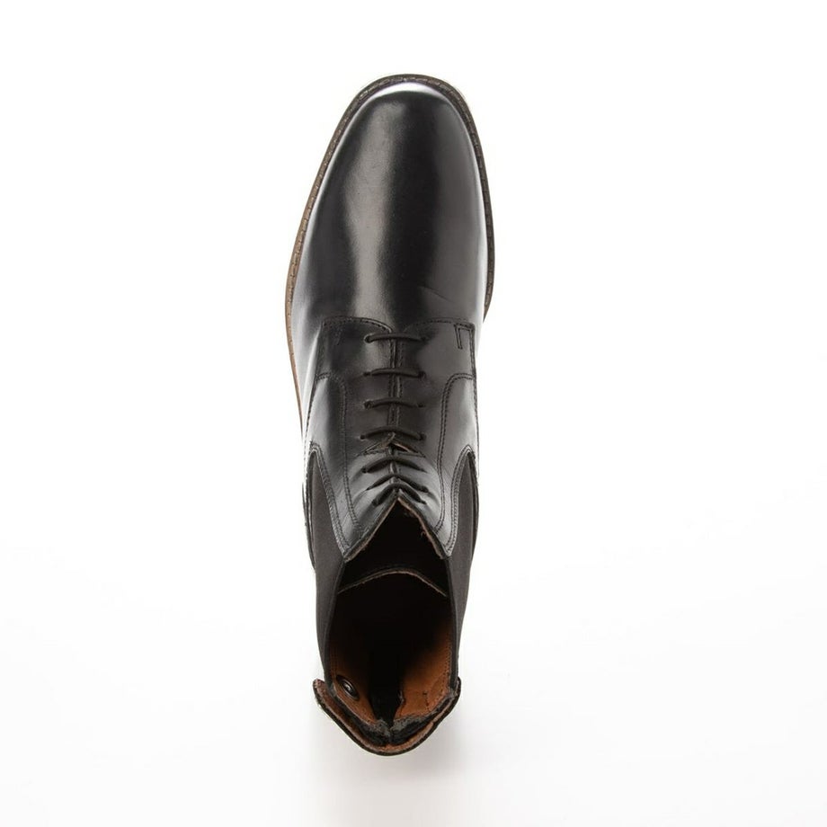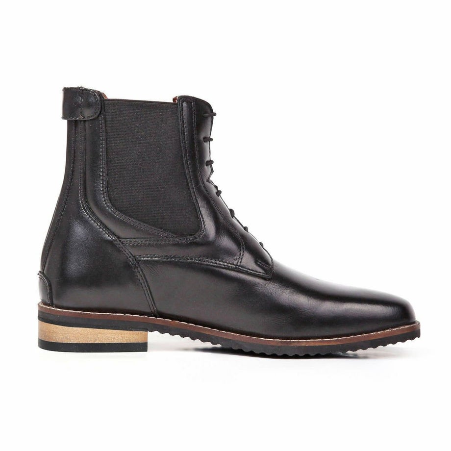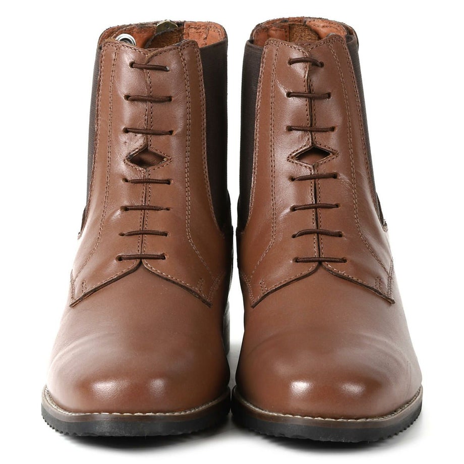 足にフィットしやすく脱ぎ履きも楽な本革ショートブーツです。日本人にあわせたサイズ感と伸縮素材でフィット感も◎。シンプルで上品なデザインだから、乗馬だけでなく普段でも使えるアイテムです。・日本人の足にフィット長年日本人向けの乗馬用品を製造してきたEQULIBERTAのノウハウで、日本人にあわせたサイズに調整。さらに伸縮素材の靴紐とサイドゴアだから足にぴったりとフィットします。・脱ぎ履きしやすいかかと側にファスナーが付いているので紐をほどかずに脱ぎ履き出来ます。固定された靴紐が伸縮する構造なので靴紐調整も不要で、騎乗中に紐がほどける心配もありません。・タウンユースにもおすすめシャープなトゥ(つま先)は都会的に洗練された雰囲気。普段履きでも絵になるスタイルです。また高級感のあるロゴ入りボタンは馬モチーフのロゴがさりげなく乗馬をアピール。コバのステッチやミッドソールのブラウンが控えめな差し色となり、地味すぎず上品に遊び心を取り入れたデザインに仕上がっています。・丈夫で使うほどに馴染む本革外側は丈夫でしなりがあり、やや光沢のある牛革。内側はソフトで通気性がよく肌触りの良い豚革です。・老舗工場が生産に協力長年ドイツや英国向けに乗馬ブーツを生産してきた工場が製造に協力。何度もサンプルの修正を繰り返して長い歳月を掛けて完成しました。