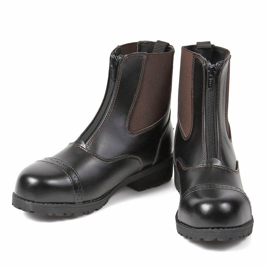 つま先が鉄製のキャップで保護された乗馬用セーフティブーツ。乗馬では馬に足を踏まれての怪我が多いですが、こちらのブーツはつま先が保護されているので馬に踏まれても大丈夫です。セーフティブーツは重くて動きづらいことはありますが、馬装、お手入れの時などに馬に踏まれそうで不安…という方にオススメです。・チャップスと組み合わせて騎乗にも履いていただけます。・ソールはゴム製で雨の日にも滑りにくい形状となっています。・サイドゴアタイプで足首部分がゴムの伸縮性でピッタリフィットします。・長年安全靴を製作してきた信頼性の高い日本メーカーの製品。日本人の足の形にもフィットしやすいです。・幅広、甲高のワイドサイズにリニューアルしました。・新たにサイズも増え、豊富なバリエーションからぴったりのサイズをお選びいただけます。