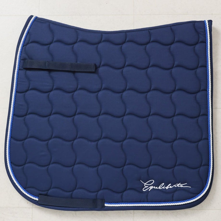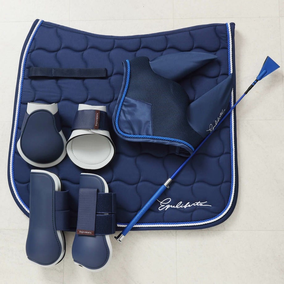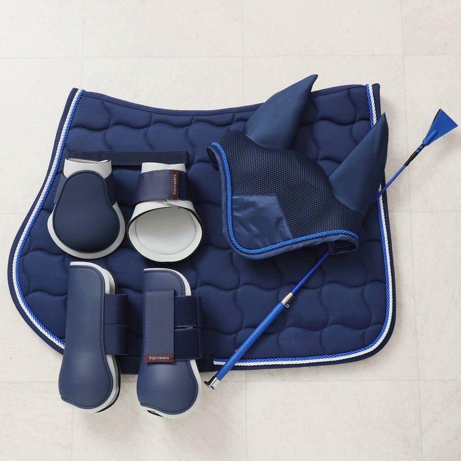 【短鞭】・光沢のあるグリップエンドにブランドロゴデザインが高級感のある短鞭。・「EQULIBERTA」のエンボス加工が施されたグリップもプレミアムな雰囲気。・同デザインで長鞭もあります。・グリップにストラップホールがあるのでチャームやキーホルダーが取り付けられます。・チャームやキーホルダーなどを取り付けると目印になって、よくあるムチの取り間違え防止にも。・JODHPURS ムチ用リストバンドも取り付けしやすい。【サドルパッド】・上品さが際立つ、クラシックなキルティングデザイン。・馬体にやさしくフィットし、クッション性に優れた快適な乗り心地。・ネイビー×ホワイトのブレードパイピングが、洗練された印象を演出。・同系色のイヤーネットや馬具とのコーディネートも可能。・さりげないロゴ刺繍入りと、シンプルな無地タイプからお選びいただけます。【イヤーネット】・馬の耳を虫や騒音から守る、実用性とデザイン性を兼ね備えたイヤーネット。・通気性の良いメッシュ素材で、暑い季節でも快適な着け心地。・耳部分はやわらかくフィットし、違和感を与えにくい設計。・ネイビーの落ち着いたカラーに、上品なコードトリミングがアクセント。・普段使いだけでなく競技会にも映える、シンプルかつ洗練されたスタイル。【プロテクター】・練習用から試合用まで幅広く使えるコスパの高い定番プロテクターの登場です。・内側は厚手で弾力の高いネオプレン、外側はプラスチックのように硬いTPUで繊細な馬の脚をしっかり保護します。・強力なダブルベルクロでしっかり装着できるので、障害飛越などの激しい動きでもずれずに固定。・丈夫な素材で丸ごと水洗いできるのも嬉しいポイント。泥馬場でも気にせず使えます。