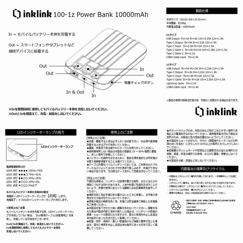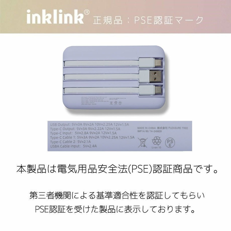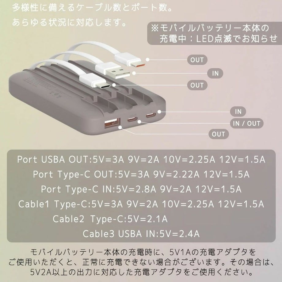・キュートな馬の姿が人気の「Nico」デザインのモバイルバッテリー。・大容量(10,000mAh)なのに19.5ミリという薄型・軽量で持ち運びに最適。・センスが出せるファッショナブルなカラーバリエーション。・超マット加工で手ざわりが良く、プレミアムな質感と耐久性が特徴。・残量表示はかわいさとシンプルさを追求した4段階LEDランプ。・サイドボタンを押すと残量確認ができます。 4点灯:100~76% 3点灯:75~51% 2点灯:50~26% 1点灯:25~6% 1点滅:5%以下・モバイルバッテリー本体充電中はLED点滅でお知らせします。充電完了時は4つのLEDランプが点灯します。・PD(Power Delivery)対応でデバイスを急速充電可能。・スマート充電機能により、デバイスの状態を自動で検知、最適な速度で安全に充電します。・満充電に近づいた際には、自動的に低速充電に切り替わり、バッテリーの寿命を保護します。・PSEマーク(電気用品安全法)認証商品です。付属品:本体×1、日本語説明書内臓ケーブル:Type-C(OUT)×2、USBA(IN)×1ポート:Type-C(IN)×1、Type-C(IN/OUT)×1、USBA(OUT)×1【Nico/ニコ】かわいい馬の姿に見た人みんながニコっと笑顔になれる。Nicoをあなたの日常に。《充電方法について》モバイルバッテリー本体の充電時に、5V1Aの充電アダプタをご使用いただくと、正常に充電できない場合がございます。その場合は、5V2A以上の出力に対応した充電アダプタをご使用ください。《安全上の注意》不適切な使用は、モバイルバッテリーの故障や重大な発熱、さらには火災や爆発につながる恐れがあります。人体や財産に危害を及ぼすことがないよう、保管や使用にあたっては以下の事項を厳守してください。・事故を防ぐ為お子様の手の届かないところに保管し、お子様に使用させたり遊ばせたりしないでください。・感電や電池の破損を防ぐ為、充電には安全基準に準拠した充電器をご使用ください。・本製品を落下させたり強い衝撃を与えないでください。衝撃を与えた場合や製品内部に液体が侵入した場合は、バッテリーや回路の損傷、ショートの原因になりますので、直ちに使用を中止し各自治体の指示に従った方法で正しく廃棄してください。・膨張、変形、液漏れ、著しい容量減少など機器に異常が生じた場合は、直ちに使用を中止し各自治体の指示に従った方法で正しく廃棄してください。・ポケットやバッグの中、布団の中など熱がこもりやすい場所で充電および蓄電を行なわないでください。長時間充電を行なう場合は放熱のため、本製品と他の危機を重ねないようにしてください。・本製品をショートさせたり、水や火(調理機やヒーターなどの熱源の近くを含む)にさらしたり60℃以上の高熱にさらしたりしないでください。・自動車のダッシュボードや窓際などの直射日光の当たる場所での保管、高温、多湿の場所での使用、ならびに蓄電、保管はしないでください。・本製品を分解、改造などをしないでください。《使用上のご注意》・充電、蓄電するときは必ず人がいる状態で行い、外出時や長時間放置するときはプラグを抜いてください。・蓄電、充電完了後は速やかにケーブルを取り外してください。・長時間使用しない場合は本製品の容量を25~50%程度に蓄電し、涼しい場所で保管してください。・モバイルバッテリーを長持ちさせるために、製品を満充電または未充電の状態で長期間保管することは避けてください。・ご利用中のスマホケースなどによってはコネクタが奥まで差し込めず、充電ができない場合があります。その際はケースを外して充電を行なってください。