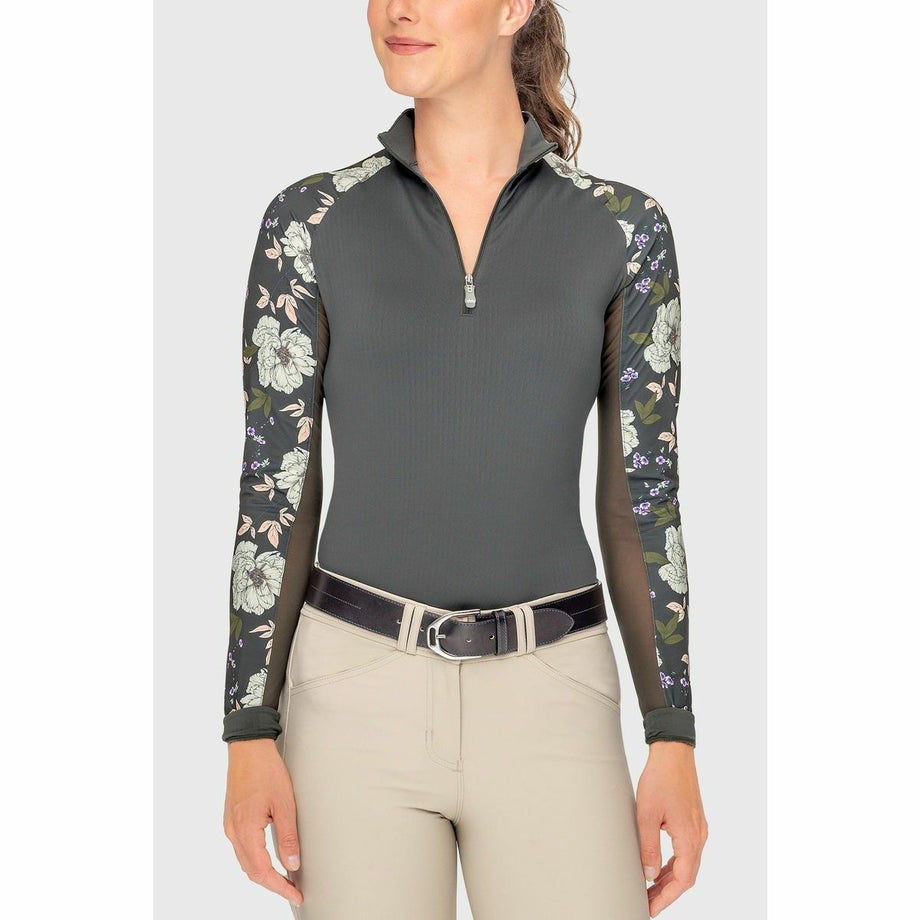 ・スレートグレーが基調のガーデンローズ柄で、華やかさと上品さを演出。・動きやすく美しいラインで、騎乗スタイルをスマートに演出。・紫外線カット機能で、屋外での長時間の騎乗でも安心。・袖部分に通気性の高いパワーメッシュを採用し、快適な着心地を実現。・柔らかな4方向ストレッチ素材で、乗馬の動きに合わせて自由にフィット。・抗菌防臭機能付きで、汗をかいても清潔さを保ち快適。・1/4ジップのスタンドカラー仕様で、首元の通気性を調整可能。・体のラインを美しく見せる、現代的で女性らしいシルエット。・シャツをパンツに入れても出してもバランスよく着こなし可能。
