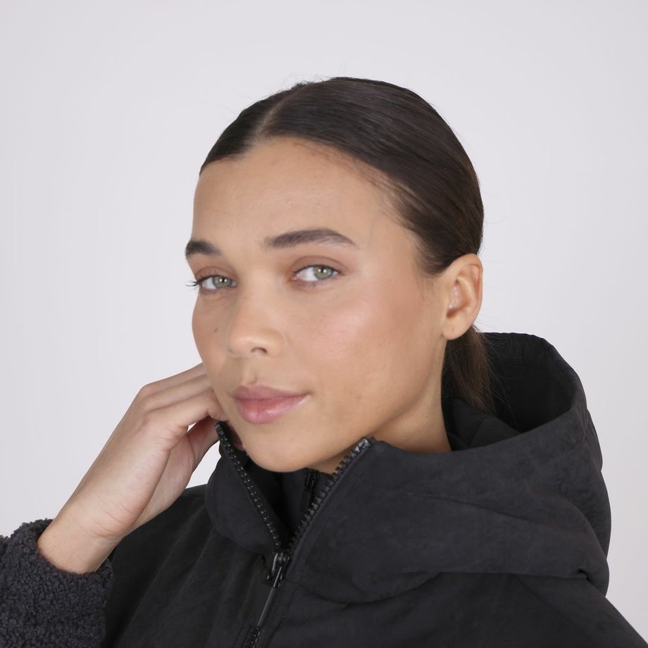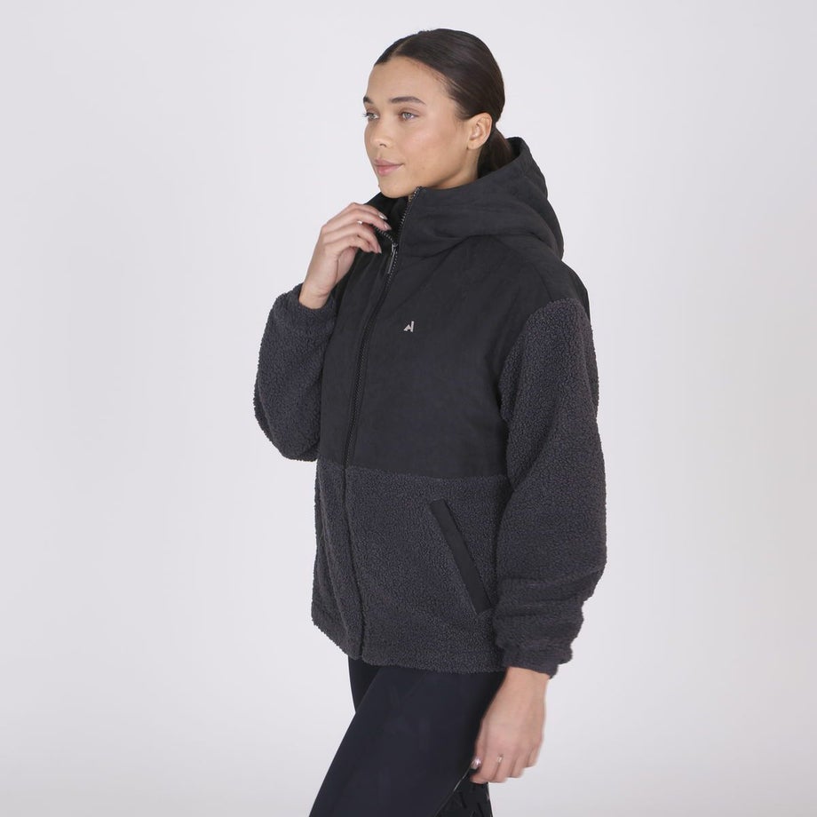 ・着やすさと暖かさを兼ね備えた、寒い季節にぴったりのレイヤージャケット。・柔らかなシェルパフリース素材が心地よく、包み込まれるような着用感。・上半身にはやさしくなめらかな肌ざわりの生地を使用、上品な印象に。・リラックス感のあるオーバーサイズフィットで、スポーティかつカジュアルな雰囲気。・フルジップ仕様で着脱しやすく、気温やシーンに合わせた調整も簡単・フードと裾にはドローコード付きで、フィット感の調整が可能。・小物の収納に便利なジッパー付きポケットを3か所に配置。・撥水性、防風性、吸湿速乾性を備え、アクティブなシーンでも快適。・乗馬はもちろん、タウンユースやアウトドアにもおすすめの一着。