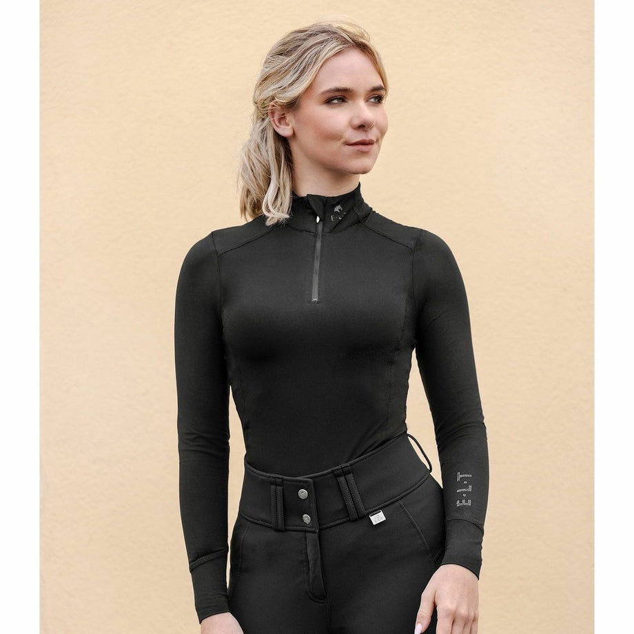 ・ソフトでなめらかな肌触りの素材で、快適な着心地を提供。・通気性・伸縮性に優れ、動きやすさも抜群。・縫製やディテールにこだわった、すっきりとしたスマートな仕上がり。・ハイカラーの襟元はファスナー開閉式で、着脱もスムーズ。・袖口にはラインストーンのロゴ入りで、さりげない華やかさを演出。・コンパクトなシルエットで、すっきりとした印象。