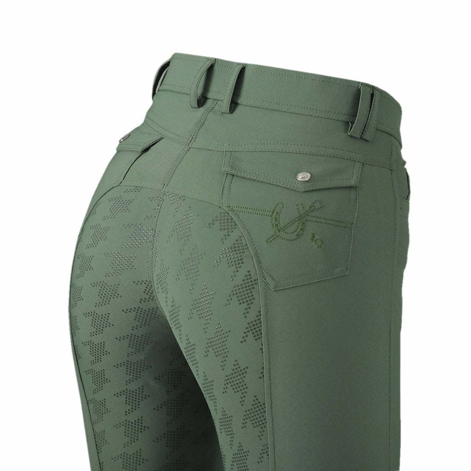 コインポケットやバックポケットのステッチなどデニムっぽさを取り入れながらカジュアルすぎずシンプルで落ち着いた雰囲気。バックポケットのムチ&蹄鉄ステッチがさりげなくオシャレです。通気性が高く肌触りもさらりとした生地だから、暑い夏でも快適。さらに吸水速乾、接触冷感、UVカットなど夏場に役立つ様々な機能を持っています。通気性や吸汗性、グリップ力も高いシリコンタイプなので涼しさと乗りやすさが従来の尻革タイプから大幅にアップしています。・夏の乗馬に快適な涼しさを毎年大好評の夏用キュロット生地を引き続き採用。非常に通気性が高い生地は、汗が蒸発しやすく身体の熱を外に排出します。張りがありさらりとした肌触りの生地は、汗をかいてもベタ付かず快適。ひんやりとした肌触りの接触冷感機能付きです。暑さや汗から開放されて快適に騎乗に集中できるキュロットは、夏のベストパートナーです。・人気のシリコングリップを採用従来の合皮タイプに比べ、グリップ力が大幅に向上し、ごわつきがなく、通気性や吸汗性も高いシリコンタイプは、段違いの使いやすさと履き心地。今まで合皮だった部分が通気性の良い生地になったので、涼しさも大幅にUPしました。シリコンプリントは英国伝統のハウンドトゥース柄。エレガントでクラシックな印象のデザインです。シリコンはグリップが効きすぎると逆に使いにくくなることもあります。本製品では様々なシリコン形状をテストして、ちょうど良いグリップに調整しました。・日本人の騎乗姿勢にあったデザインウエストのフロントが浅くバックが深いデザインは、騎乗時の座り込んだ姿勢でウエストをきっちりカバーします。生地の特性を考慮して熟練パタンナーがデザインしたキュロットは、姿勢の美しさと動きやすさを両立しました。・高い縫製技術を活かしたフィット感生産はヨーロッパ向けキュロットを手がけるメーカーが協力。長年培われた技術が活かされた縫製は耐久性とフィット感が抜群です。・素材へのこだわり生地やボタンなど全ての素材にこだわりました。ボタンは騎乗に適したものをドイツから取り寄せ。生地は専門機関で百貨店並みの厳しい試験に合格したものです。