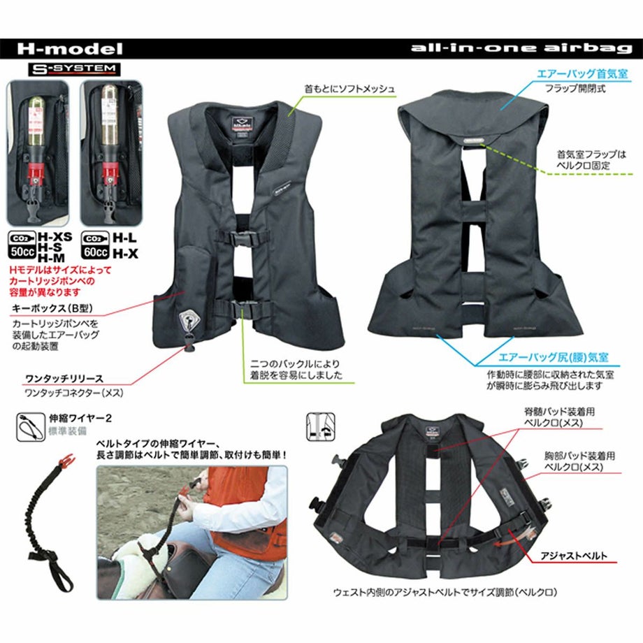 乗馬クラブからのアドバイスを元に改良されたモデル。落馬時に打ちやすいヒップまわりまでカバーした形状に進化しました。多くの乗馬クラブで推奨されているモデルです。①乗馬クラブ協力の元、デザインしなおした安全性の高いモデルです。②ヒップの左右までエアバッグが出るようになっています。落馬時にお尻の左右を負傷することが多いため、その部分もカバーしています。③エアバッグチューブの固定をボタンから柔軟なベルクロに変更したのでエアのふくらみが早くなっています。・落馬などで馬からライダーが飛ばされた瞬間にエアーバッグが作動し、首、背中、胸、脇、尻を守ります。・SHOCK-BUFFERING SYSTEM(衝撃緩和保護システム)は、ライダーが馬から”一定の距離”を離れた瞬間にキーボールが抜け、キーボックスが作動しカートリッジボンベより炭酸ガスが首気室、胸気室、背中気室、尻気室へと送り込まれます、エアーバッグが瞬時に膨張し人体への衝撃を緩和するシステムです。・作動から展開に至るまでにも衝撃緩和効果を発揮します。・エアーバッグは最大限に膨らんだ後、徐々に炭酸ガスが抜ける仕組みになっています。(息苦しい場合は、脱衣して圧迫を解消してください)・別売りのCO2カートリッジボンベに交換することで、何度でも繰り返しお使い頂けます。【メーカー保証・メンテナンスサービスについて】・メーカー1年保証が付いています。商品同封の保証書とご購入時の納品書やレシートを大切に保管下さい。・メーカーで実施している保証やサービスについては製造元の無限電光株式会社へ直接お問い合わせ下さい。