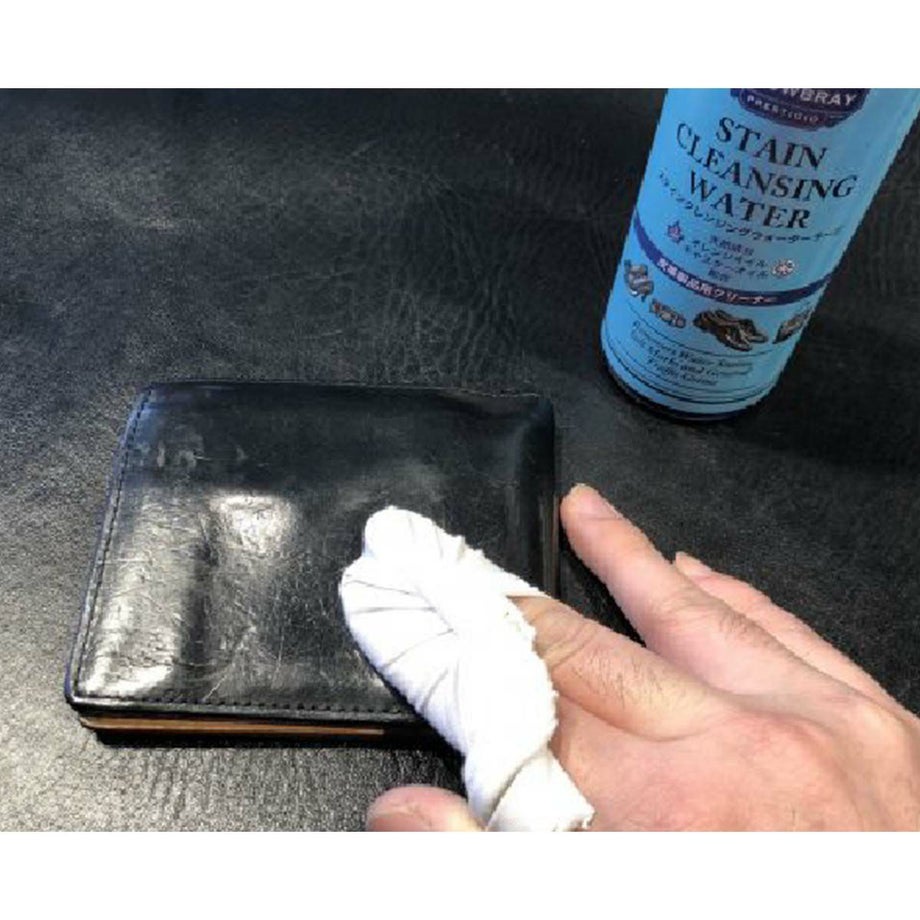 ・天然成分を配合した皮革製品用のステインクレンジングウオーター。・ソルベントフリー(=有機溶剤不使用)、天然成分(オレンジオイル・キャスターオイルなど)配合の皮革製品にやさしい汚れ落としです。・色落ちなどのリスクも軽減しているので、お手入れ初心者でも安心してお使いいただけます。・容器をよく振った後、やわらかい布に少量つけて、皮革製品の表面をやさしくなでて汚れを拭き取ります。・お手入れ用のブラシと組み合わせて使用すれば、泡立てながらよごれをかき出し、落とすことができます。用途スムースレザー(一般的な表革)素材の靴、かばん、ブーツ、コート、財布、手帳、家具、ベルトなどの皮革製品