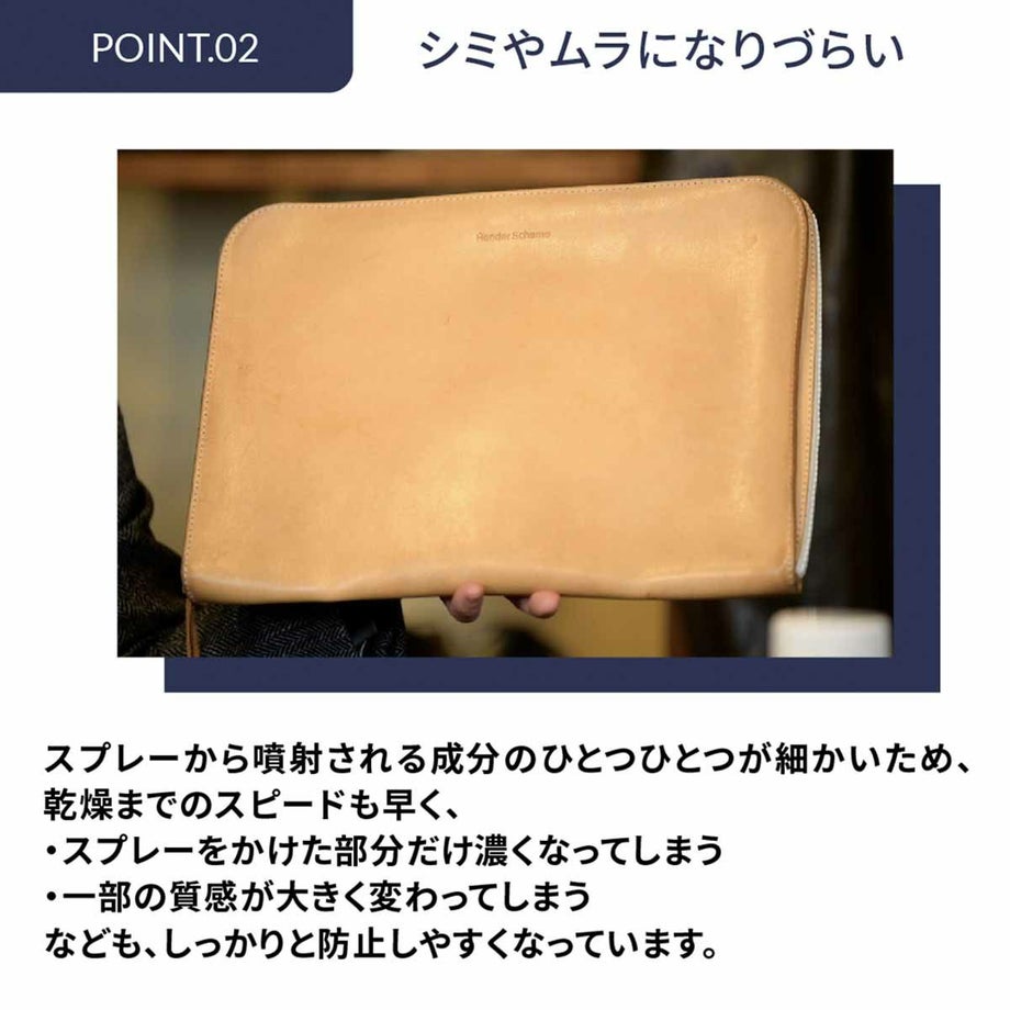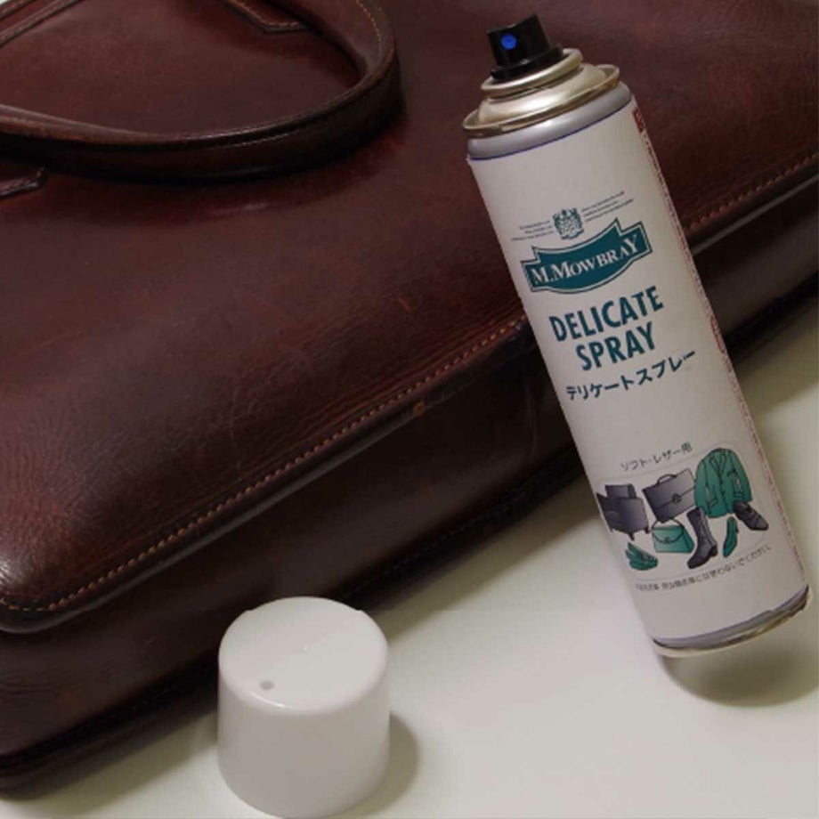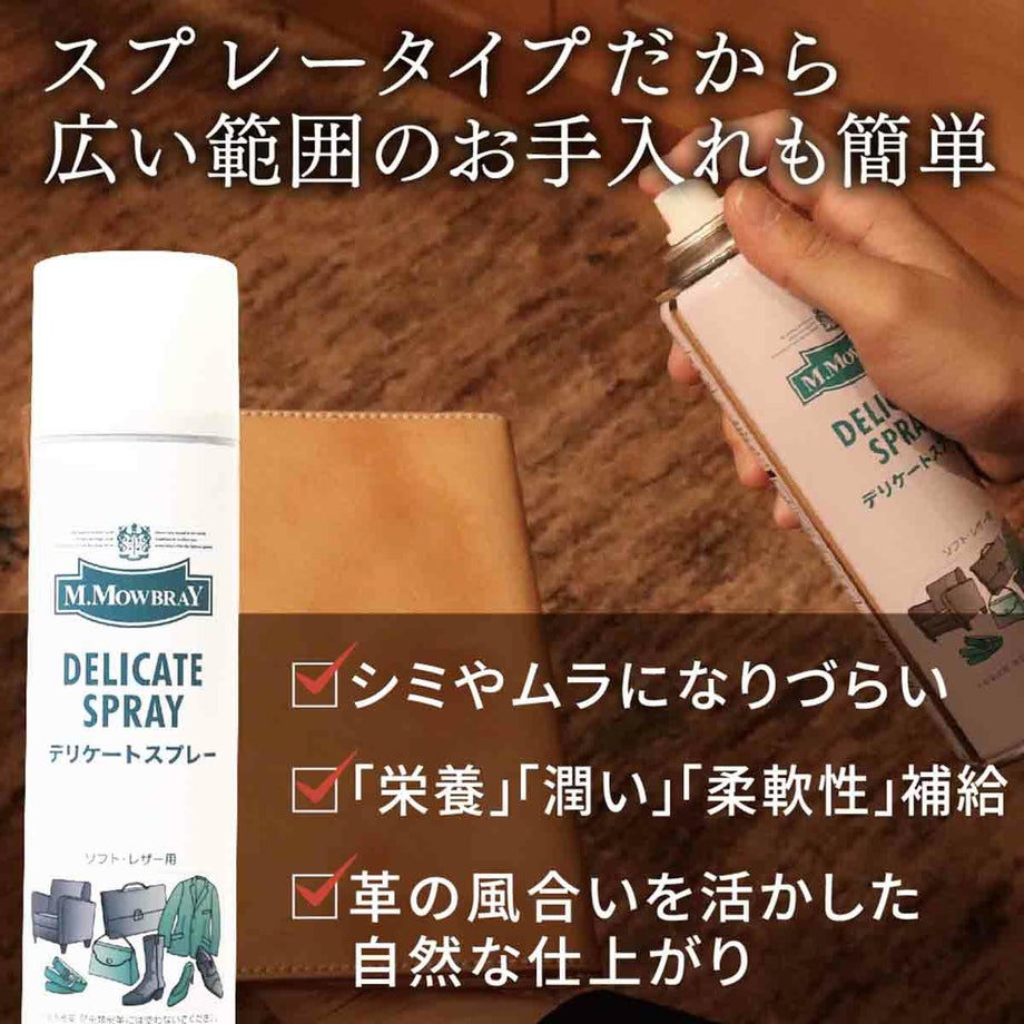 ・デリケートな革製品にも使いやすいように開発された革製品用のスプレー。・クリームでケアをするとシミやムラになりやすい、ヌメ革やシープレザー、スムースレザーのお手入れにも最適です。・スプレータイプなので広い範囲のお手入れも簡単にできます。・革製品の乾燥を防ぎ、栄養と潤いを与えます。・内容量 220ml